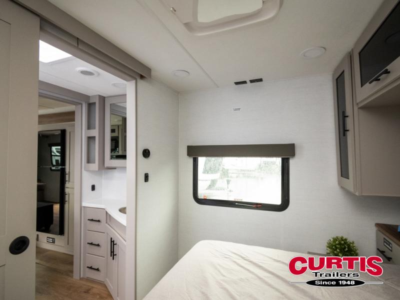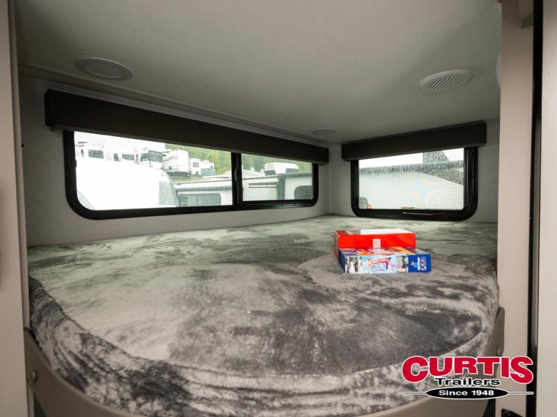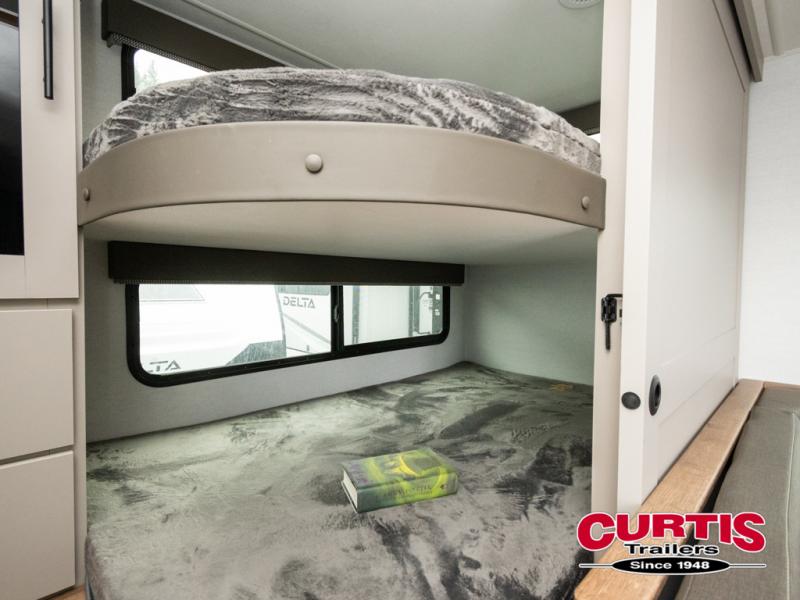 This Delta 291BH model offers a thoughtfully designed layout perfect for comfort and convenience on the road. At the front, you'll find a private bedroom featuring two nightstand wardrobes, and additional overhead storage for all your essentials. Moving through the walk-through bathroom, enjoy a 30" x 36" shower and a soft-close porcelain toilet with foot flush. The central living area is ideal for relaxing or entertaining, with a 68" theater seat that has the option to be a tri-fold sleeper sofa for added sleeping space if needed. Along with a L-shaped dinette, and a 36" ottoman, all centered around a 40" TV. At the rear we have, two 46" x 74" bunks with steps that provide extra-sleeping space and easy accessibility along with a wardrobe for added storage, making this RV perfect for families or group travel.