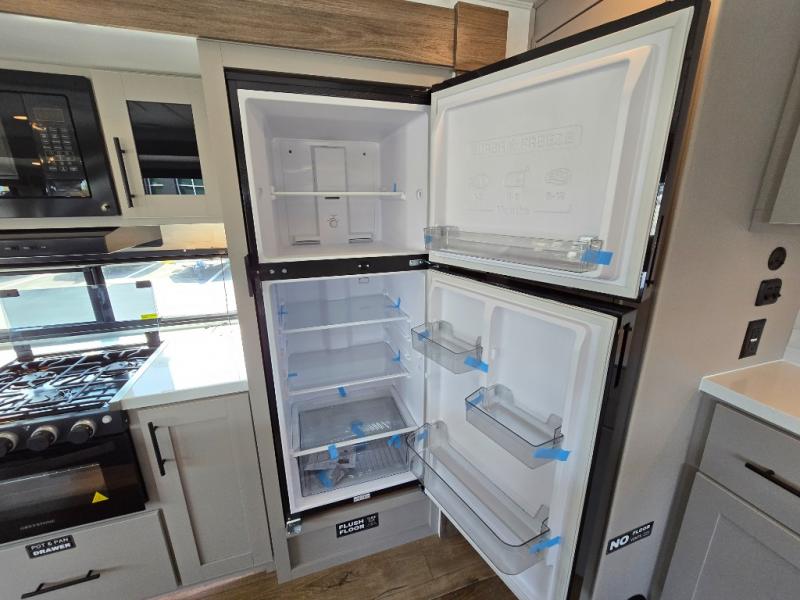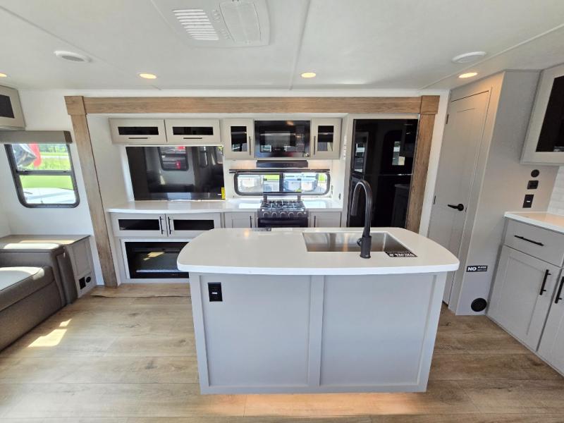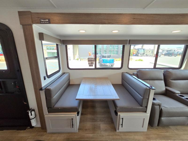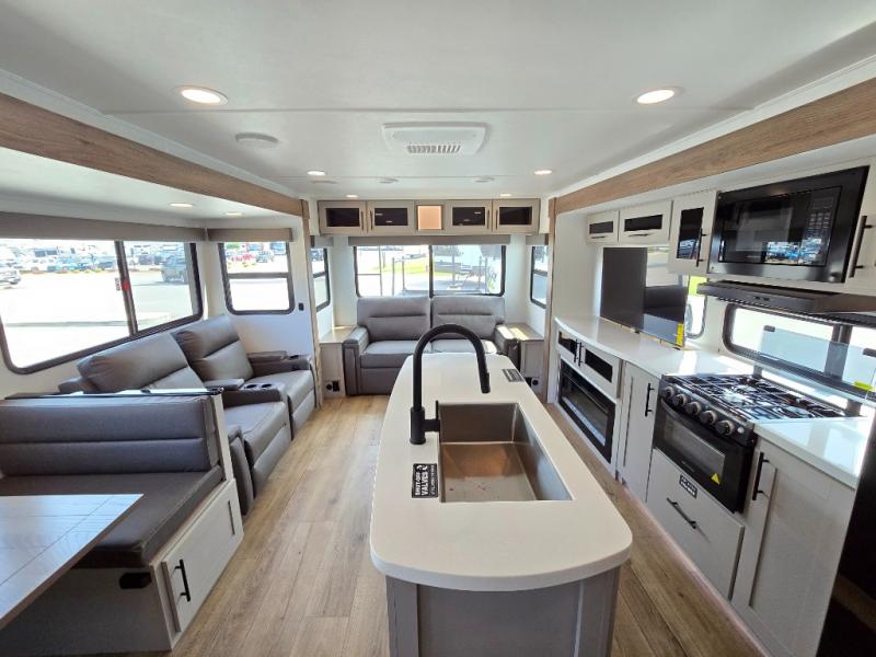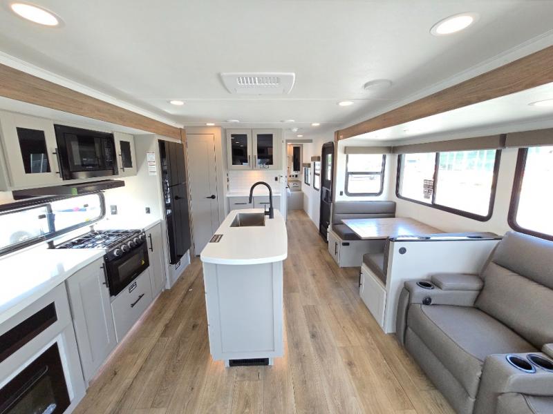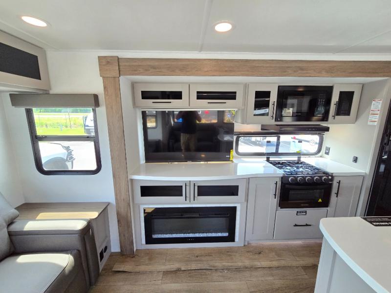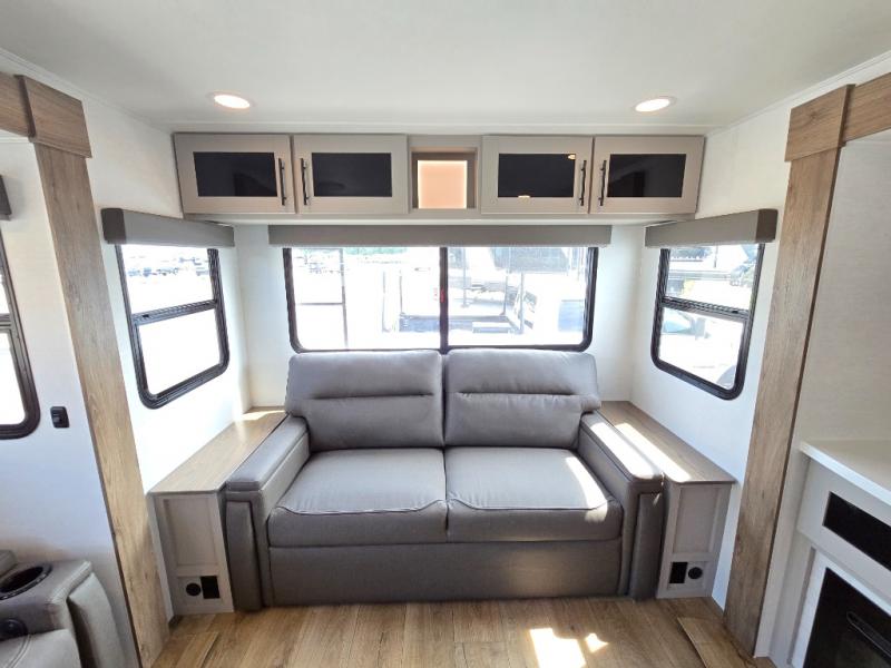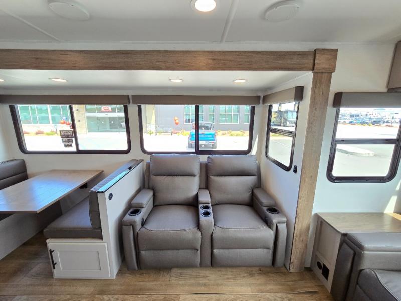 You will feel right at home camping in this travel trailer! The rear living area has a rear sofa and a set of theater seating conveniently across from the entertainment center with a 50" class HDTV above a pull-out fireplace storage for a cozy evening indoors. Prepare your best home cooked meals with the three burner cooktop, kitchen island which even has a tip-out trash can, and 10 cu. ft. 12V refrigerator. Enjoy your meals at the free standing dinette then either freshen up in the full bathroom with the 30" x 36" shower or head outside to relax under one of the two awnings. The front private bedroom has a queen bed for you to lay your head on at night and has wardrobe nightstands for your items!