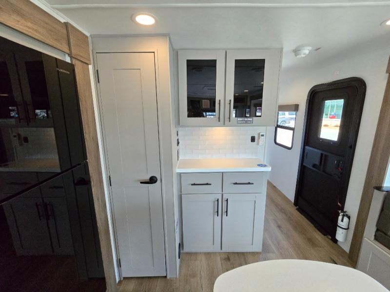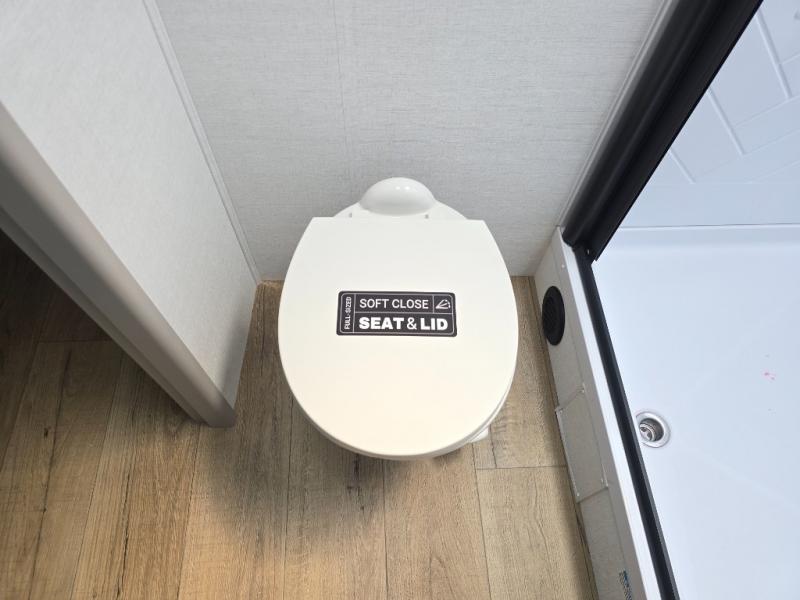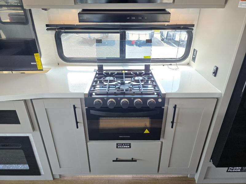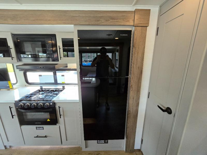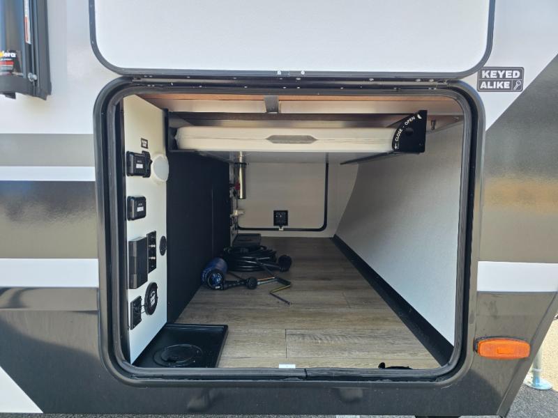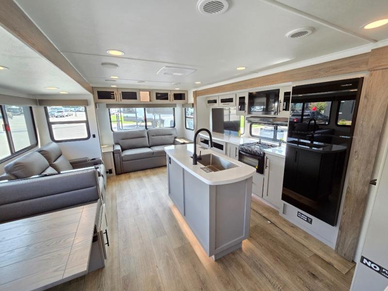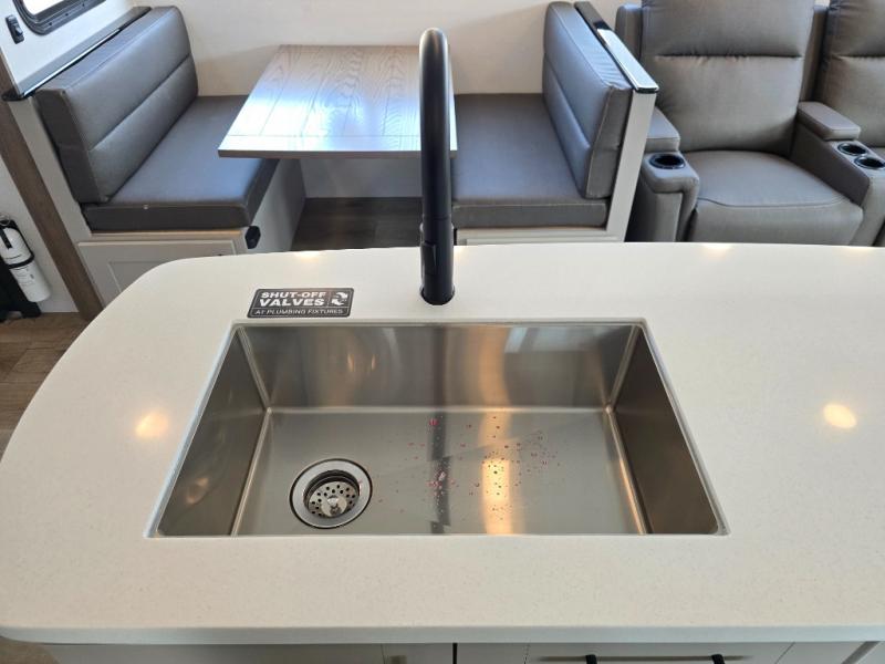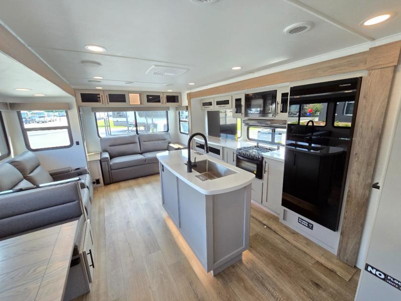You will feel right at home camping in this travel trailer! The rear living area has a rear sofa and a set of theater seating conveniently across from the entertainment center with a 50" class HDTV above a pull-out fireplace storage for a cozy evening indoors. Prepare your best home cooked meals with the three burner cooktop, kitchen island which even has a tip-out trash can, and 10 cu. ft. 12V refrigerator. Enjoy your meals at the free standing dinette then either freshen up in the full bathroom with the 30" x 36" shower or head outside to relax under one of the two awnings. The front private bedroom has a queen bed for you to lay your head on at night and has wardrobe nightstands for your items!