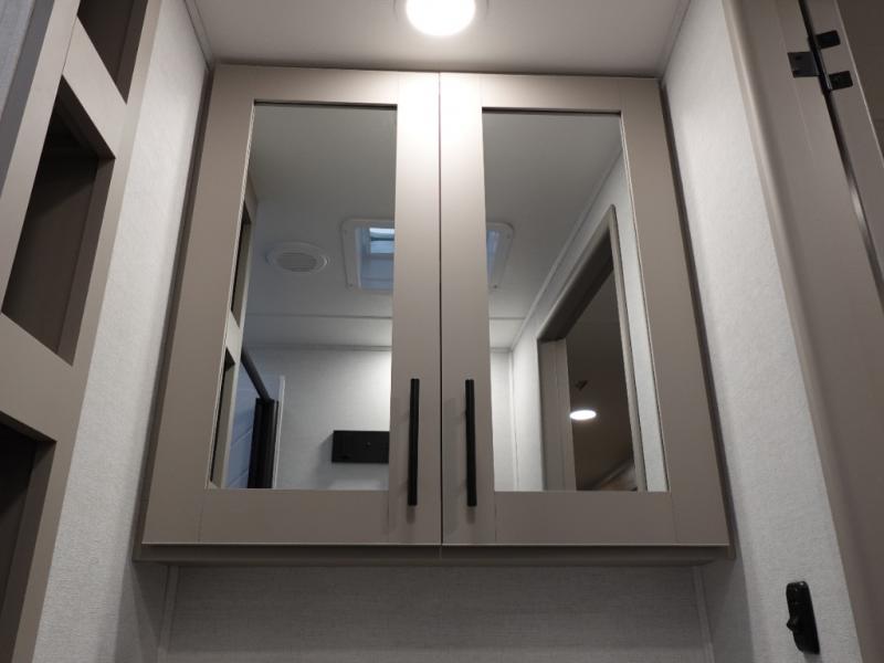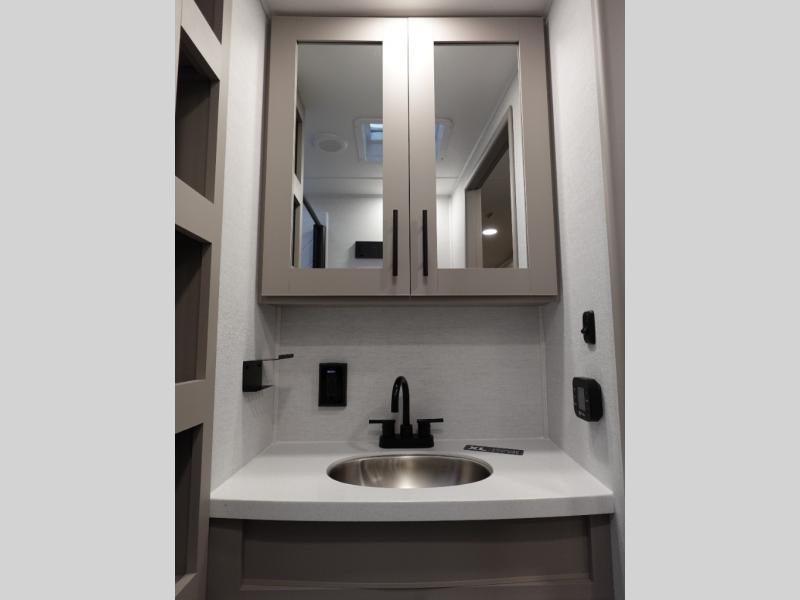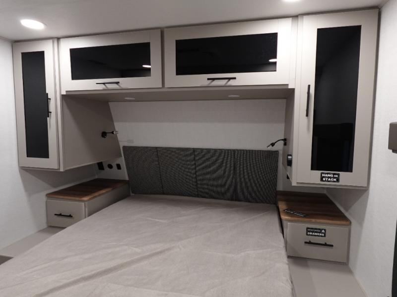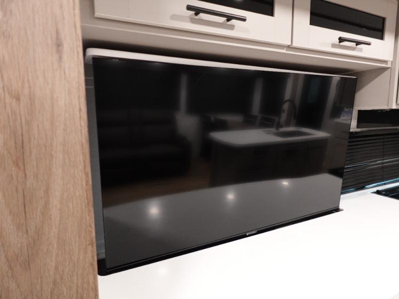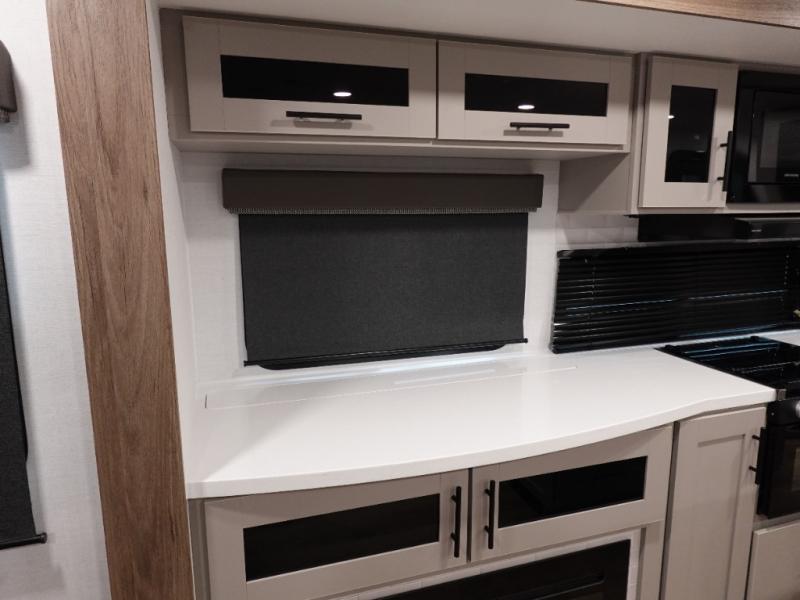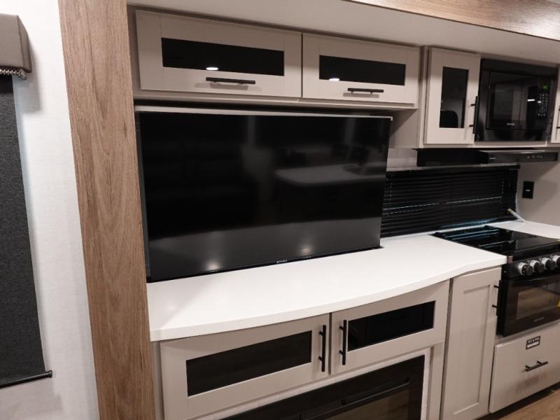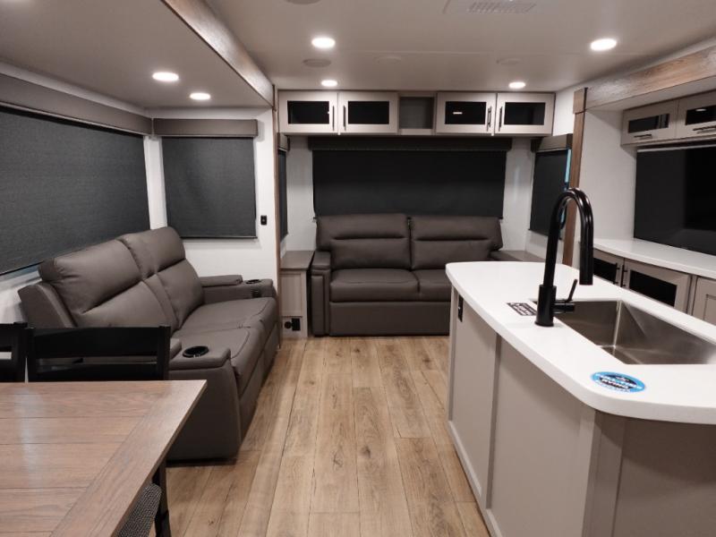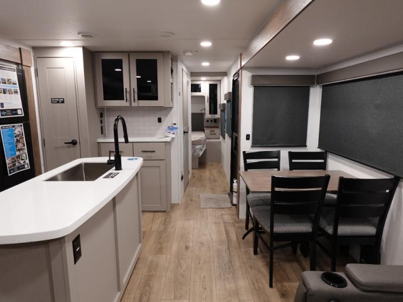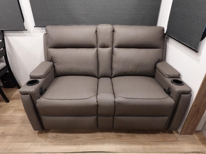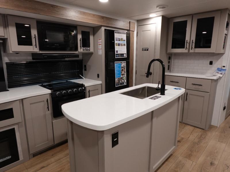 You will feel right at home camping in this travel trailer! The rear living area has a rear sofa and a set of theater seating conveniently across from the entertainment center with a 50" class HDTV above a pull-out fireplace storage for a cozy evening indoors. Prepare your best home cooked meals with the three burner cooktop, kitchen island which even has a tip-out trash can, and 10 cu. ft. 12V refrigerator. Enjoy your meals at the free standing dinette then either freshen up in the full bathroom with the 30" x 36" shower or head outside to relax under one of the two awnings. The front private bedroom has a queen bed for you to lay your head on at night and has wardrobe nightstands for your items!
