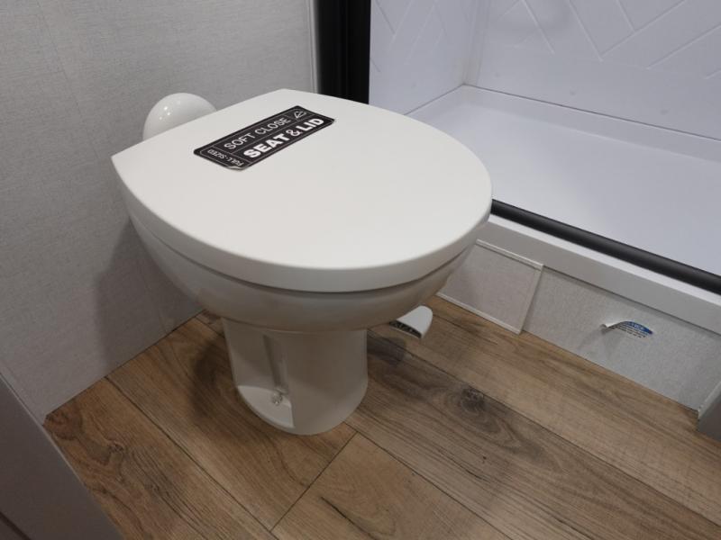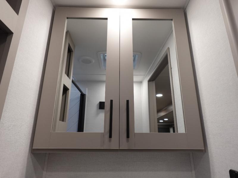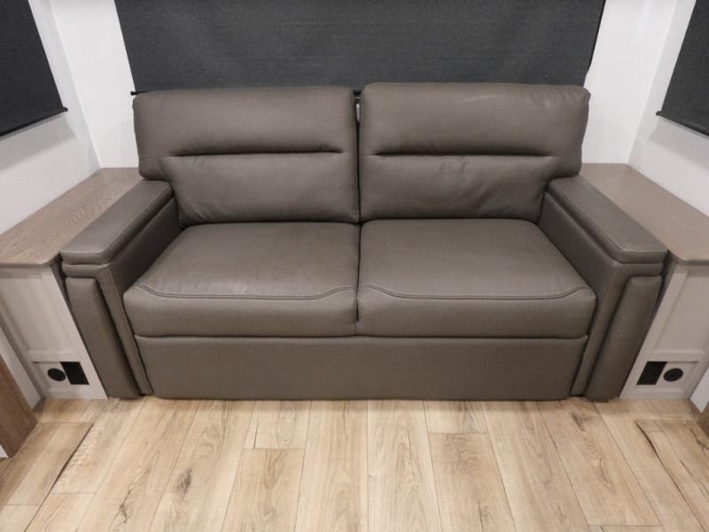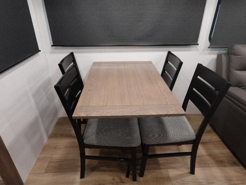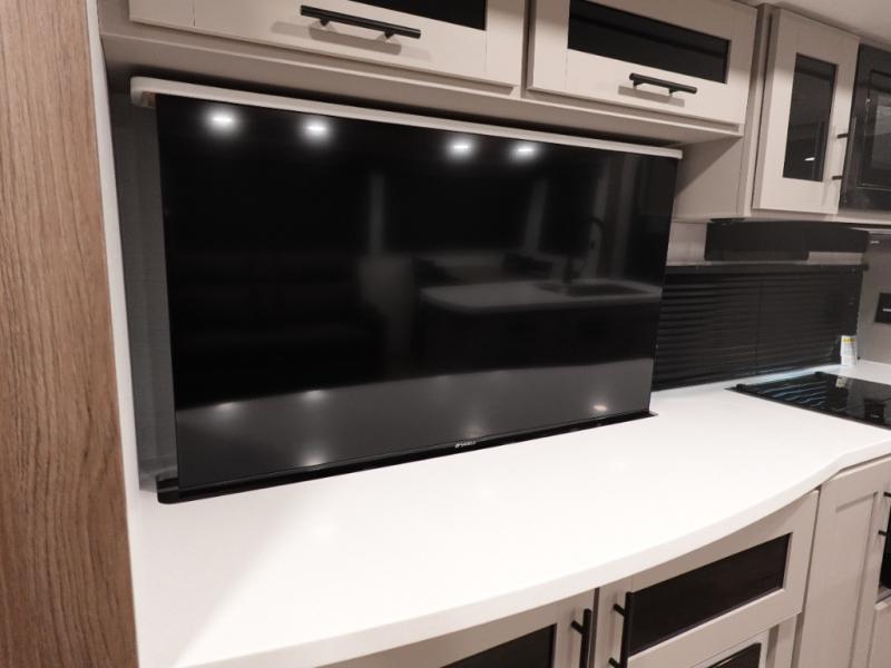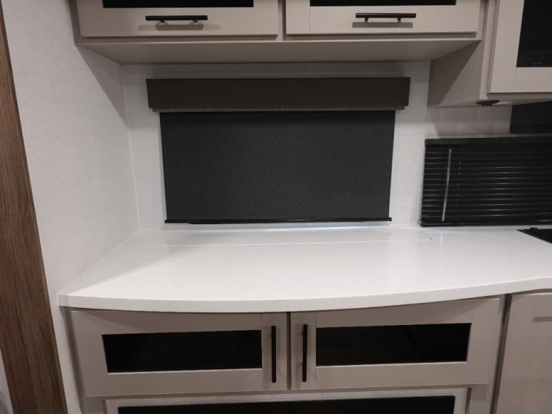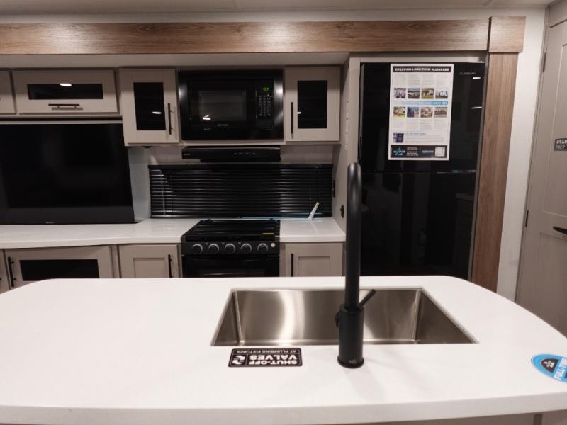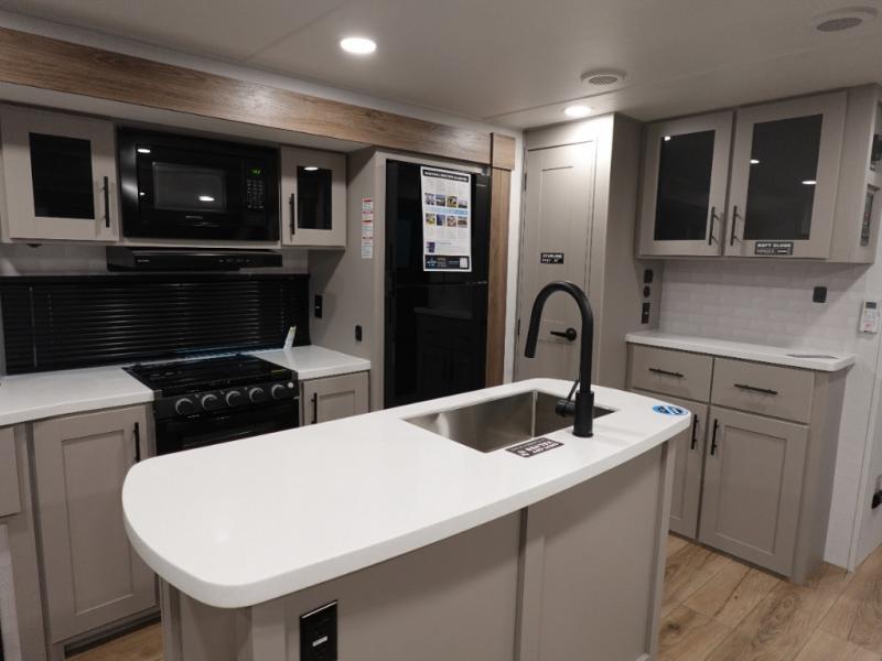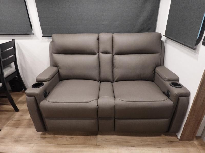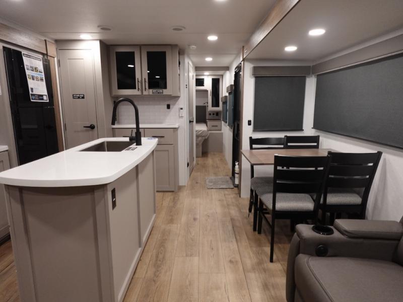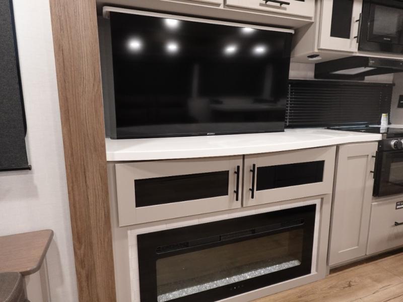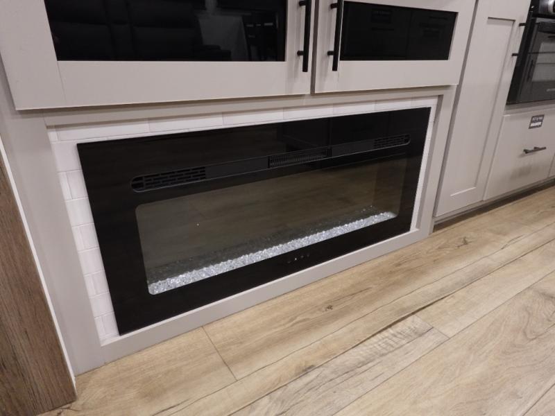 You will feel right at home camping in this travel trailer! The rear living area has a rear sofa and a set of theater seating conveniently across from the entertainment center with a 50" class HDTV above a pull-out fireplace storage for a cozy evening indoors. Prepare your best home cooked meals with the three burner cooktop, kitchen island which even has a tip-out trash can, and 10 cu. ft. 12V refrigerator. Enjoy your meals at the free standing dinette then either freshen up in the full bathroom with the 30" x 36" shower or head outside to relax under one of the two awnings. The front private bedroom has a queen bed for you to lay your head on at night and has wardrobe nightstands for your items!