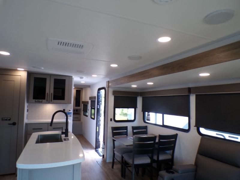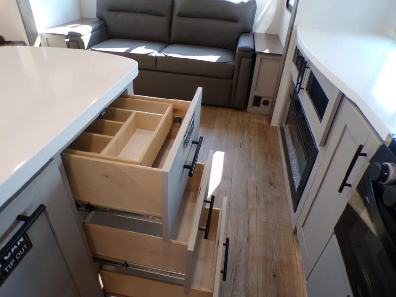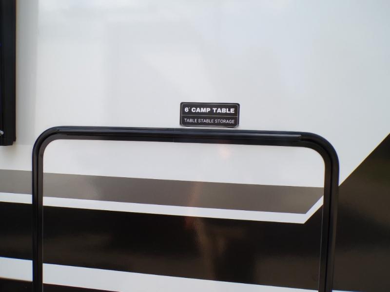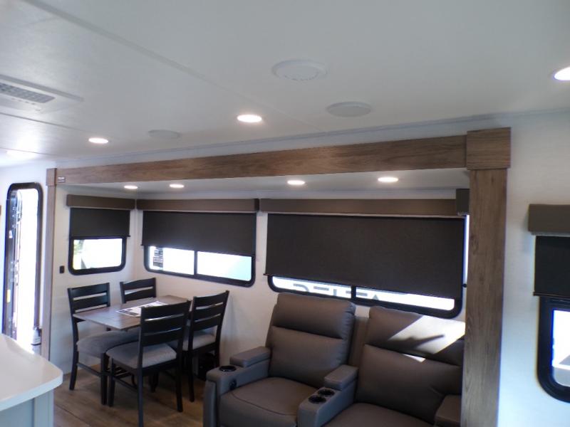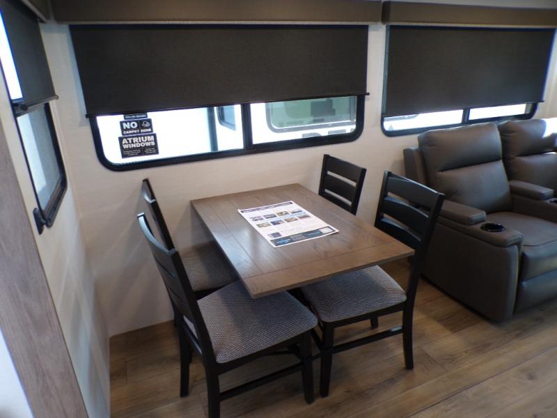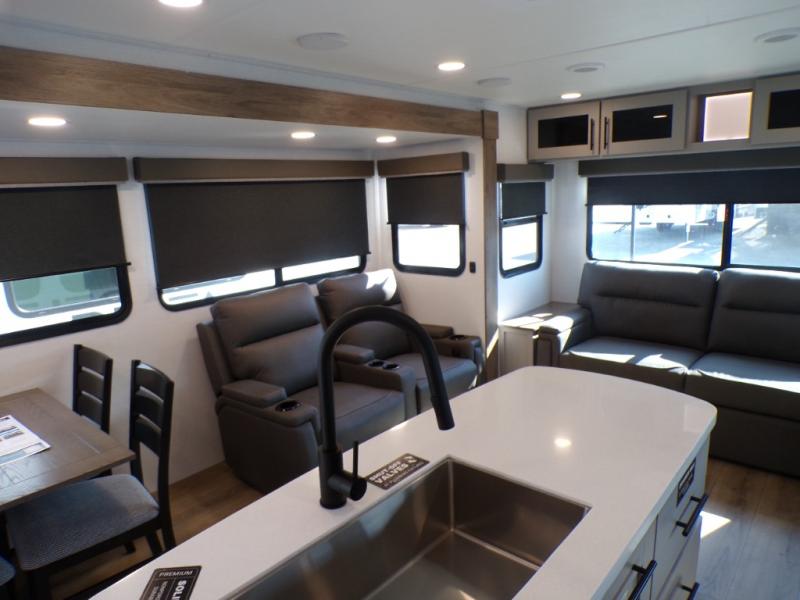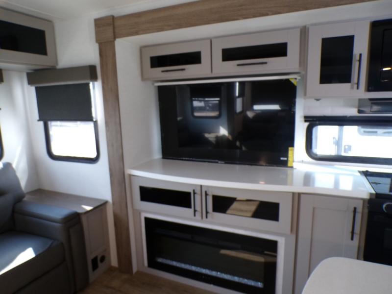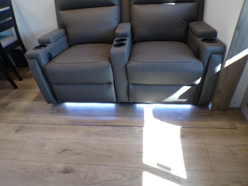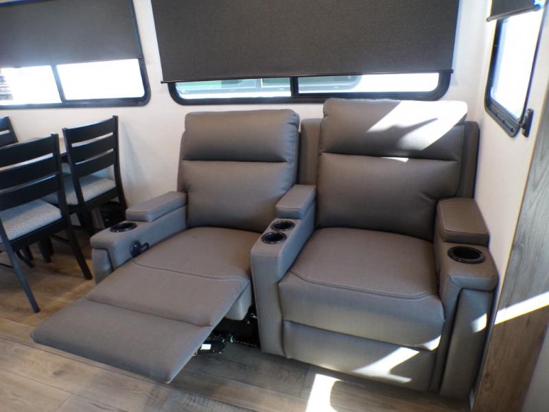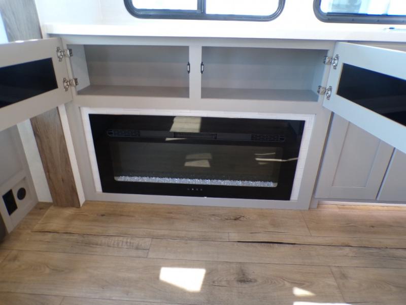You will feel right at home camping in this travel trailer! The rear living area has a rear sofa and a set of theater seating conveniently across from the entertainment center with a 50" class HDTV above a pull-out fireplace storage for a cozy evening indoors. Prepare your best home cooked meals with the three burner cooktop, kitchen island which even has a tip-out trash can, and 10 cu. ft. 12V refrigerator. Enjoy your meals at the free standing dinette then either freshen up in the full bathroom with the 30" x 36" shower or head outside to relax under one of the two awnings. The front private bedroom has a queen bed for you to lay your head on at night and has wardrobe nightstands for your items!