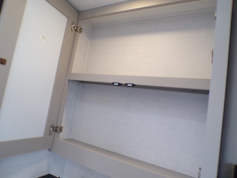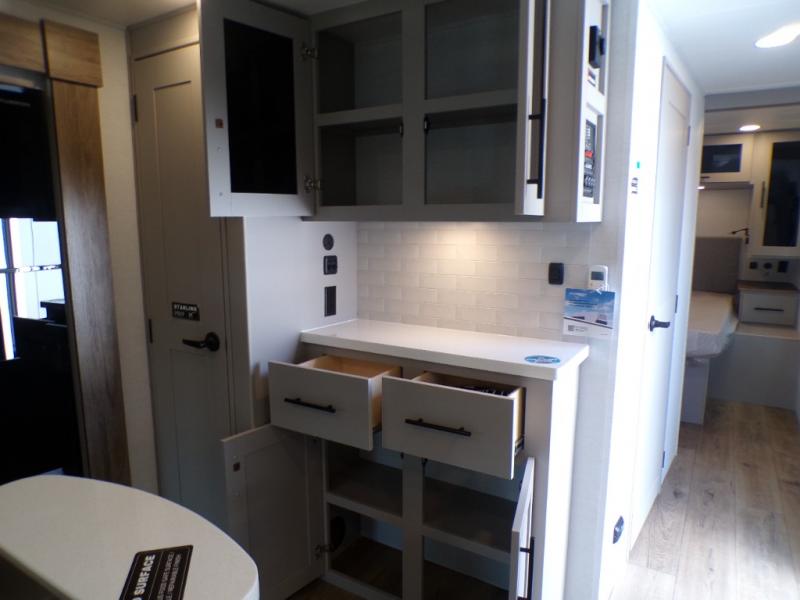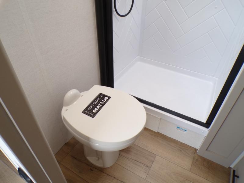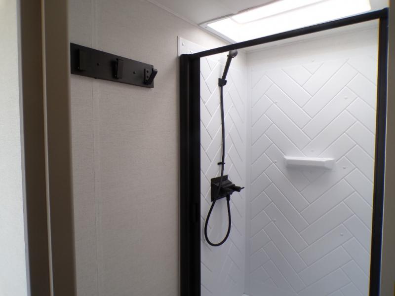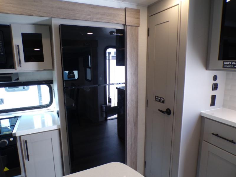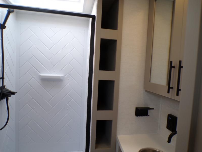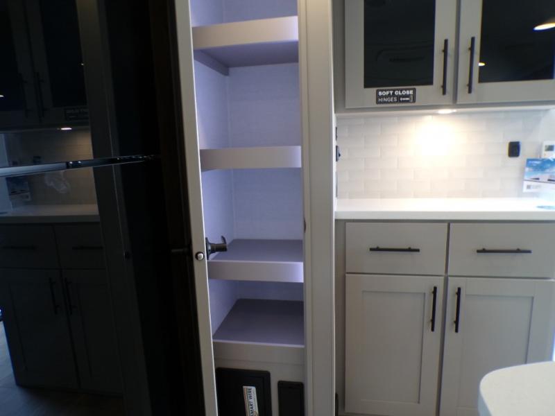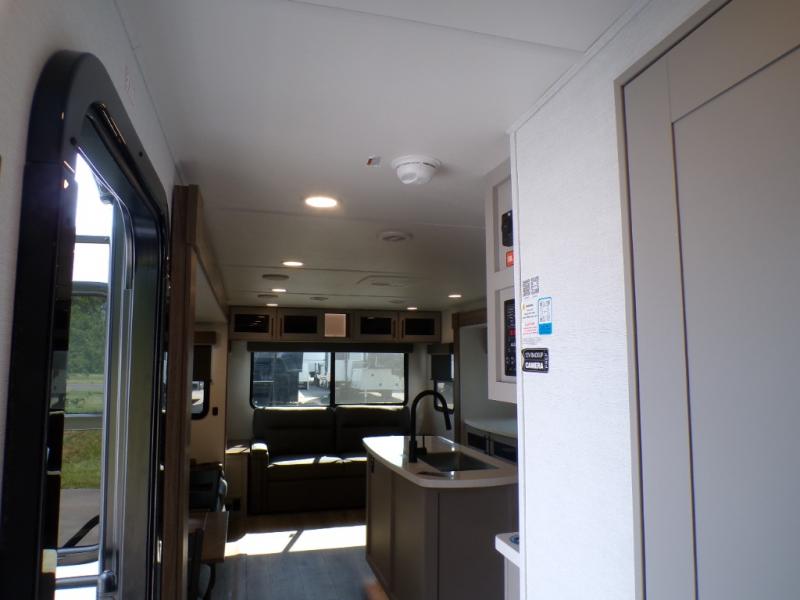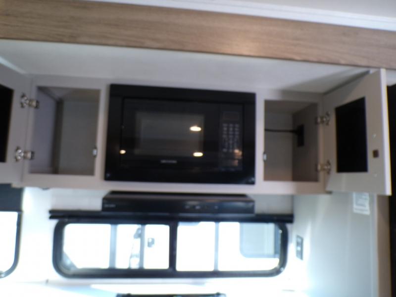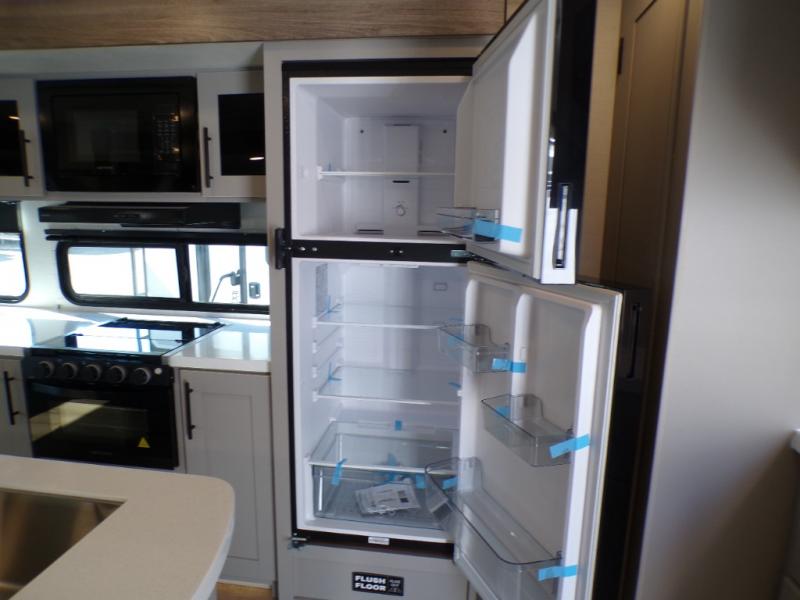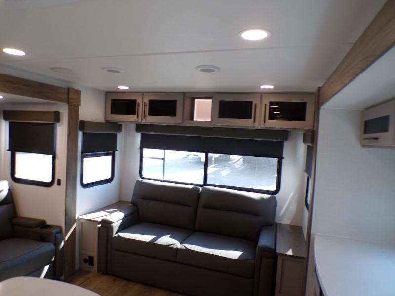 You will feel right at home camping in this travel trailer! The rear living area has a rear sofa and a set of theater seating conveniently across from the entertainment center with a 50" class HDTV above a pull-out fireplace storage for a cozy evening indoors. Prepare your best home cooked meals with the three burner cooktop, kitchen island which even has a tip-out trash can, and 10 cu. ft. 12V refrigerator. Enjoy your meals at the free standing dinette then either freshen up in the full bathroom with the 30" x 36" shower or head outside to relax under one of the two awnings. The front private bedroom has a queen bed for you to lay your head on at night and has wardrobe nightstands for your items!