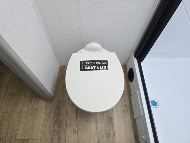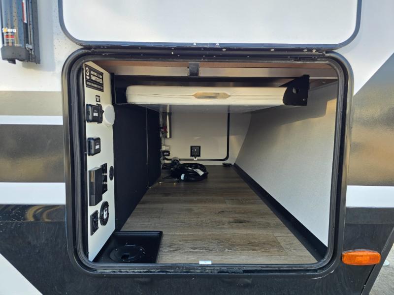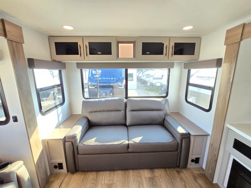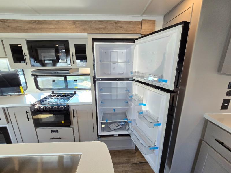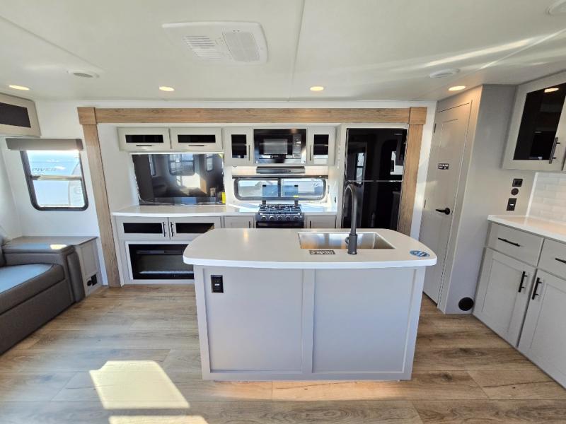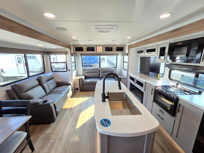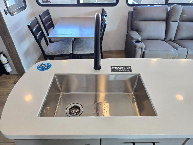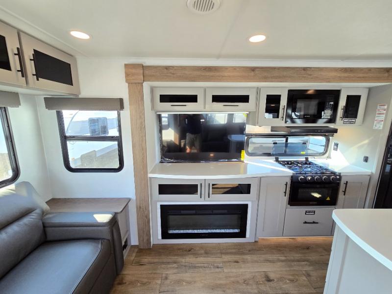 You will feel right at home camping in this travel trailer! The rear living area has a rear sofa and a set of theater seating conveniently across from the entertainment center with a 50" class HDTV above a pull-out fireplace storage for a cozy evening indoors. Prepare your best home cooked meals with the three burner cooktop, kitchen island which even has a tip-out trash can, and 10 cu. ft. 12V refrigerator. Enjoy your meals at the free standing dinette then either freshen up in the full bathroom with the 30" x 36" shower or head outside to relax under one of the two awnings. The front private bedroom has a queen bed for you to lay your head on at night and has wardrobe nightstands for your items!