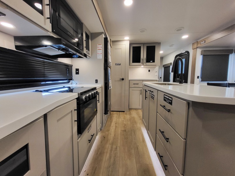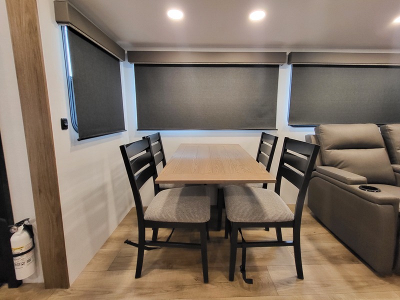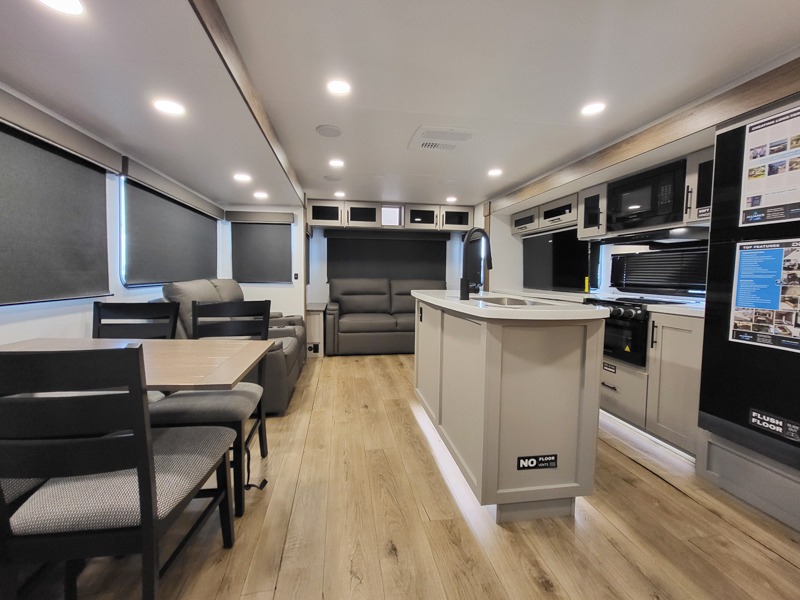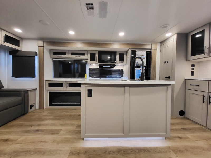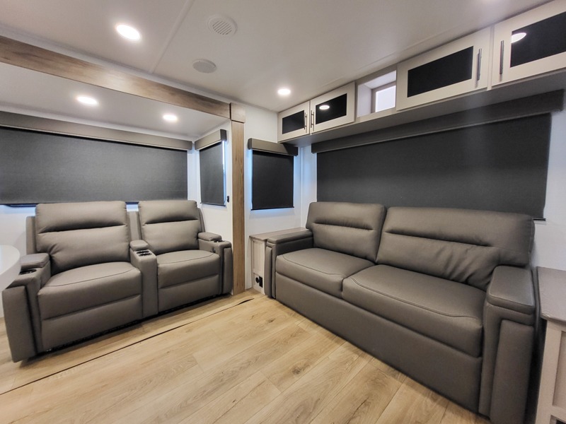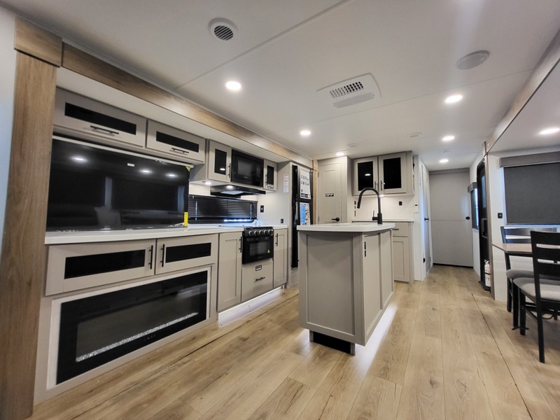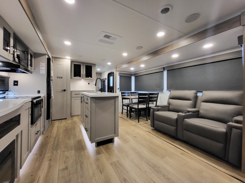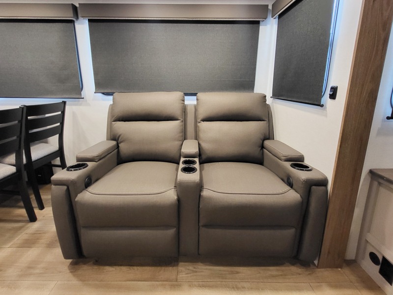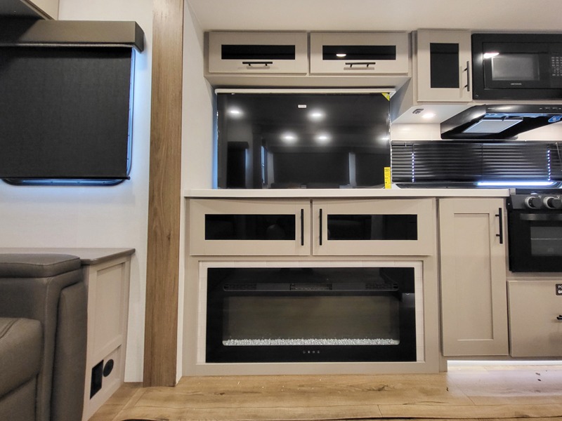 You will feel right at home camping in this travel trailer! The rear living area has a rear sofa and a set of theater seating conveniently across from the entertainment center with a 50" class HDTV above a pull-out fireplace storage for a cozy evening indoors. Prepare your best home cooked meals with the three burner cooktop, kitchen island which even has a tip-out trash can, and 10 cu. ft. 12V refrigerator. Enjoy your meals at the free standing dinette then either freshen up in the full bathroom with the 30" x 36" shower or head outside to relax under one of the two awnings. The front private bedroom has a queen bed for you to lay your head on at night and has wardrobe nightstands for your items!
