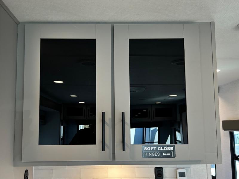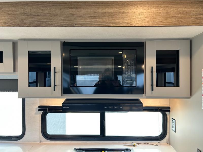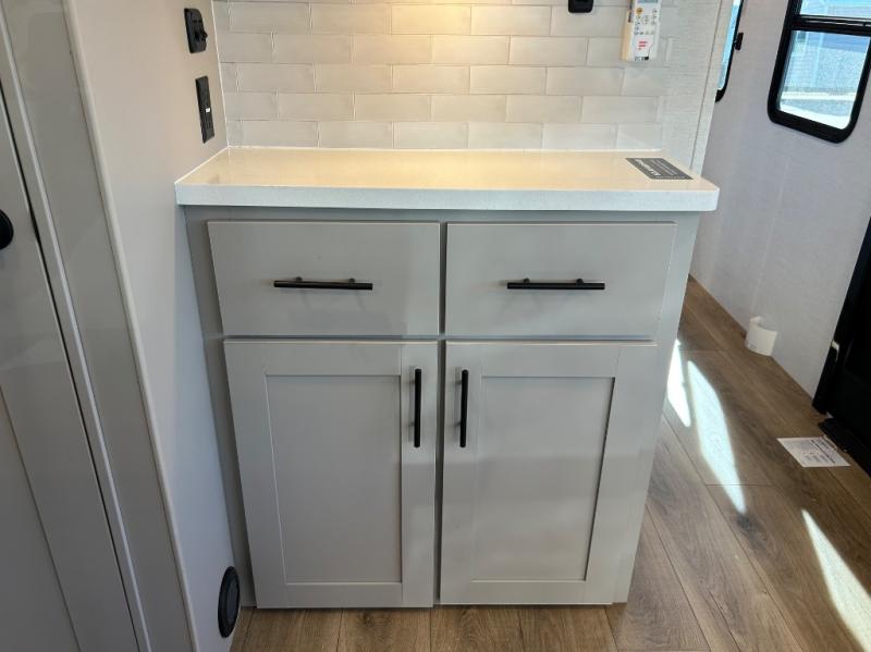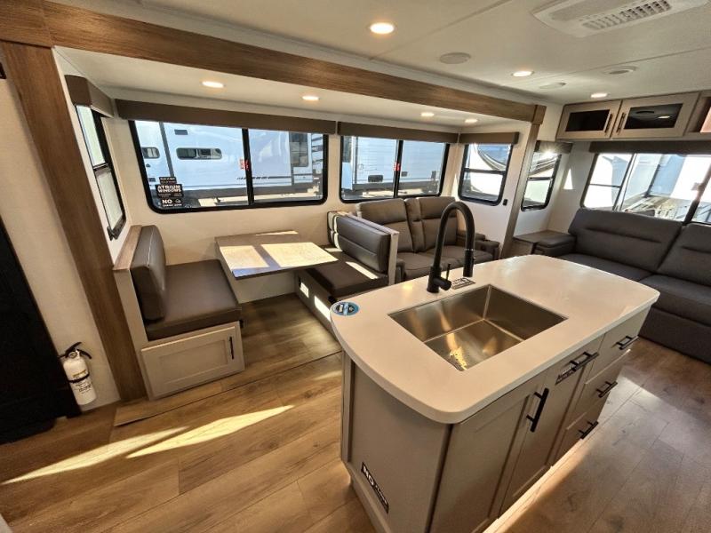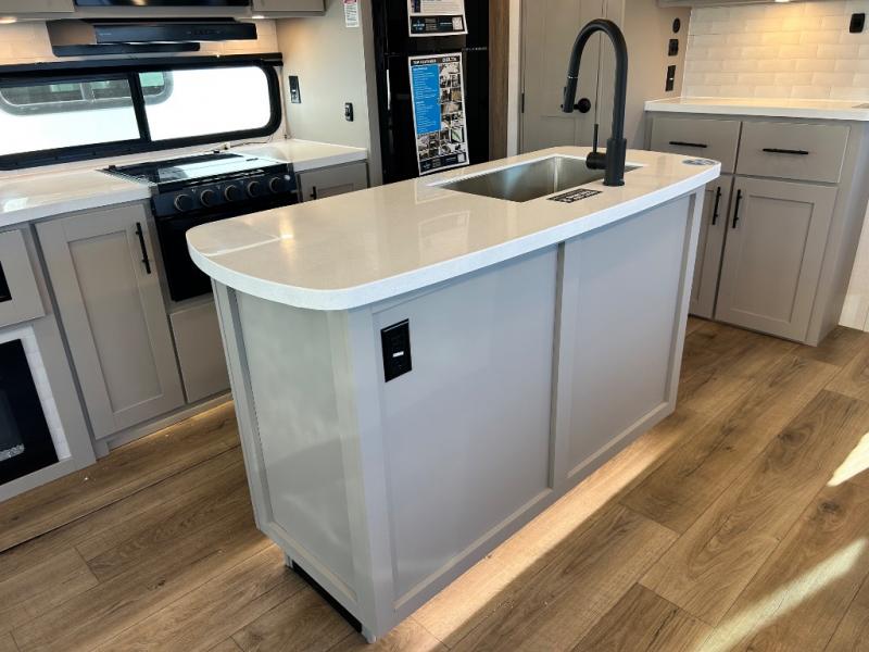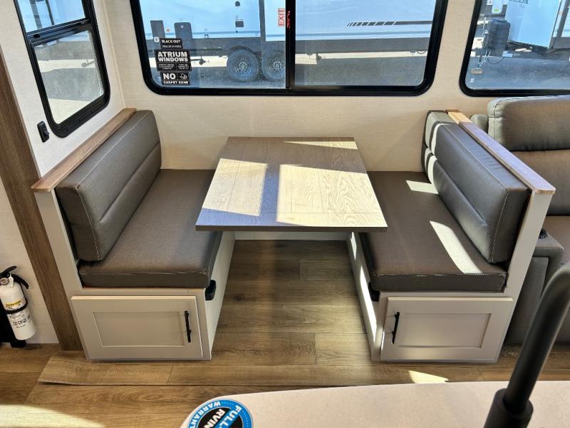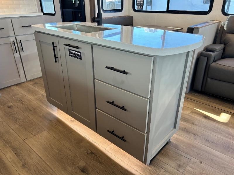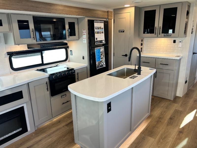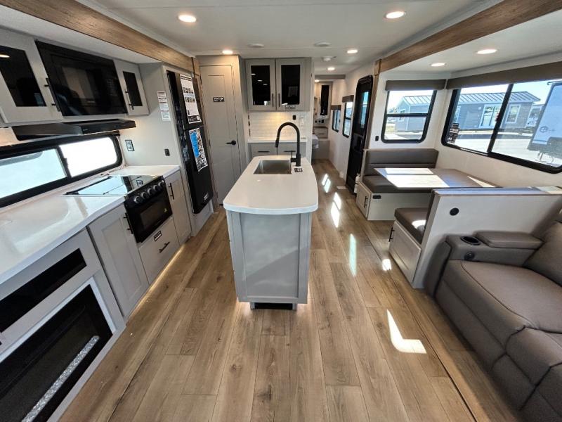 You will feel right at home camping in this travel trailer! The rear living area has a rear sofa and a set of theater seating conveniently across from the entertainment center with a 50" TV above a fireplace for a cozy evening indoors. Prepare your best home cooked meals with the three burner cooktop, kitchen island which even has a tip-out trash can, and 10 cu. ft. 12V refrigerator. Enjoy your meals at the dinette booth that can also be changed to a free standing dinette as an option then either freshen up in the full bathroom with the 30" x 36" shower or head outside to relax under one of the two awnings. The front private bedroom has a queen bed for you to lay your head on at night and has wardrobe nightstands for your items!