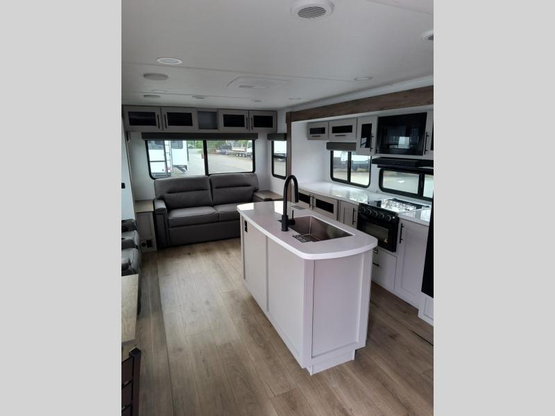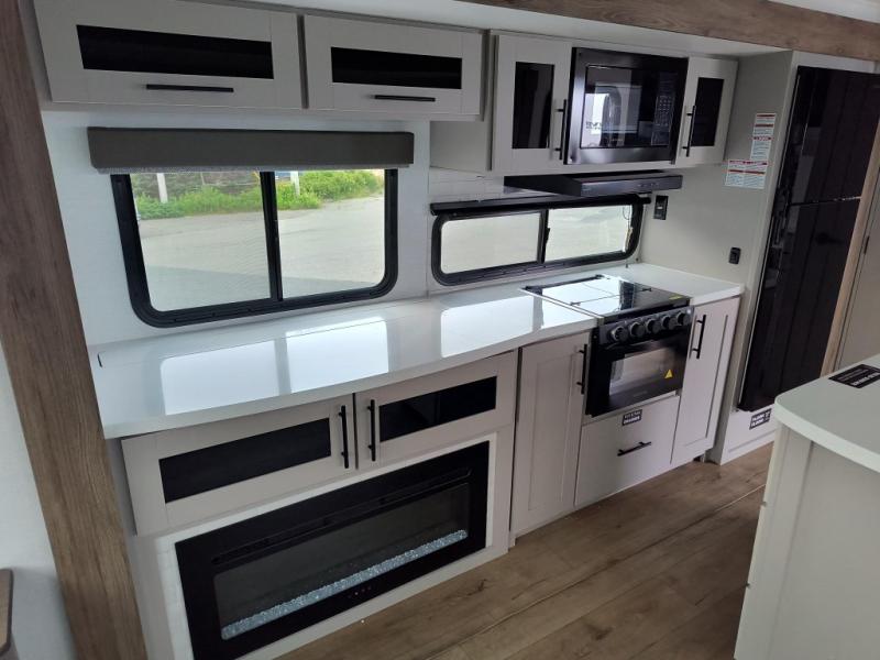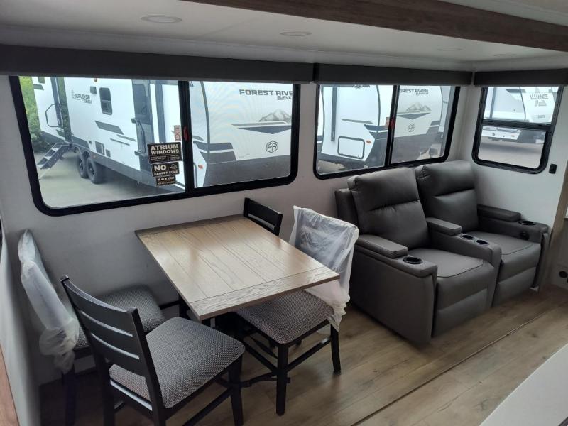 You will feel right at home camping in this travel trailer! The rear living area has a rear sofa and a set of theater seating conveniently across from the entertainment center with a 50" TV above a fireplace for a cozy evening indoors. Prepare your best home cooked meals with the three burner cooktop, kitchen island which even has a tip-out trash can, and 10 cu. ft. 12V refrigerator. Enjoy your meals at the dinette booth that can also be changed to a free standing dinette as an option then either freshen up in the full bathroom with the 30" x 36" shower or head outside to relax under one of the two awnings. The front private bedroom has a queen bed for you to lay your head on at night and has wardrobe nightstands for your items!