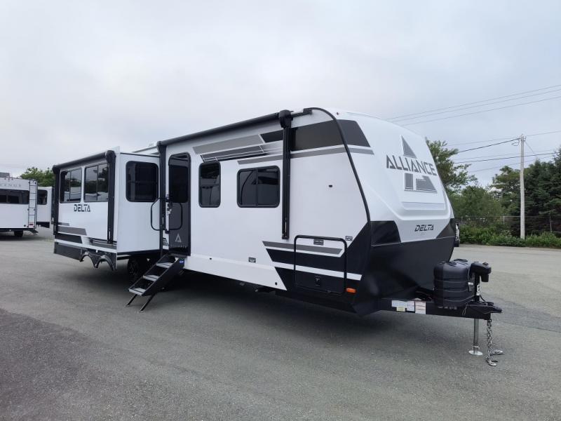 Form and function work together with every one of these Alliance RV Delta travel trailers! They are built with a walk-on roof with a seamless PVC roof covering, Mylar reinforced exterior seals, and a heated and enclosed underbelly to protect your unit. The commercial grade vinyl flooring will be easy to clean, and the oversized atrium windows throughout let in plenty of natural sunlight. With 62 cu. ft. of drop frame pass-through storage, you can bring along all of your essential camping gear plus it has USB charging for more convenience. There are many at home interior conveniences including a Bluetooth speaker, USB charging throughout, and even a pull-out kitchen trash can. Come find your favorite model today!