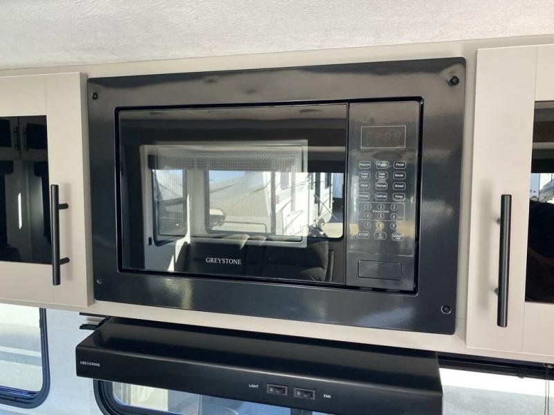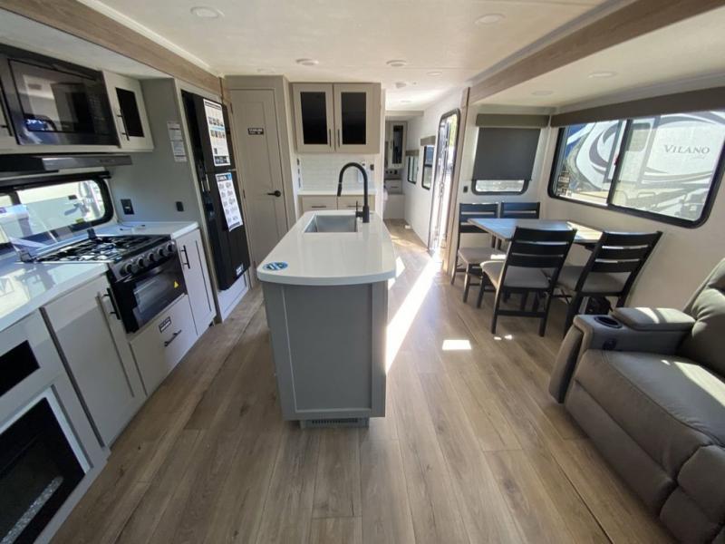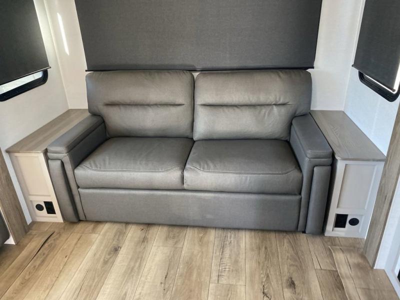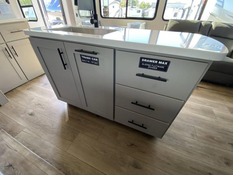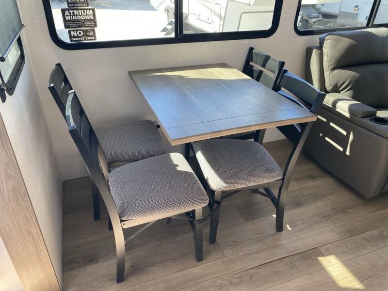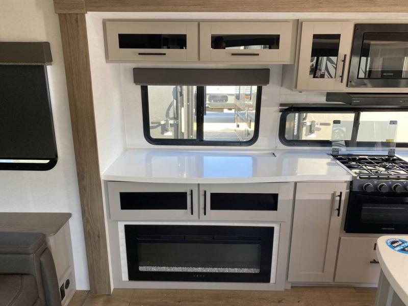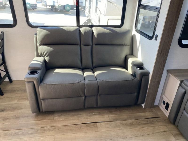 You will feel right at home camping in this travel trailer! The rear living area has a rear sofa and a set of theater seating conveniently across from the entertainment center with a 50" TV above a fireplace for a cozy evening indoors. Prepare your best home cooked meals with the three burner cooktop, kitchen island which even has a tip-out trash can, and 10 cu. ft. 12V refrigerator. Enjoy your meals at the dinette booth that can also be changed to a free standing dinette as an option then either freshen up in the full bathroom with the 30" x 36" shower or head outside to relax under one of the two awnings. The front private bedroom has a queen bed for you to lay your head on at night and has wardrobe nightstands for your items!