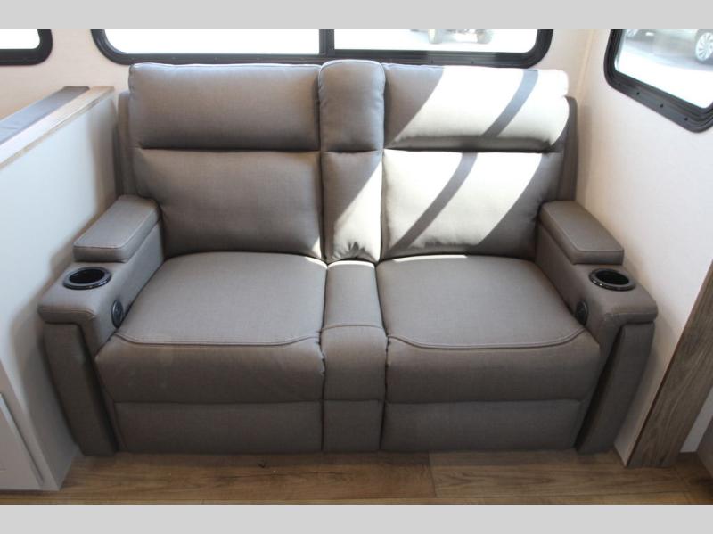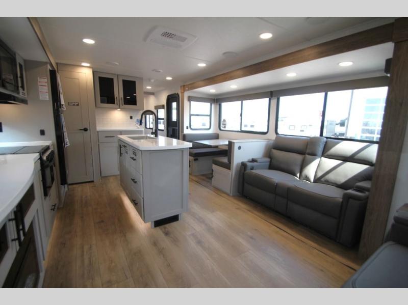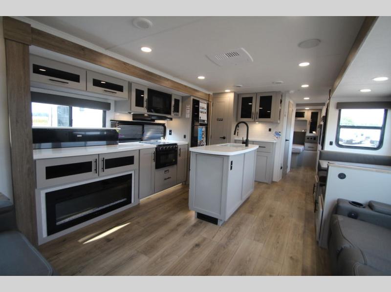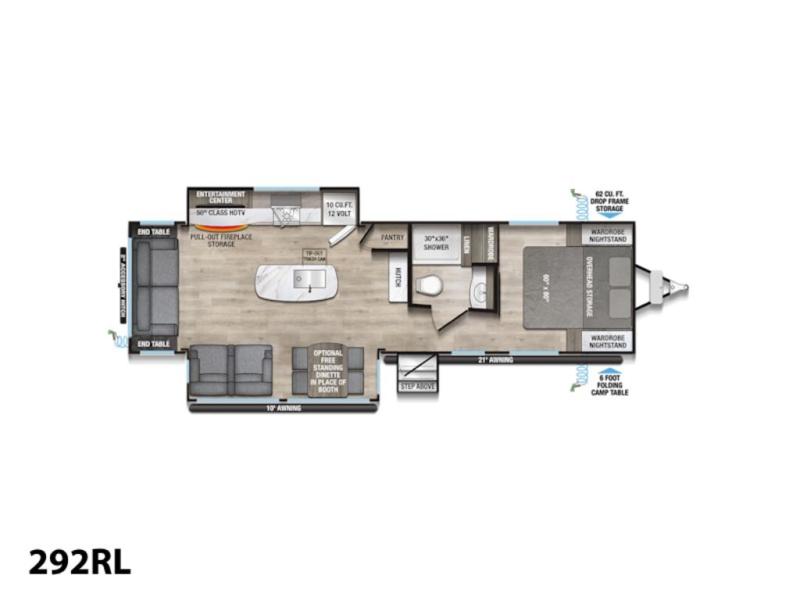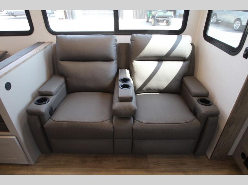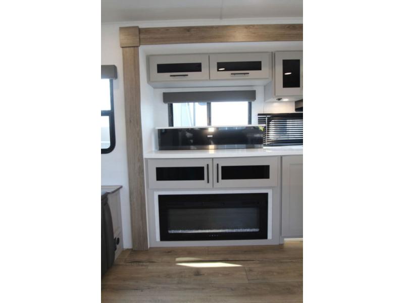 You will feel right at home camping in this travel trailer! The rear living area has a rear sofa and a set of theater seating conveniently across from the entertainment center with a 50" TV above a fireplace for a cozy evening indoors. Prepare your best home cooked meals with the three burner cooktop, kitchen island which even has a tip-out trash can, and 10 cu. ft. 12V refrigerator. Enjoy your meals at the dinette booth that can also be changed to a free standing dinette as an option then either freshen up in the full bathroom with the 30" x 36" shower or head outside to relax under one of the two awnings. The front private bedroom has a queen bed for you to lay your head on at night and has wardrobe nightstands for your items!