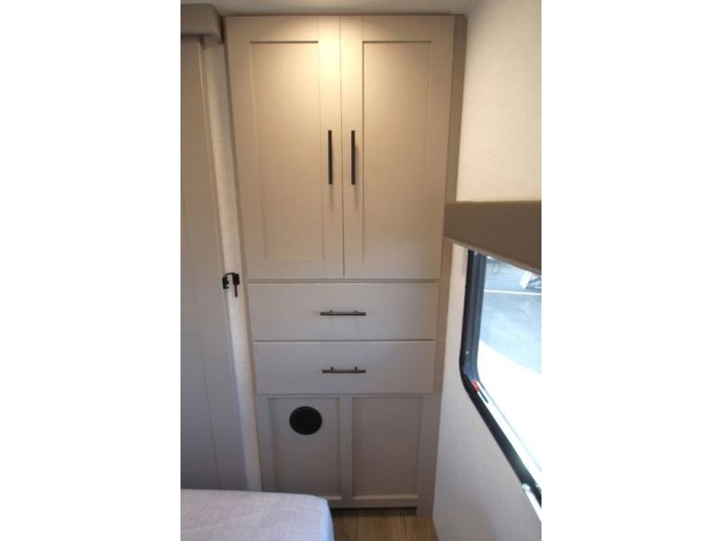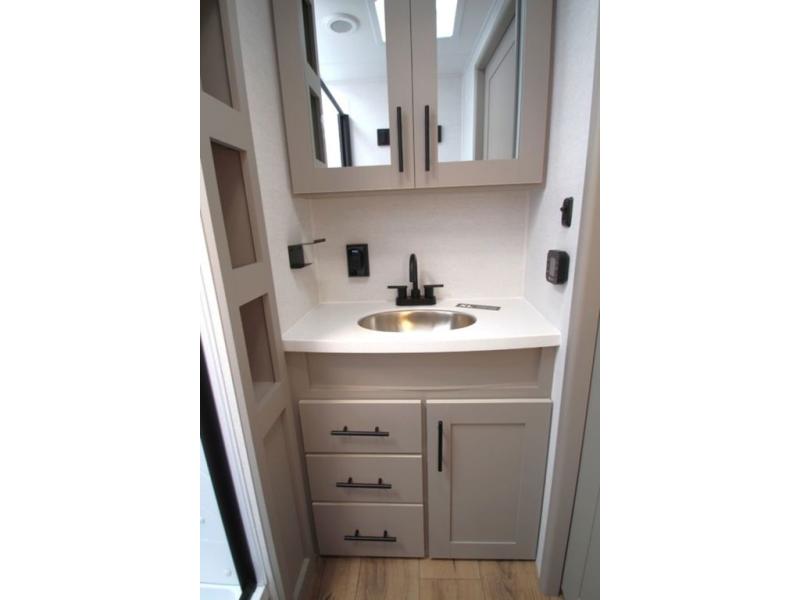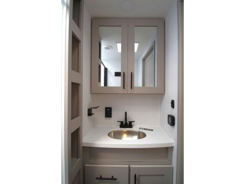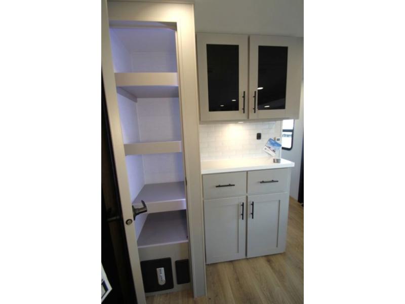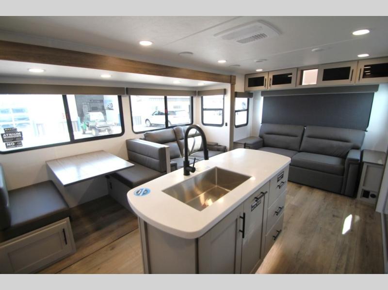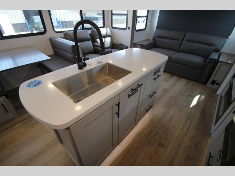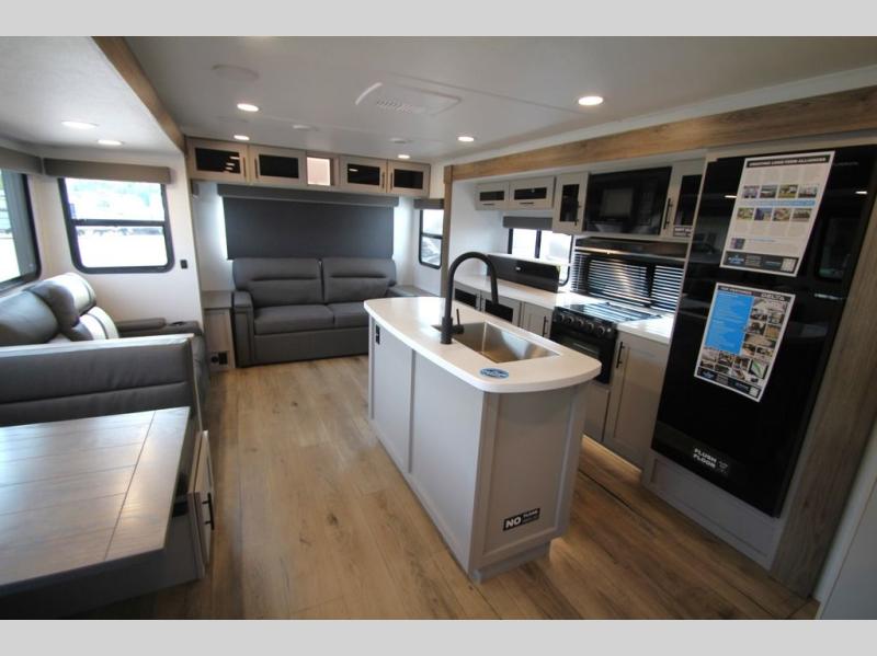 You will feel right at home camping in this travel trailer! The rear living area has a rear sofa and a set of theater seating conveniently across from the entertainment center with a 50" TV above a fireplace for a cozy evening indoors. Prepare your best home cooked meals with the three burner cooktop, kitchen island which even has a tip-out trash can, and 10 cu. ft. 12V refrigerator. Enjoy your meals at the dinette booth that can also be changed to a free standing dinette as an option then either freshen up in the full bathroom with the 30" x 36" shower or head outside to relax under one of the two awnings. The front private bedroom has a queen bed for you to lay your head on at night and has wardrobe nightstands for your items!