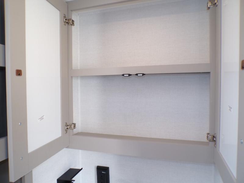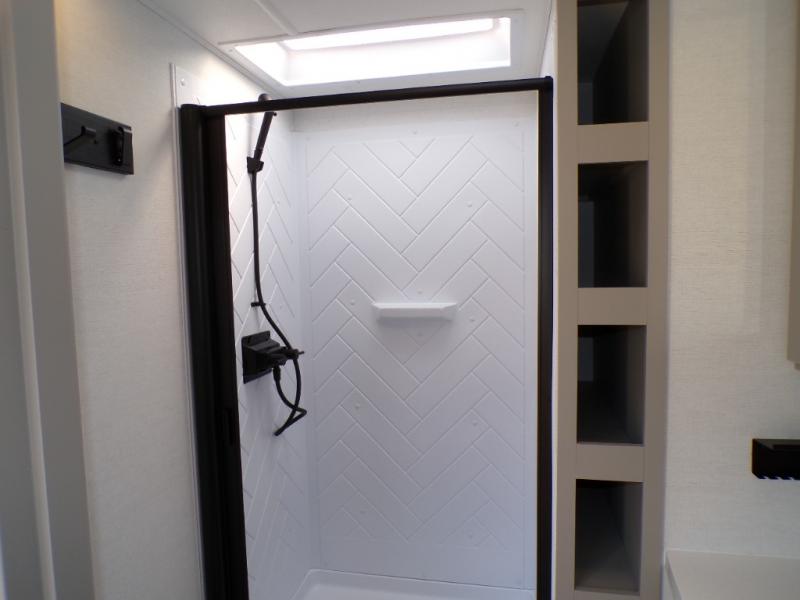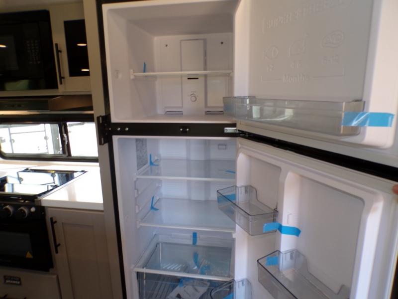 You will feel right at home camping in this travel trailer! The rear living area has a rear sofa and a set of theater seating conveniently across from the entertainment center with a 50" TV above a fireplace for a cozy evening indoors. Prepare your best home cooked meals with the three burner cooktop, kitchen island which even has a tip-out trash can, and 10 cu. ft. 12V refrigerator. Enjoy your meals at the dinette booth that can also be changed to a free standing dinette as an option then either freshen up in the full bathroom with the 30" x 36" shower or head outside to relax under one of the two awnings. The front private bedroom has a queen bed for you to lay your head on at night and has wardrobe nightstands for your items!