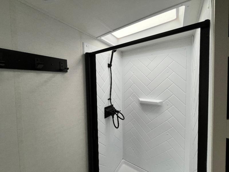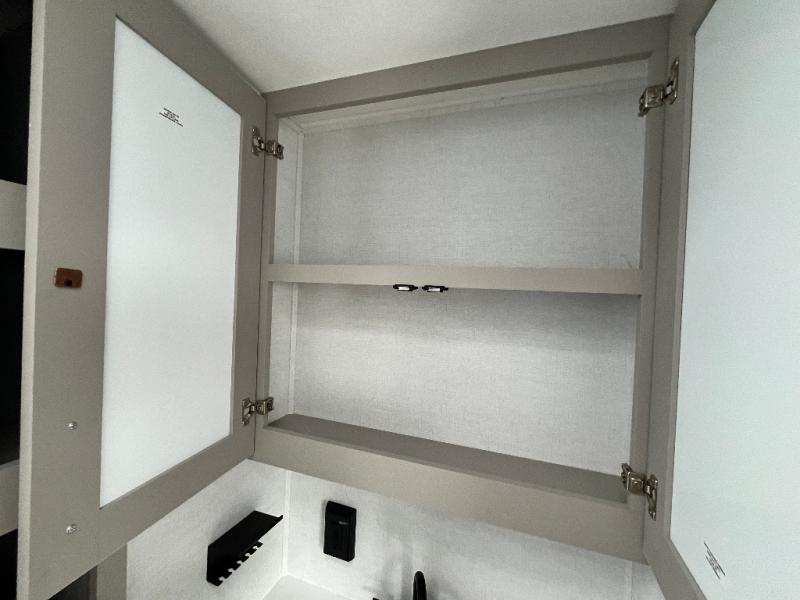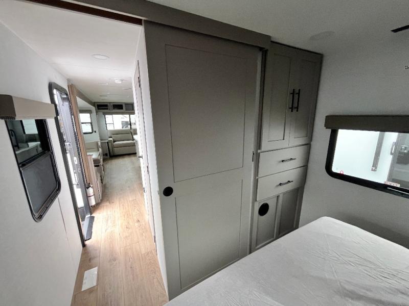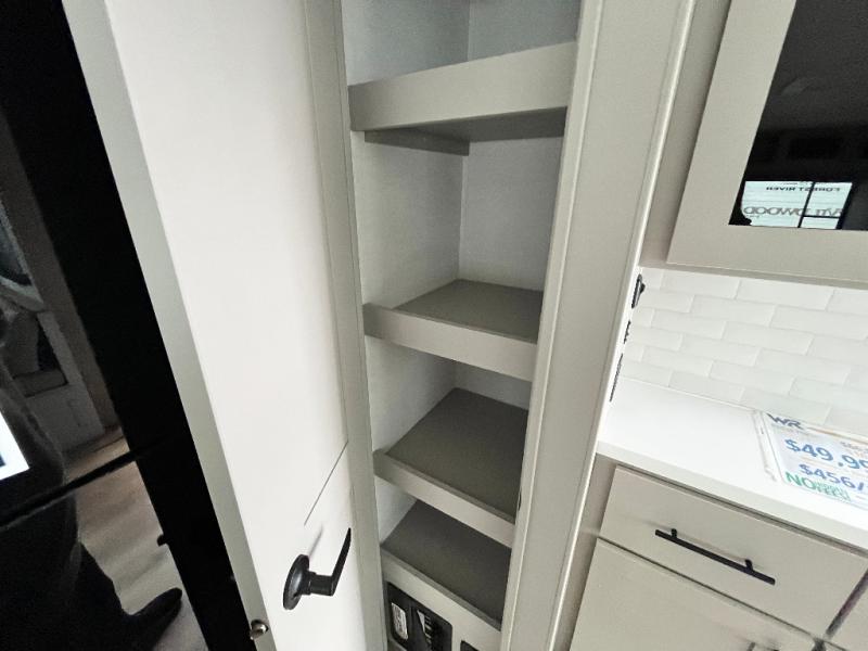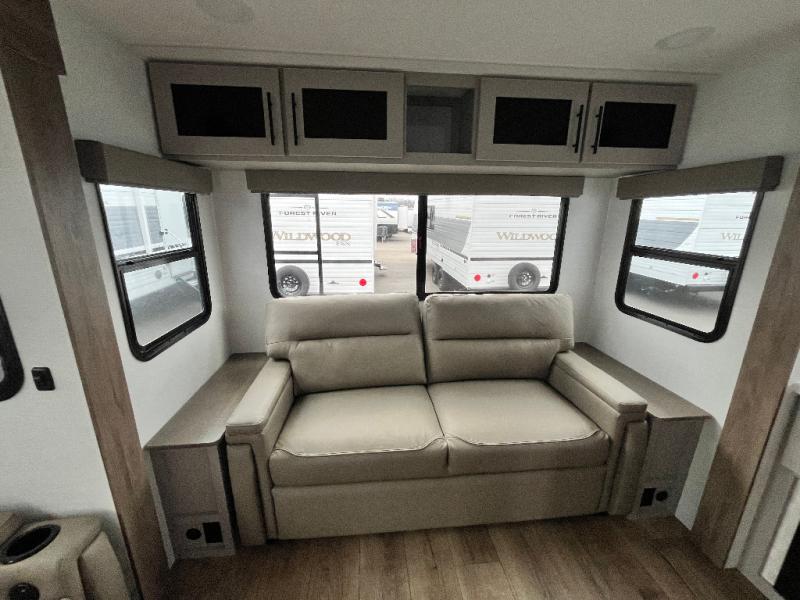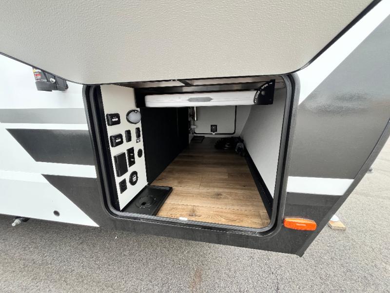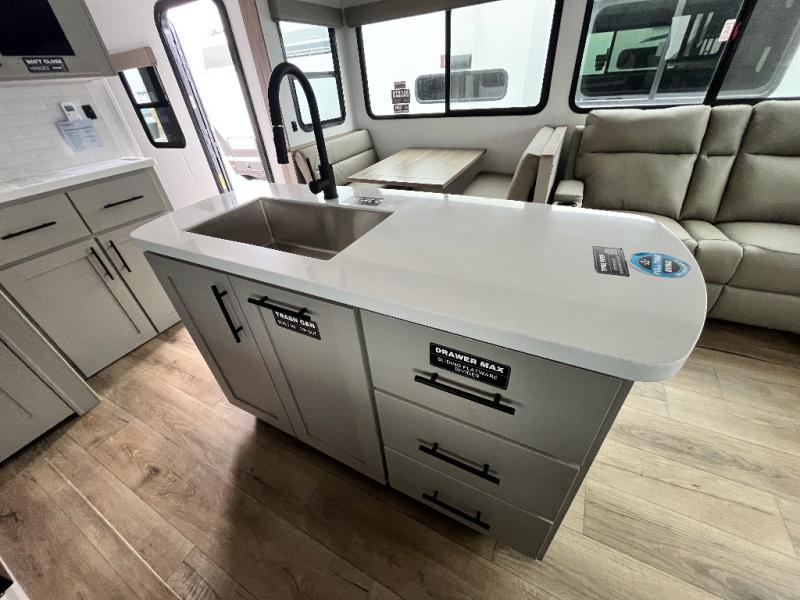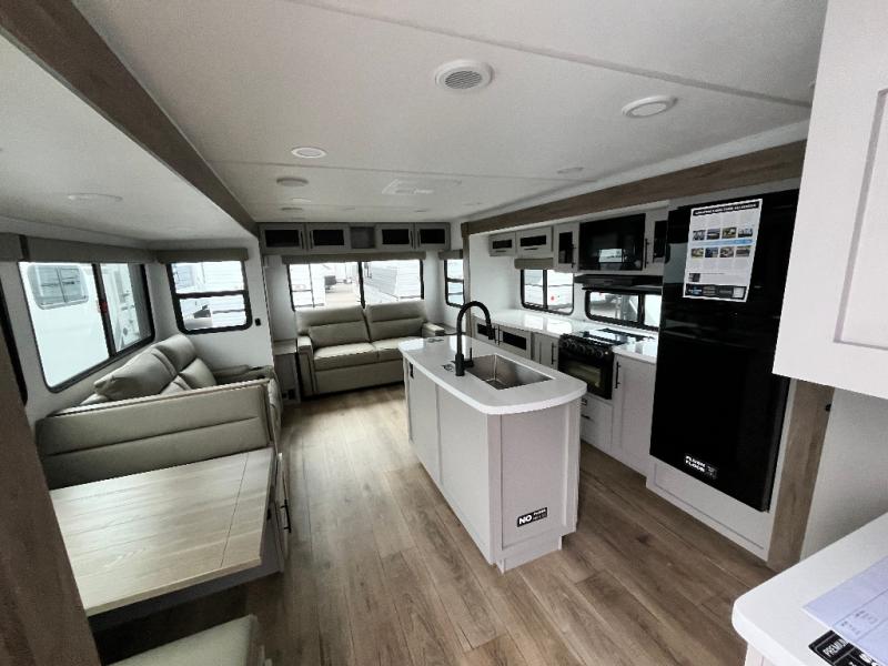 You will feel right at home camping in this travel trailer! The rear living area has a rear sofa and a set of theater seating conveniently across from the entertainment center with a 50" TV above a fireplace for a cozy evening indoors. Prepare your best home cooked meals with the three burner cooktop, kitchen island which even has a tip-out trash can, and 10 cu. ft. 12V refrigerator. Enjoy your meals at the dinette booth that can also be changed to a free standing dinette as an option then either freshen up in the full bathroom with the 30" x 36" shower or head outside to relax under one of the two awnings. The front private bedroom has a queen bed for you to lay your head on at night and has wardrobe nightstands for your items!