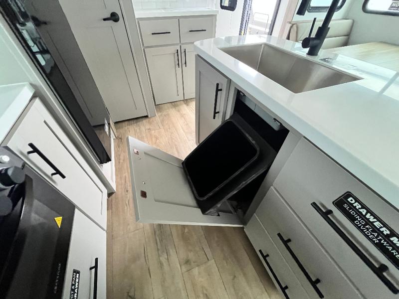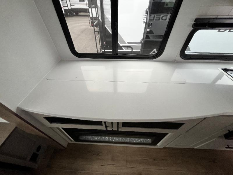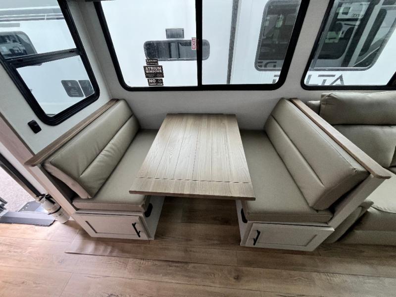 Form and function work together with every one of these Alliance RV Delta travel trailers! They are built with a walk-on roof with a seamless PVC roof covering, Mylar reinforced exterior seals, and a heated and enclosed underbelly to protect your unit. The commercial grade vinyl flooring will be easy to clean, and the oversized atrium windows throughout let in plenty of natural sunlight. With 62 cu. ft. of drop frame pass-through storage, you can bring along all of your essential camping gear plus it has USB charging for more convenience. There are many at home interior conveniences including a Bluetooth speaker, USB charging throughout, and even a pull-out kitchen trash can. Come find your favorite model today!