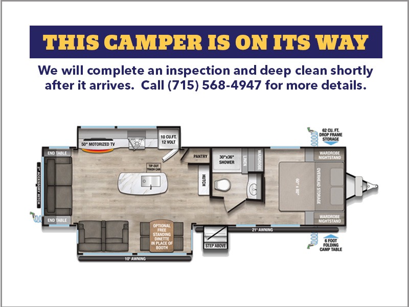 You will feel right at home camping in this travel trailer! The rear living area has a rear sofa and a set of theater seating conveniently across from the entertainment center with a 50" TV above a fireplace for a cozy evening indoors. Prepare your best home cooked meals with the three burner cooktop, kitchen island which even has a tip-out trash can, and 10 cu. ft. 12V refrigerator. Enjoy your meals at the dinette booth that can also be changed to a free standing dinette as an option then either freshen up in the full bathroom with the 30" x 36" shower or head outside to relax under one of the two awnings. The front private bedroom has a queen bed for you to lay your head on at night and has wardrobe nightstands for your items!