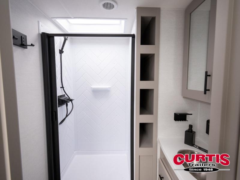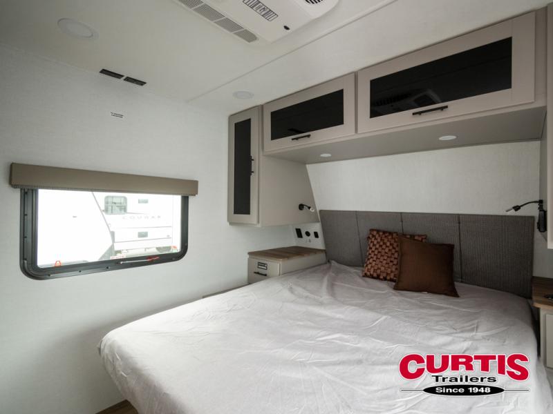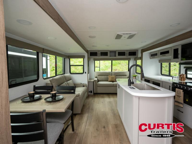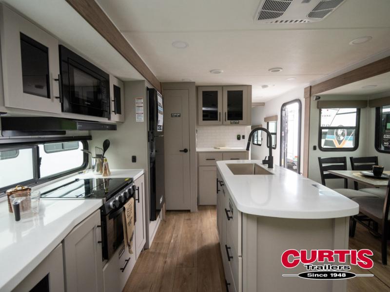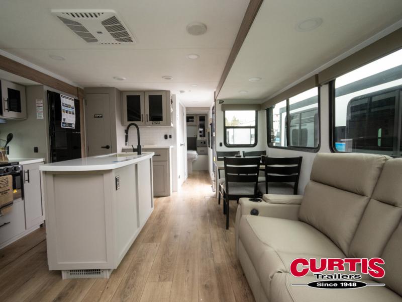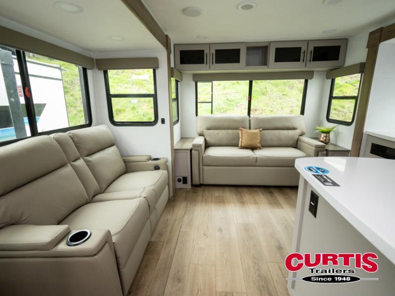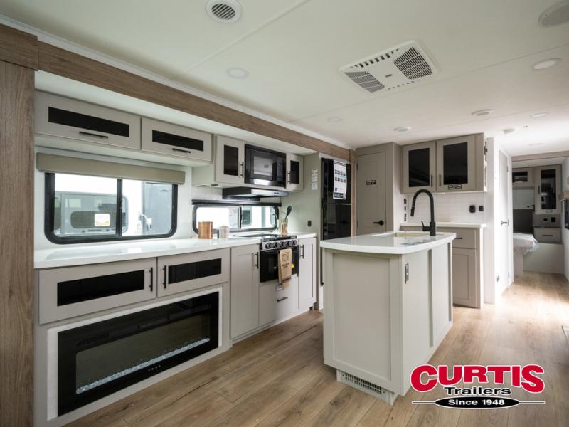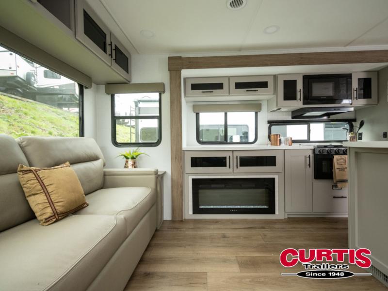 You will feel right at home camping in this travel trailer! The rear living area has a rear sofa and a set of theater seating conveniently across from the entertainment center with a 50" TV above a fireplace for a cozy evening indoors. Prepare your best home cooked meals with the three burner cooktop, kitchen island which even has a tip-out trash can, and 10 cu. ft. 12V refrigerator. Enjoy your meals at the dinette booth that can also be changed to a free standing dinette as an option then either freshen up in the full bathroom with the 30" x 36" shower or head outside to relax under one of the two awnings. The front private bedroom has a queen bed for you to lay your head on at night and has wardrobe nightstands for your items!