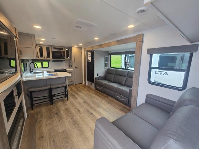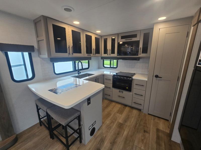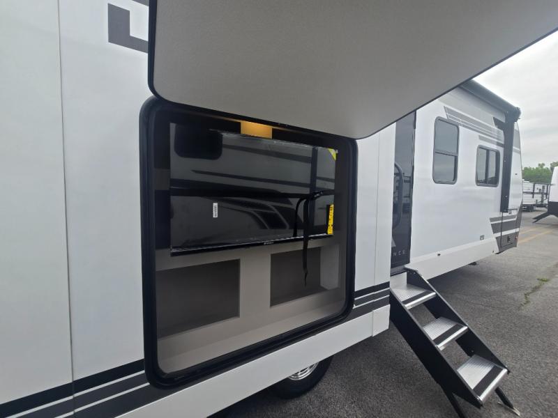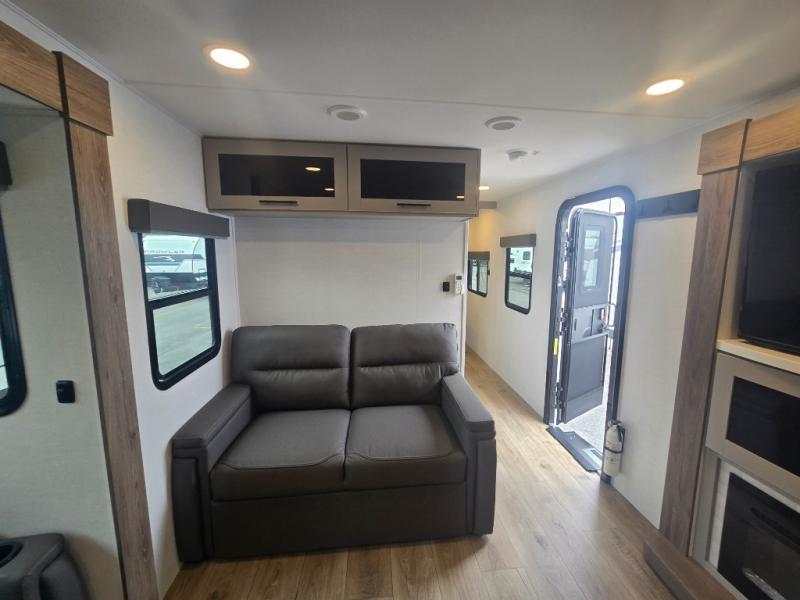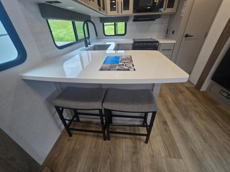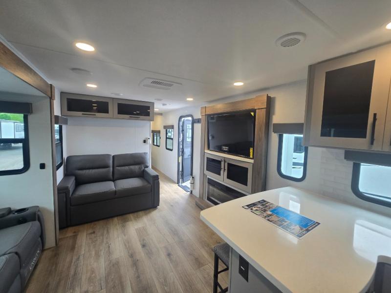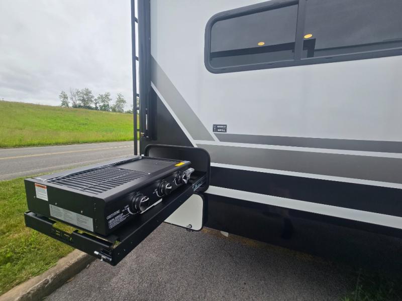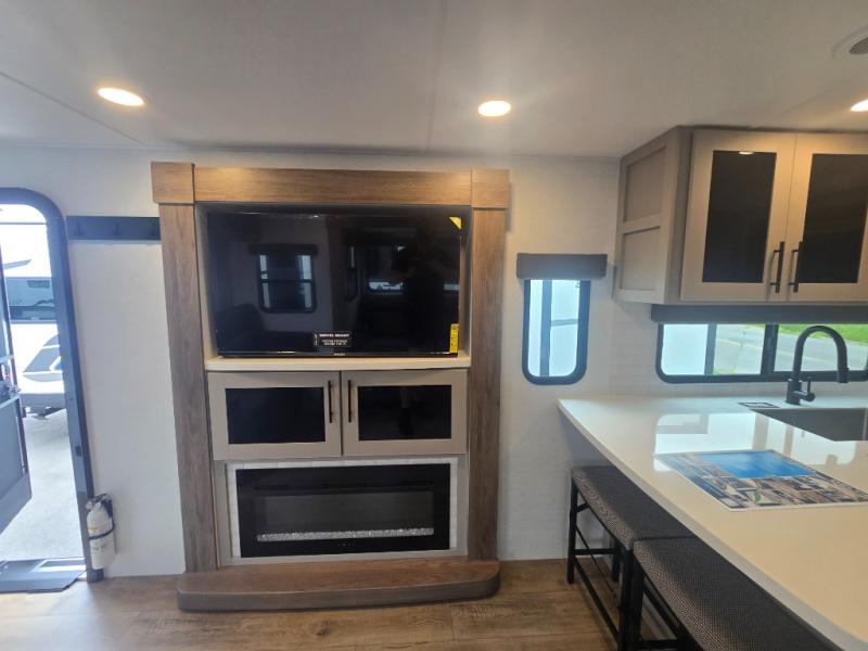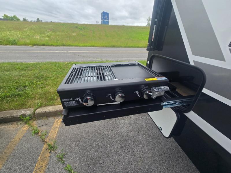 Start camping in luxury with this travel trailer! Prepare your best home cooked meals in the rear kitchen with the three burner cooktop, 10 cu. ft. 12V refrigerator, tip-out trash can, and even two bar stools to enjoy your morning coffee while reading the newspaper. Freshen up in the full bathroom with the 30" x 36" shower or head outside to relax under one of the two awnings. There is even an outdoor griddle/grill underneath one of the awnings to protect you while you grill up some juicy burgers, plus an outside 32" TV. The front private bedroom has a queen bed for you to lay your head on at night and has wardrobe nightstands for your items. Relax in true comfort each night on one of the two furniture spots in front of the entertainment center with a 50" class HDTV with a fireplace below it!
