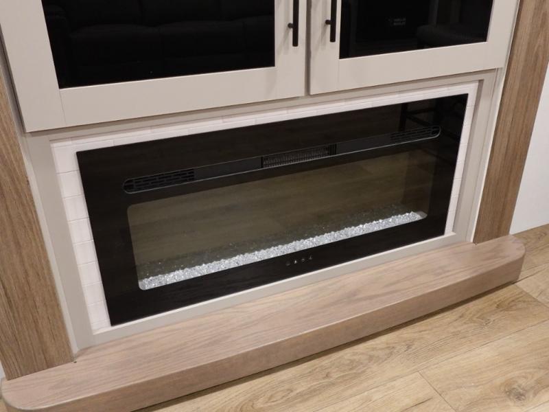 Start camping in luxury with this travel trailer! Prepare your best home cooked meals in the rear kitchen with the three burner cooktop, 10 cu. ft. 12V refrigerator, tip-out trash can, and even two bar stools to enjoy your morning coffee while reading the newspaper. Freshen up in the full bathroom with the 30" x 36" shower or head outside to relax under one of the two awnings. There is even an outdoor griddle/grill underneath one of the awnings to protect you while you grill up some juicy burgers, plus an outside 32" TV. The front private bedroom has a queen bed for you to lay your head on at night and has wardrobe nightstands for your items. Relax in true comfort each night on one of the two furniture spots in front of the entertainment center with a 50" class HDTV with a fireplace below it!