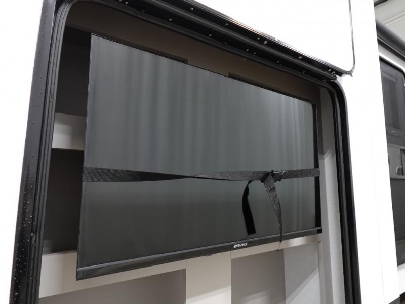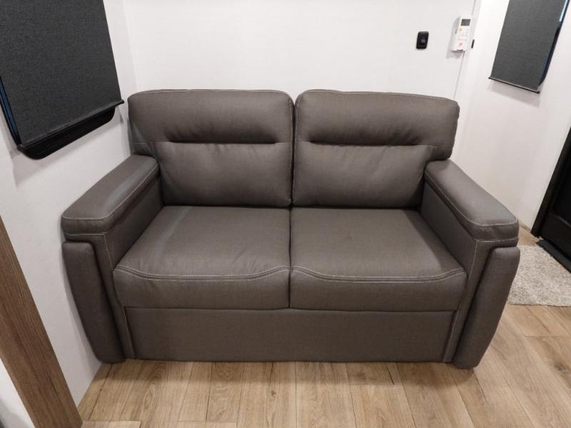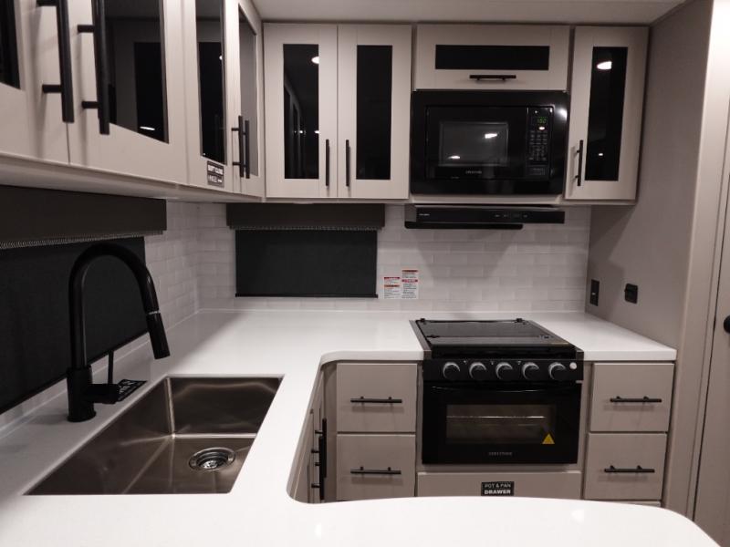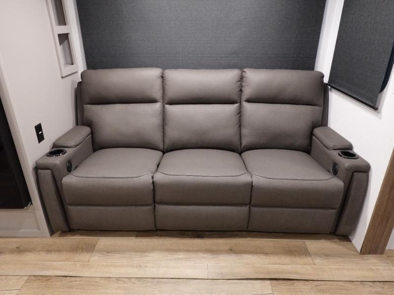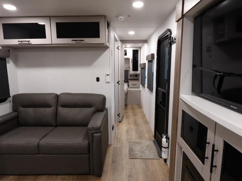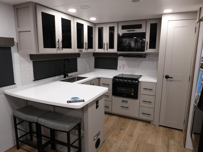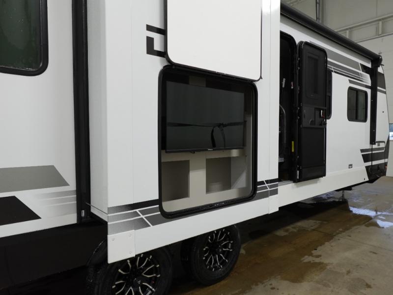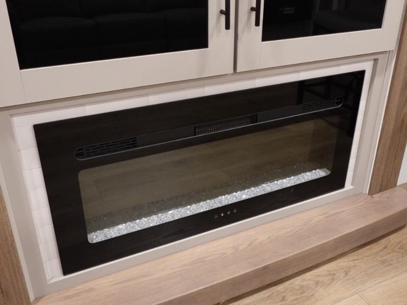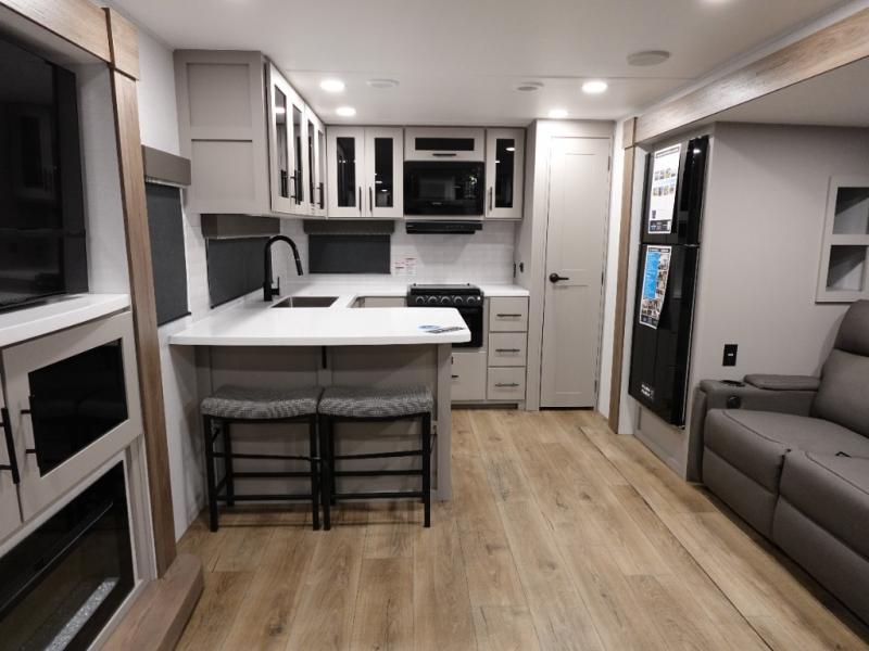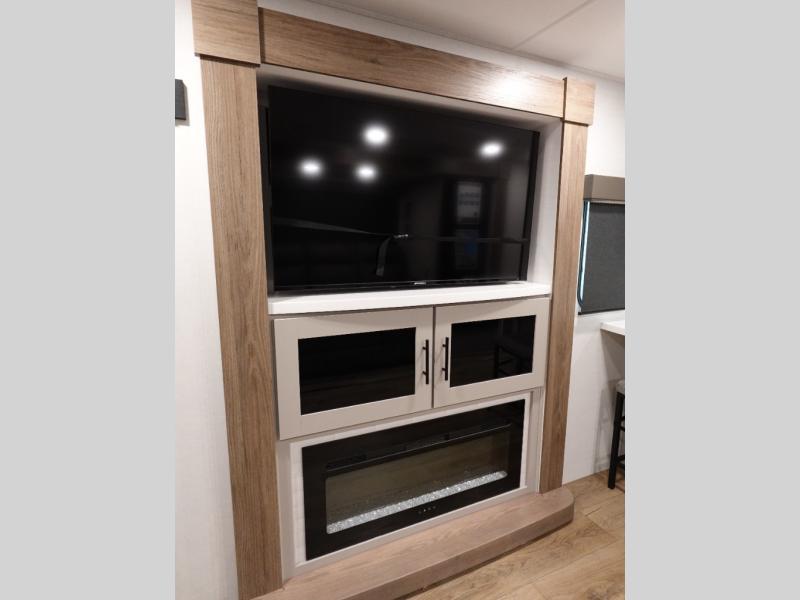Start camping in luxury with this travel trailer! Prepare your best home cooked meals in the rear kitchen with the three burner cooktop, 10 cu. ft. 12V refrigerator, tip-out trash can, and even two bar stools to enjoy your morning coffee while reading the newspaper. Freshen up in the full bathroom with the 30" x 36" shower or head outside to relax under one of the two awnings. There is even an outdoor griddle/grill underneath one of the awnings to protect you while you grill up some juicy burgers, plus an outside 32" TV. The front private bedroom has a queen bed for you to lay your head on at night and has wardrobe nightstands for your items. Relax in true comfort each night on one of the two furniture spots in front of the entertainment center with a 50" class HDTV with a fireplace below it!