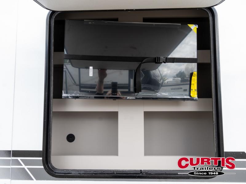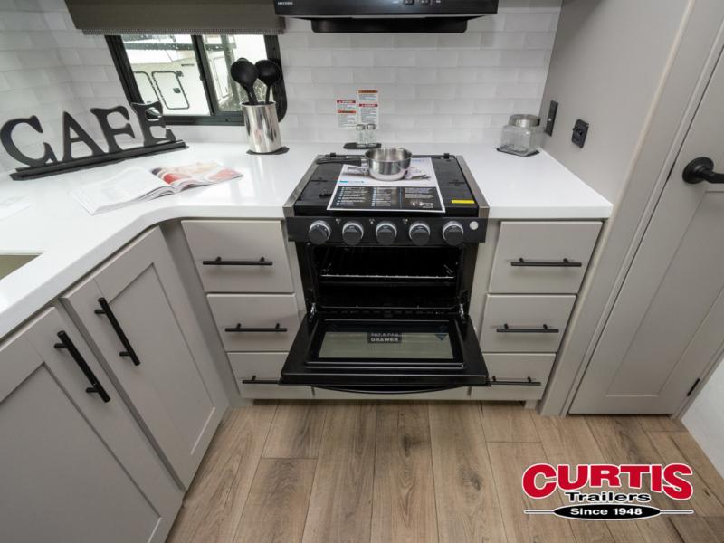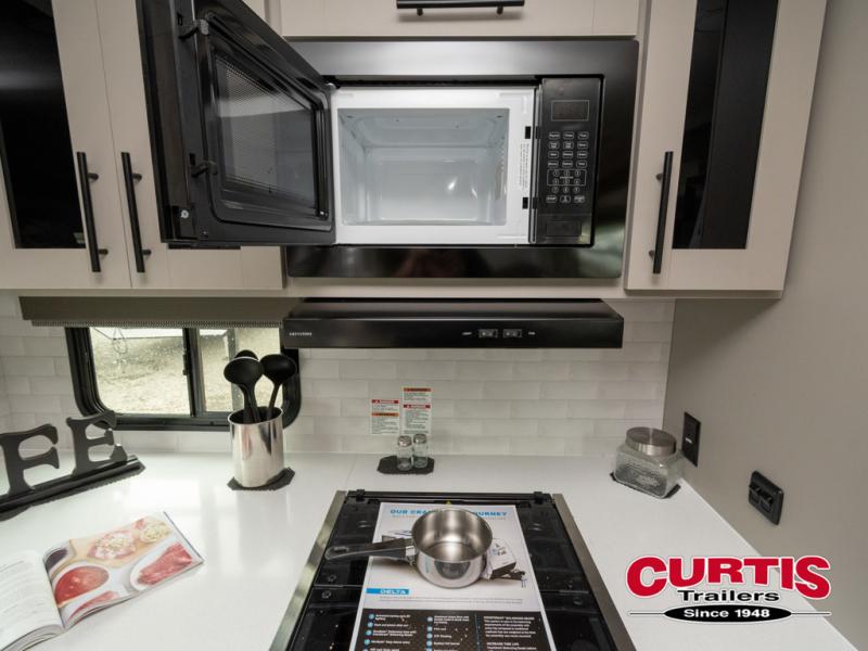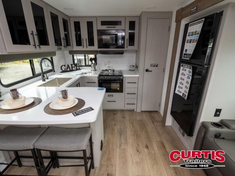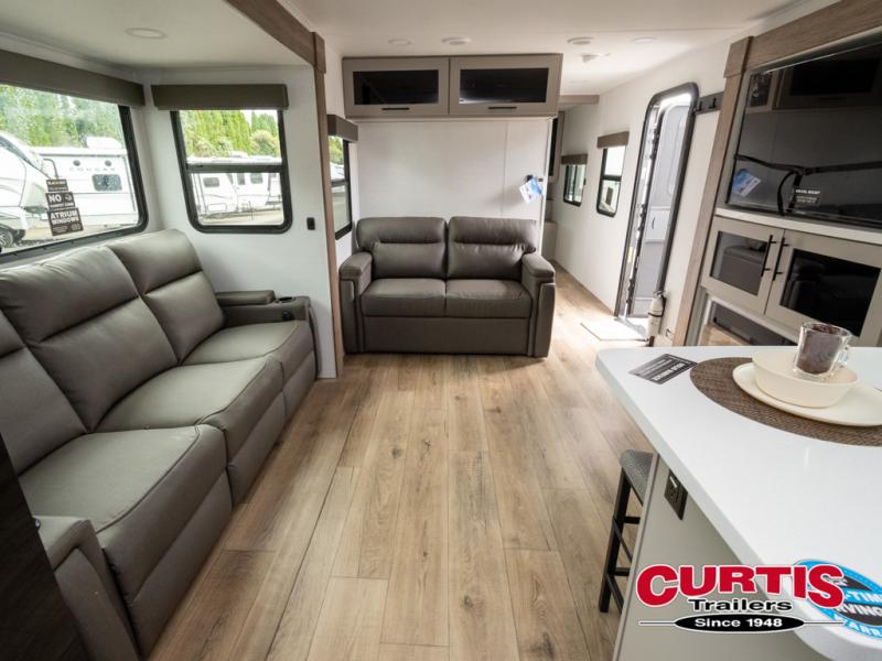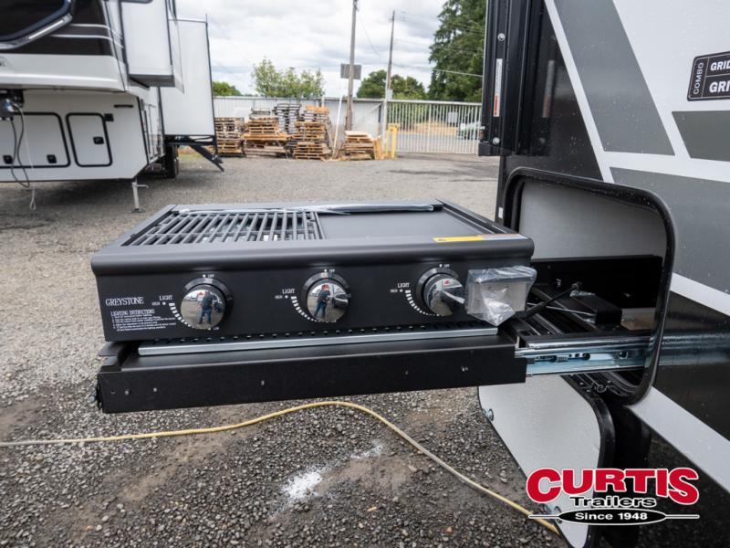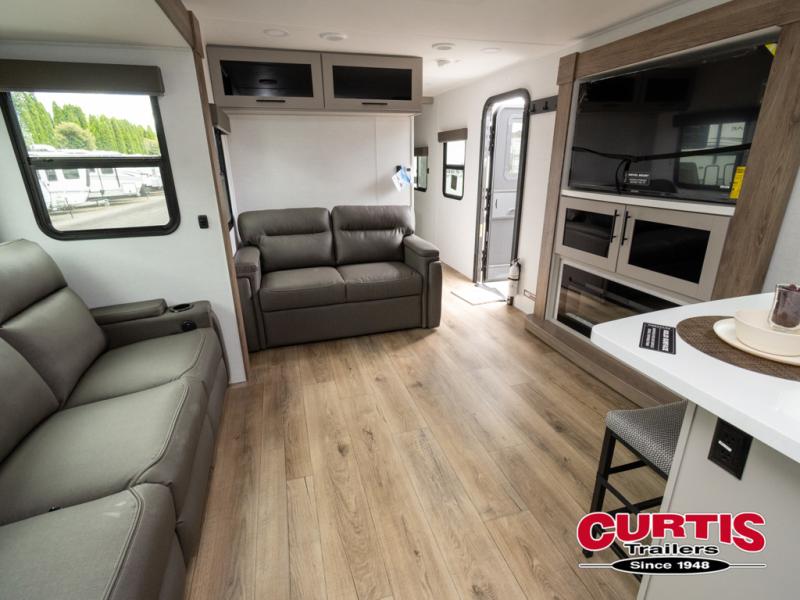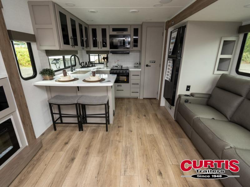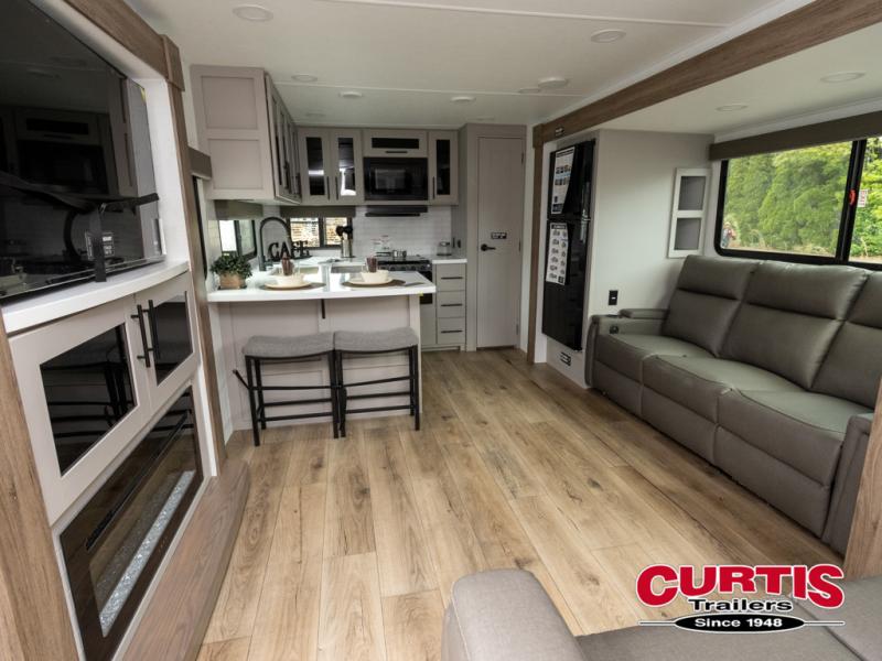 Start camping in luxury with this travel trailer! Prepare your best home cooked meals in the rear kitchen with the three burner cooktop, 10 cu. ft. 12V refrigerator, tip-out trash can, and even two bar stools to enjoy your morning coffee while reading the newspaper. Freshen up in the full bathroom with the 30" x 36" shower or head outside to relax under one of the two awnings. There is even an outdoor griddle/grill underneath one of the awnings to protect you while you grill up some juicy burgers, plus an outside 32" TV. The front private bedroom has a queen bed for you to lay your head on at night and has wardrobe nightstands for your items. Relax in true comfort each night on one of the two furniture spots in front of the entertainment center with a 50" class HDTV with a fireplace below it!