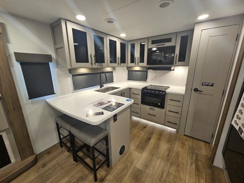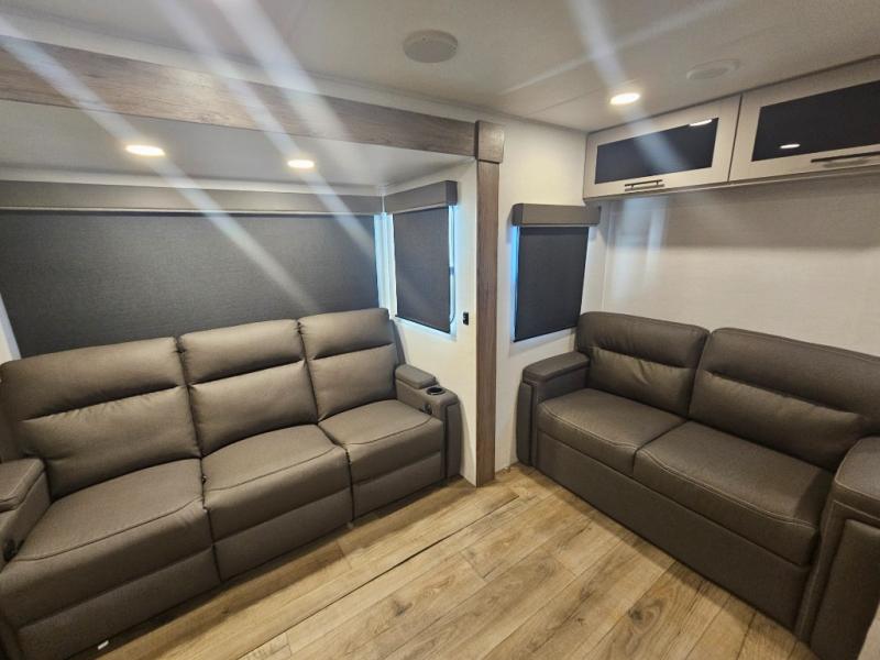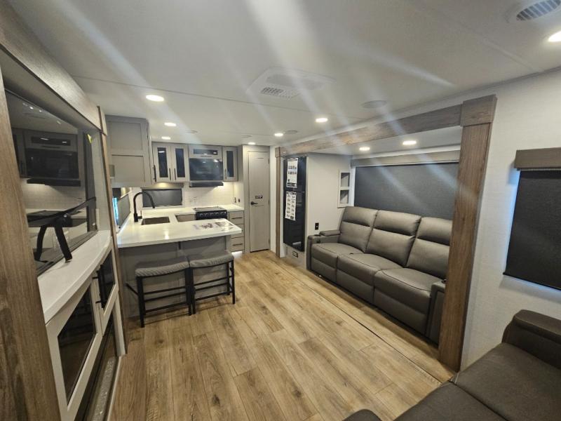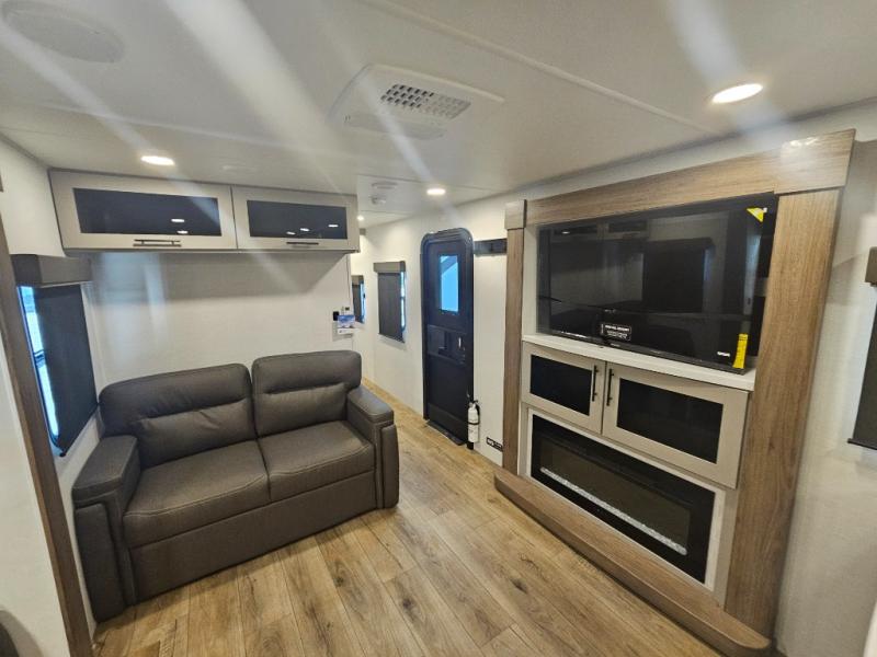 Start camping in luxury with this travel trailer! Prepare your best home cooked meals in the rear kitchen with the three burner cooktop, 10 cu. ft. 12V refrigerator, tip-out trash can, and even two bar stools to enjoy your morning coffee while reading the newspaper. Freshen up in the full bathroom with the 30" x 36" shower or head outside to relax under one of the two awnings. There is even an outdoor griddle/grill underneath one of the awnings to protect you while you grill up some juicy burgers, plus an outside 32" TV. The front private bedroom has a queen bed for you to lay your head on at night and has wardrobe nightstands for your items. Relax in true comfort each night on one of the two furniture spots in front of the entertainment center with a 50" class HDTV with a fireplace below it!