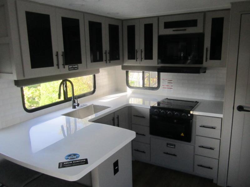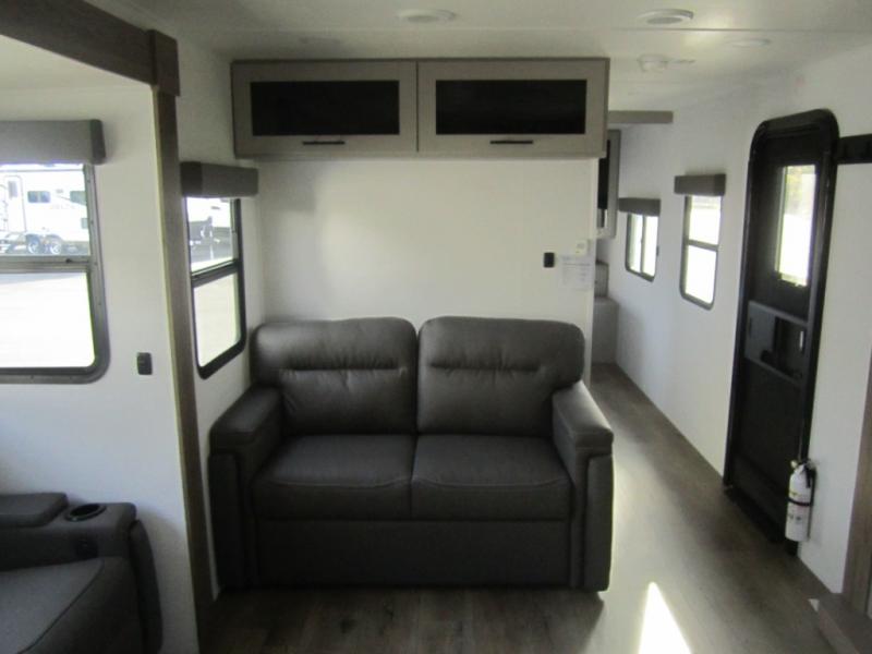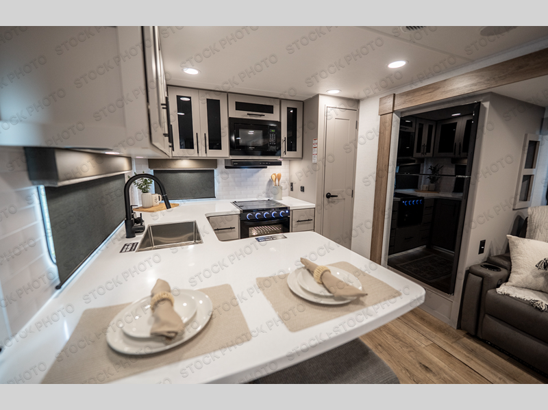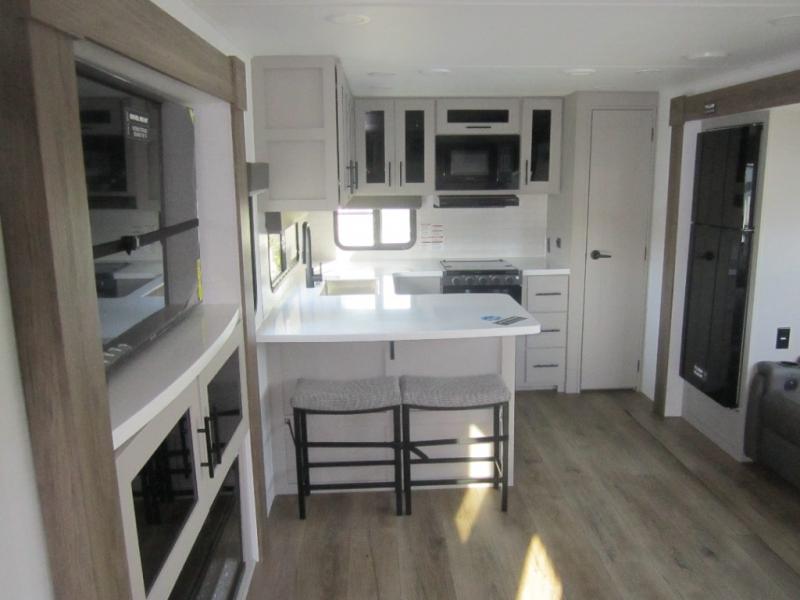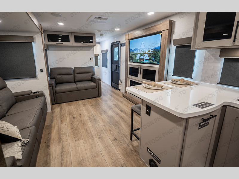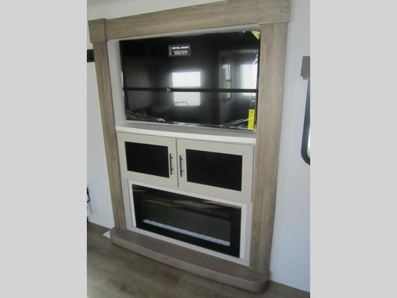 Start camping in luxury with this travel trailer! Prepare your best home cooked meals in the rear kitchen with the three burner cooktop, 10 cu. ft. 12V refrigerator, tip-out trash can, and even two bar stools to enjoy your morning coffee while reading the newspaper. Freshen up in the full bathroom with the 30" x 36" shower or head outside to relax under one of the two awnings. There is even an outdoor griddle/grill underneath one of the awnings to protect you while you grill up some juicy burgers, plus an outside 32" TV. The front private bedroom has a queen bed for you to lay your head on at night and has wardrobe nightstands for your items. Relax in true comfort each night on one of the two furniture spots in front of the entertainment center with a 50" TV with a fireplace below it!
