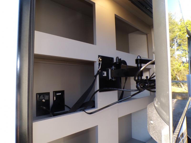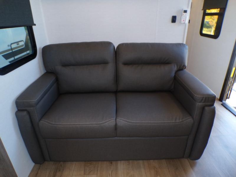 Start camping in luxury with this travel trailer! Prepare your best home cooked meals in the rear kitchen with the three burner cooktop, 10 cu. ft. 12V refrigerator, tip-out trash can, and even two bar stools to enjoy your morning coffee while reading the newspaper. Freshen up in the full bathroom with the 30" x 36" shower or head outside to relax under one of the two awnings. There is even an outdoor griddle/grill underneath one of the awnings to protect you while you grill up some juicy burgers, plus an outside 32" TV. The front private bedroom has a queen bed for you to lay your head on at night and has wardrobe nightstands for your items. Relax in true comfort each night on one of the two furniture spots in front of the entertainment center with a 50" TV with a fireplace below it!