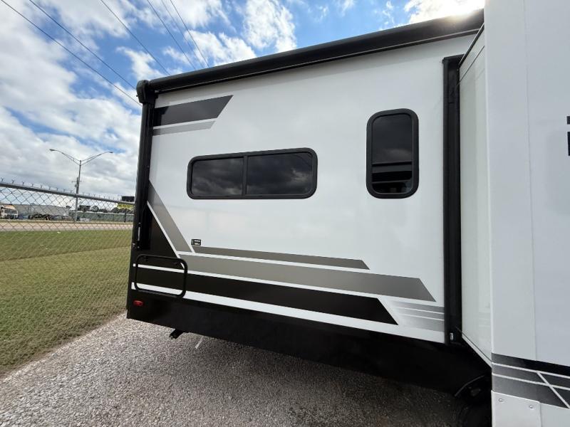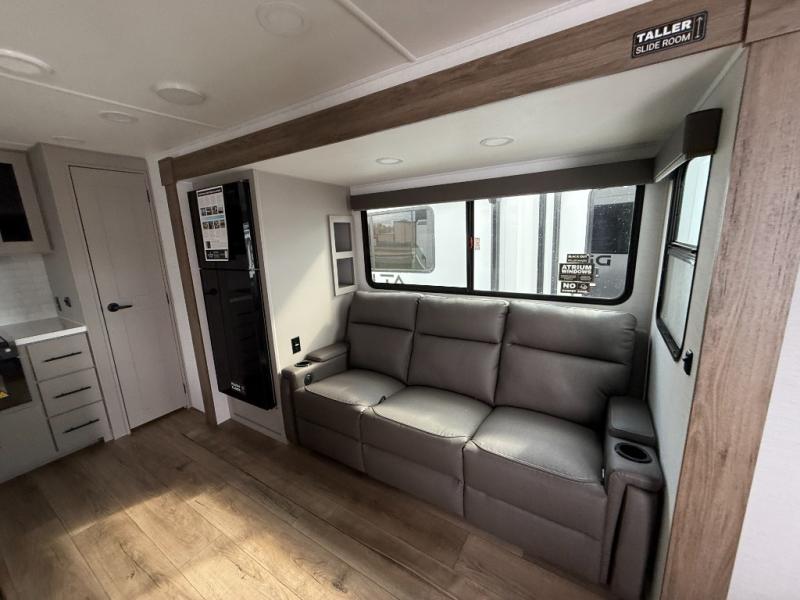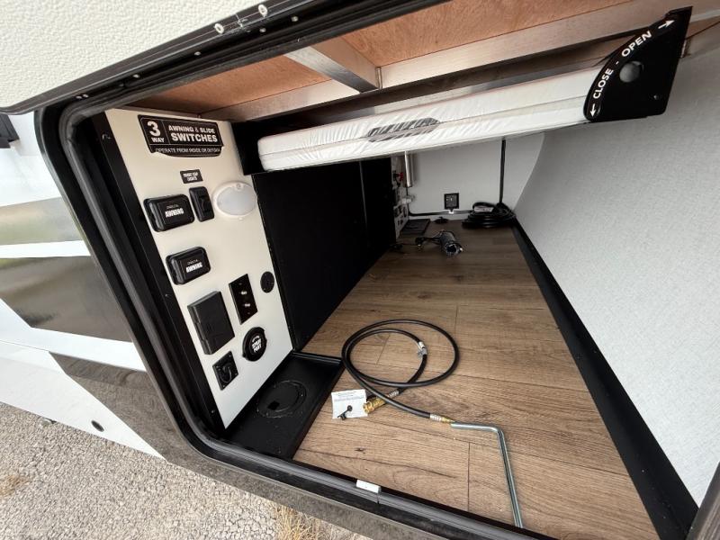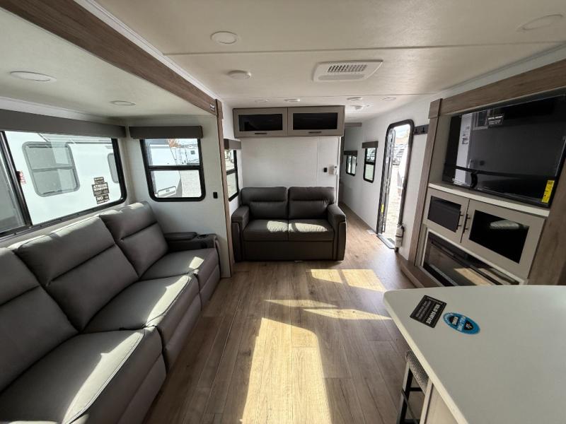Start camping in luxury with this travel trailer! Prepare your best home cooked meals in the rear kitchen with the three burner cooktop, 10 cu. ft. 12V refrigerator, tip-out trash can, and even two bar stools to enjoy your morning coffee while reading the newspaper. Freshen up in the full bathroom with the 30" x 36" shower or head outside to relax under one of the two awnings. There is even an outdoor griddle/grill underneath one of the awnings to protect you while you grill up some juicy burgers, plus an outside 32" TV. The front private bedroom has a queen bed for you to lay your head on at night and has wardrobe nightstands for your items. Relax in true comfort each night on one of the two furniture spots in front of the entertainment center with a 50" TV with a fireplace below it!