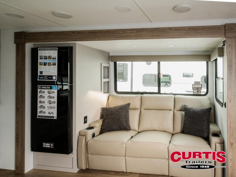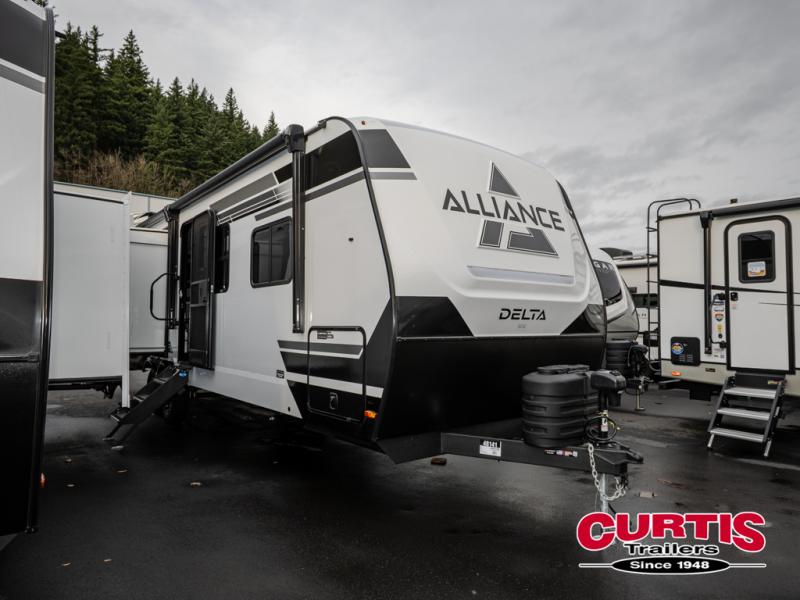 Form and function work together with every one of these Alliance RV Delta travel trailers! They are built with a walk-on roof with a seamless PVC roof covering, Mylar reinforced exterior seals, and a heated and enclosed underbelly to protect your unit. The commercial grade vinyl flooring will be easy to clean, and the oversized atrium windows throughout let in plenty of natural sunlight. With 62 cu. ft. of drop frame pass-through storage, you can bring along all of your essential camping gear plus it has USB charging for more convenience. There are many at home interior conveniences including a Bluetooth speaker, USB charging throughout, and even a pull-out kitchen trash can. Come find your favorite model today!
