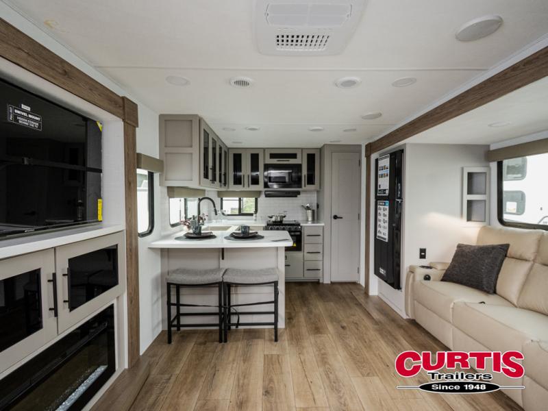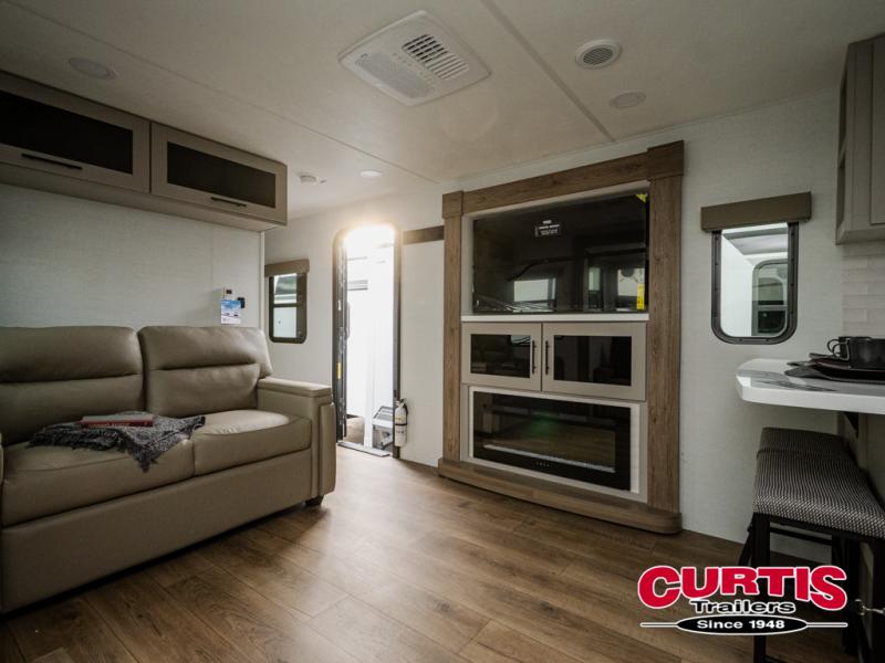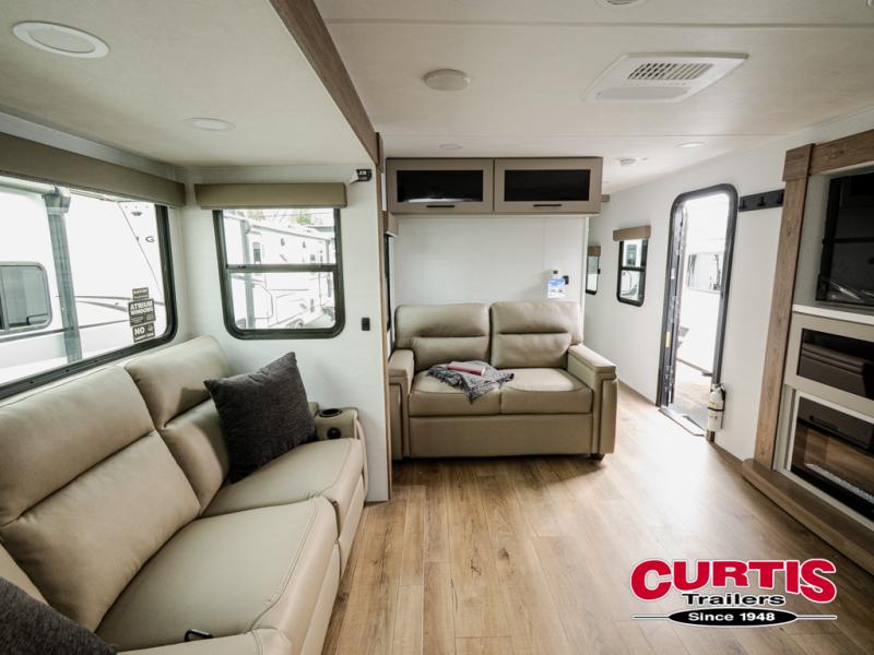 Start camping in luxury with this travel trailer! Prepare your best home cooked meals in the rear kitchen with the three burner cooktop, 10 cu. ft. 12V refrigerator, tip-out trash can, and even two bar stools to enjoy your morning coffee while reading the newspaper. Freshen up in the full bathroom with the 30" x 36" shower or head outside to relax under one of the two awnings. There is even an outdoor griddle/grill underneath one of the awnings to protect you while you grill up some juicy burgers, plus an outside 32" TV. The front private bedroom has a queen bed for you to lay your head on at night and has wardrobe nightstands for your items. Relax in true comfort each night on one of the two furniture spots in front of the entertainment center with a 50" TV with a fireplace below it!