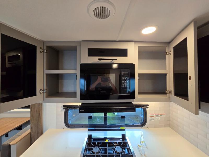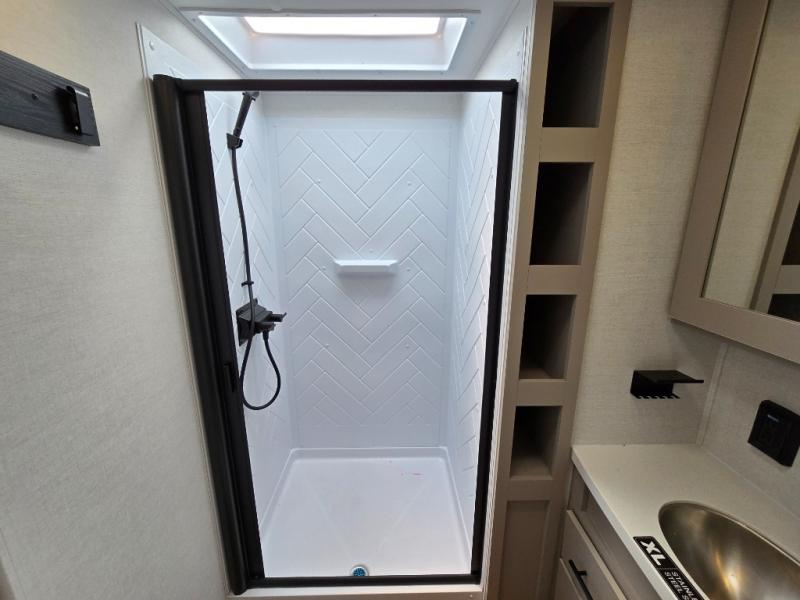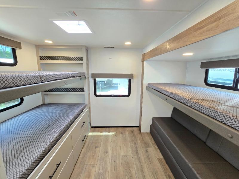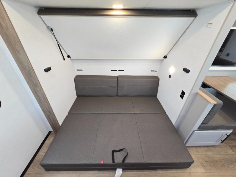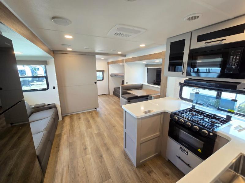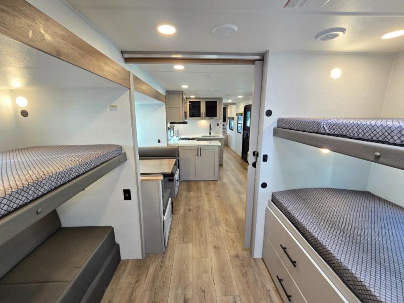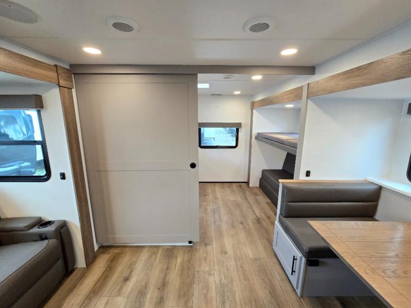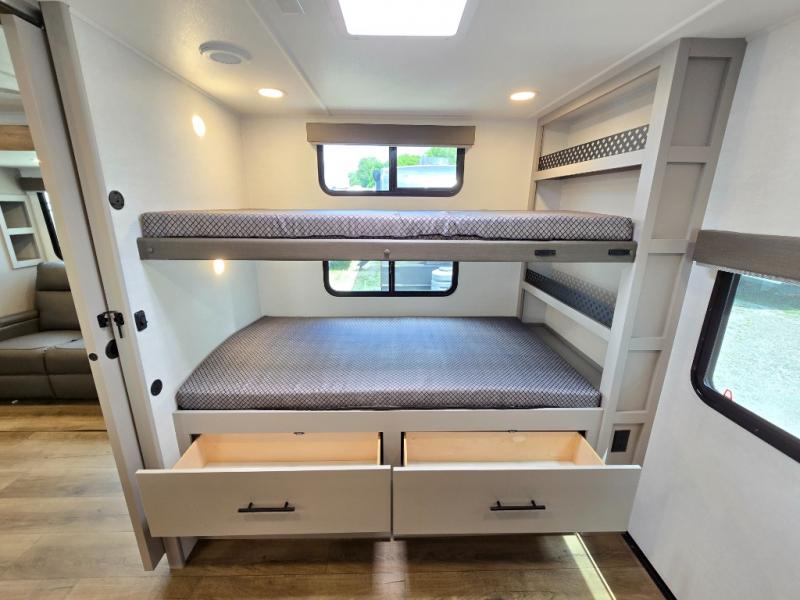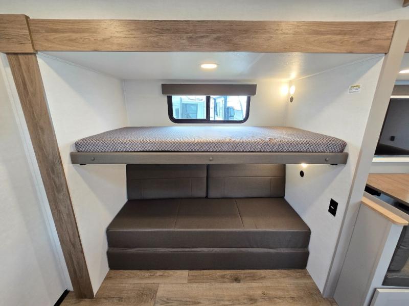 Enjoy glamping in this spacious travel trailer for eight! Your guests or the kids will love the rear bunkhouse with 40" x 72" bunk beds across from a third bunk with a cube sofa below, and the slide out will make this space more open. The slide out also includes the booth dinette in the main living area, which is across from the sofa slide out. The chef will love cooking in this Delta kitchen with generous counter space, a 10 cu. ft. 12V refrigerator, plus pull-out pantry trays for dry goods and snacks. The full bath with a 30" x 36" shower and a soft close porcelain foot flush toilet will allow you to fresh up each day without having to use the camp's facilities. And don't overlook the front private bedroom with a queen bed, wardrobe nightstands, a third wardrobe plus overhead storage; now nothing has to get left behind!