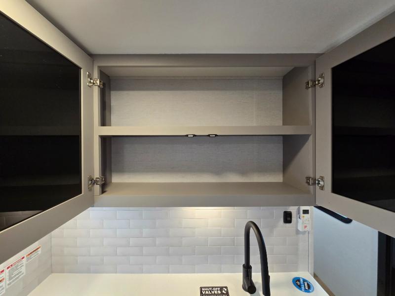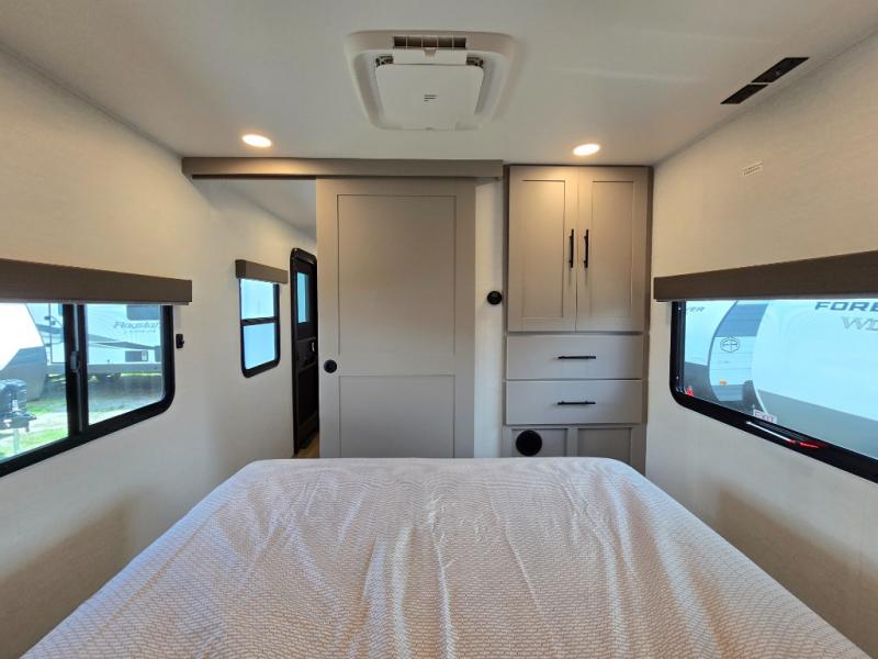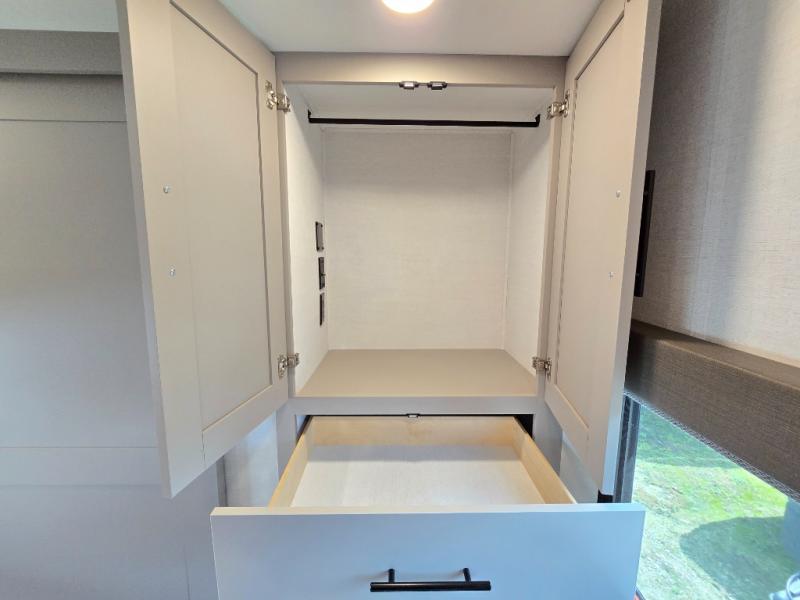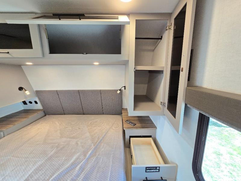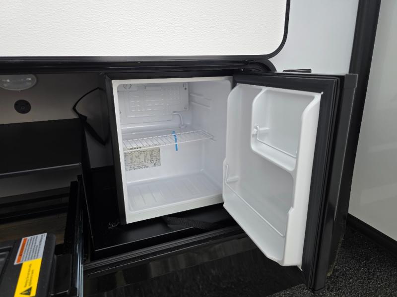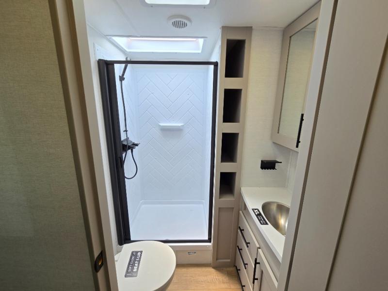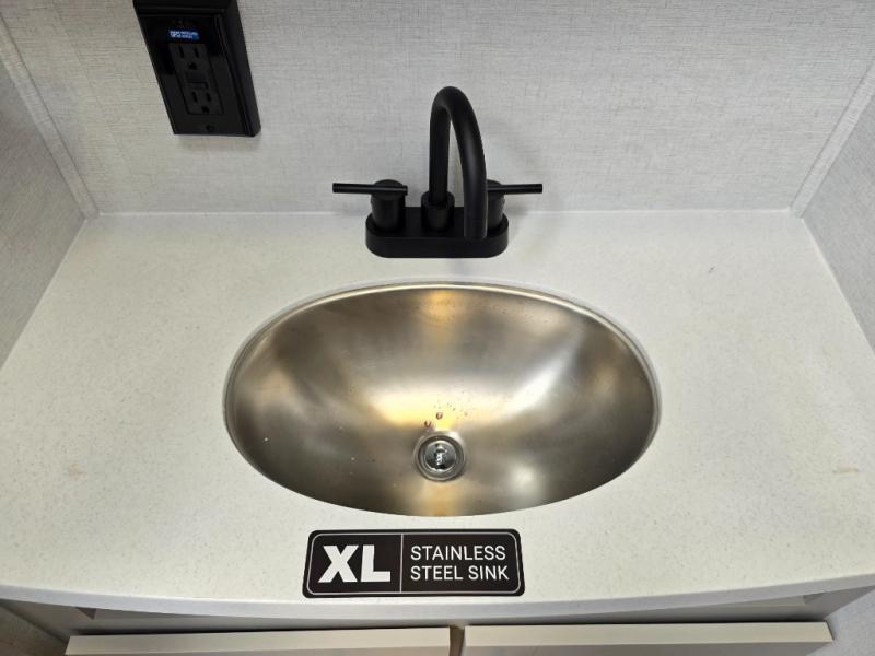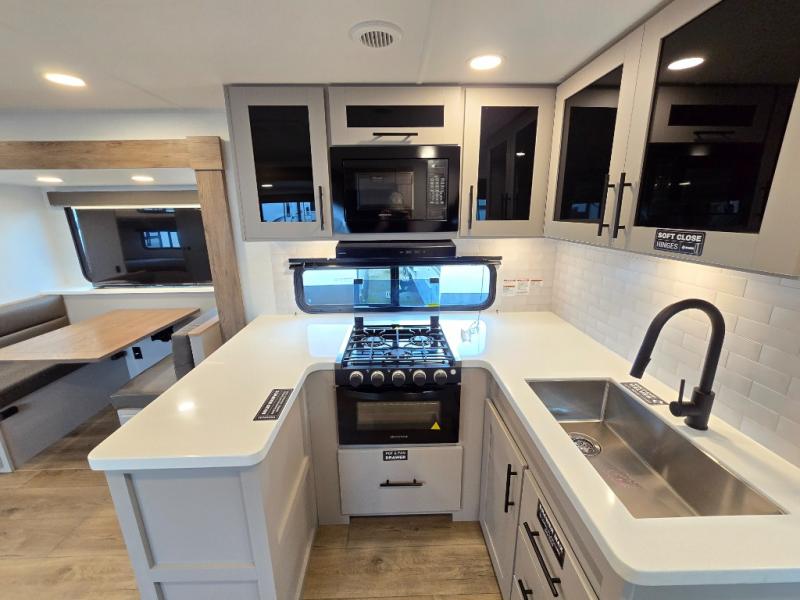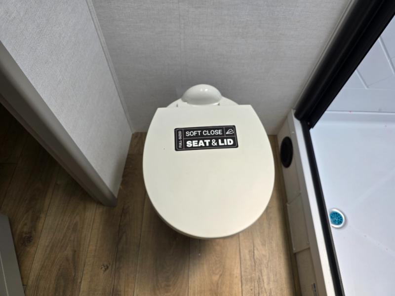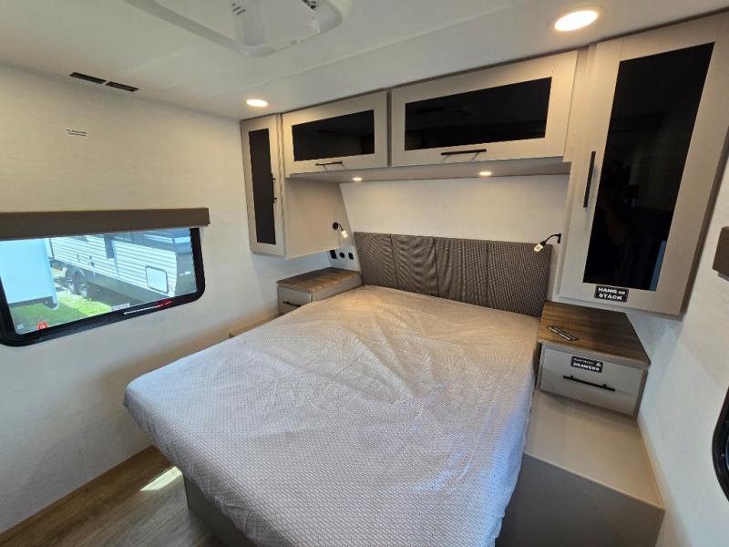 Enjoy glamping in this spacious travel trailer for eight! Your guests or the kids will love the rear bunkhouse with 40" x 72" bunk beds across from a third bunk with a cube sofa below, and the slide out will make this space more open. The slide out also includes the booth dinette in the main living area, which is across from the sofa slide out. The chef will love cooking in this Delta kitchen with generous counter space, a 10 cu. ft. 12V refrigerator, plus pull-out pantry trays for dry goods and snacks. The full bath with a 30" x 36" shower and a soft close porcelain foot flush toilet will allow you to fresh up each day without having to use the camp's facilities. And don't overlook the front private bedroom with a queen bed, wardrobe nightstands, a third wardrobe plus overhead storage; now nothing has to get left behind!