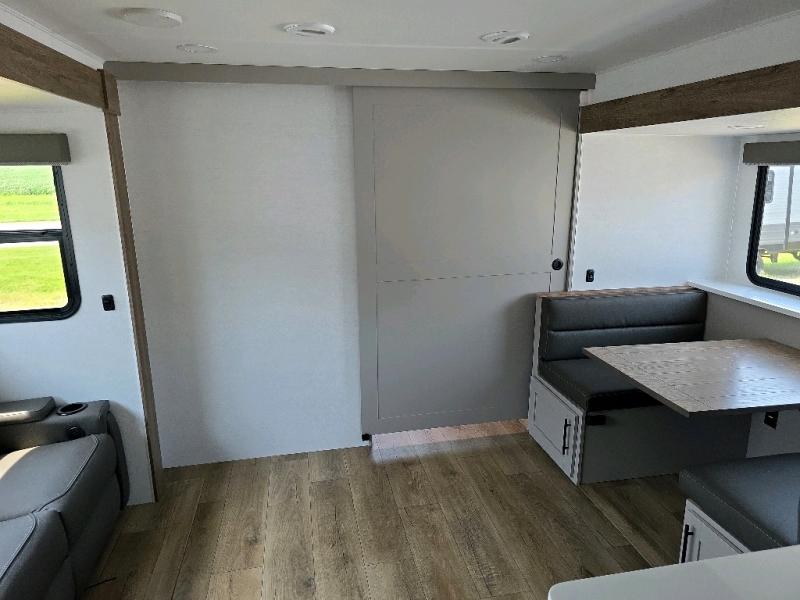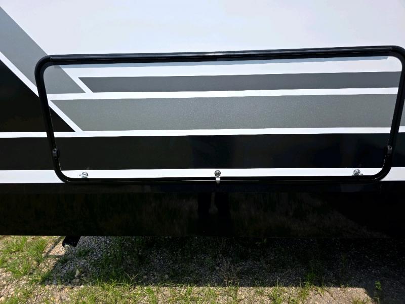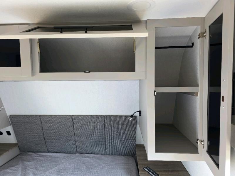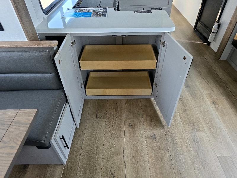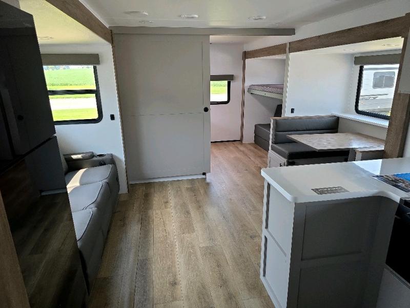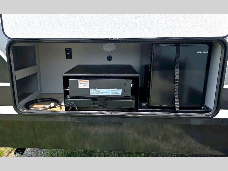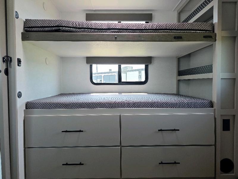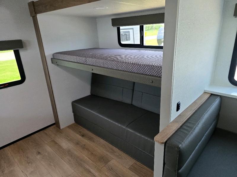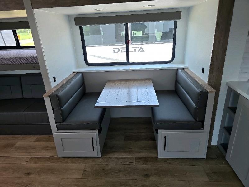 Enjoy glamping in this spacious travel trailer for eight! Your guests or the kids will love the rear bunkhouse with 40" x 72" bunk beds across from a third bunk with a cube sofa below, and the slide out will make this space more open. The slide out also includes the booth dinette in the main living area, which is across from the sofa slide out. The chef will love cooking in this Delta kitchen with generous counter space, a 10 cu. ft. 12V refrigerator, plus pull-out pantry trays for dry goods and snacks. The full bath with a 30" x 36" shower and a soft close porcelain foot flush toilet will allow you to fresh up each day without having to use the camp's facilities. And don't overlook the front private bedroom with a queen bed, wardrobe nightstands, a third wardrobe plus overhead storage; now nothing has to get left behind!