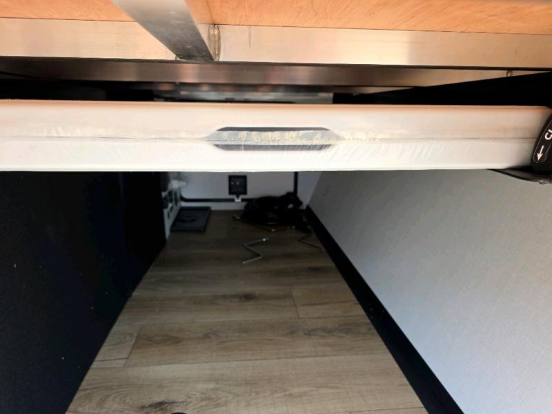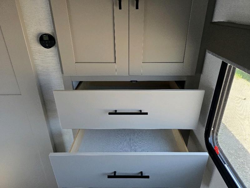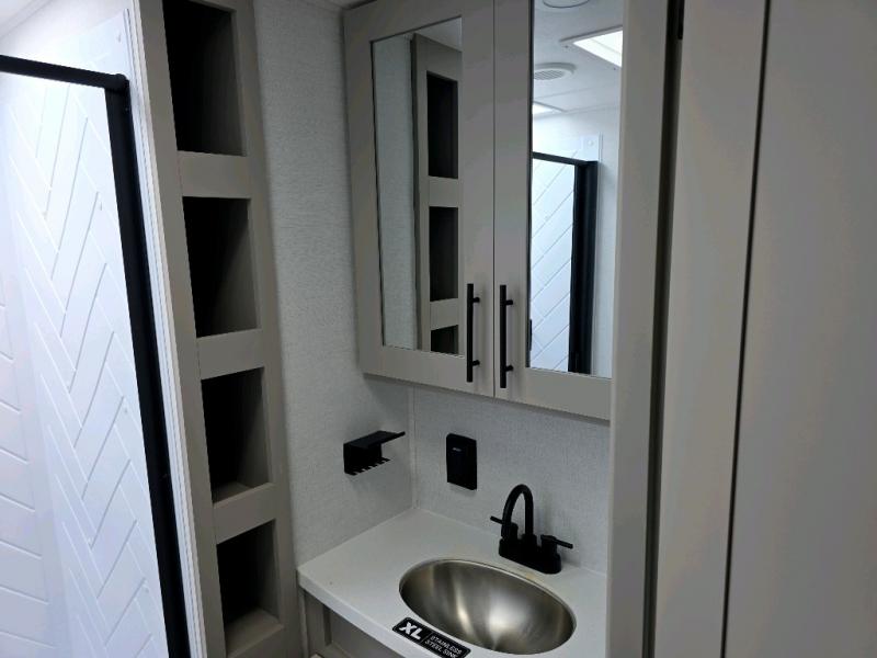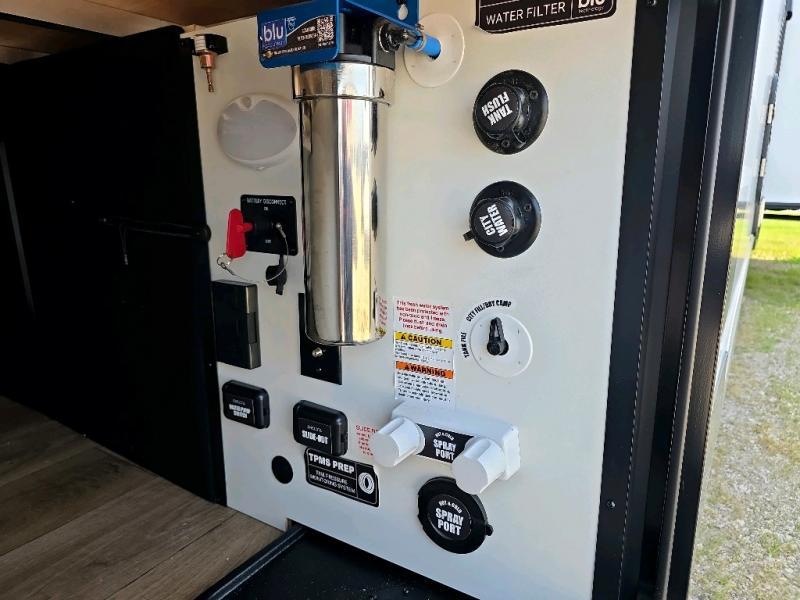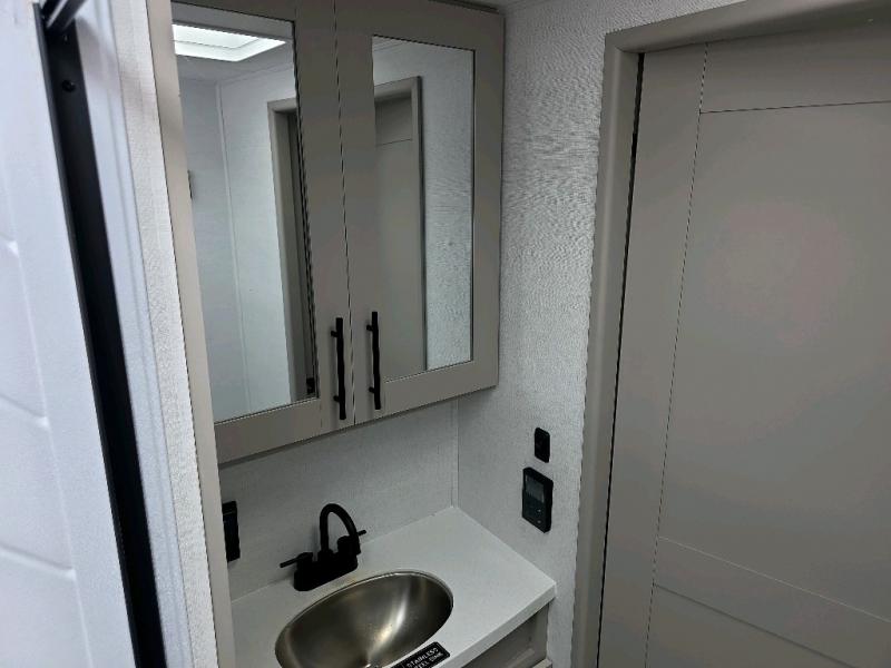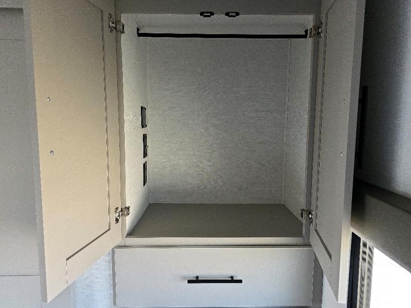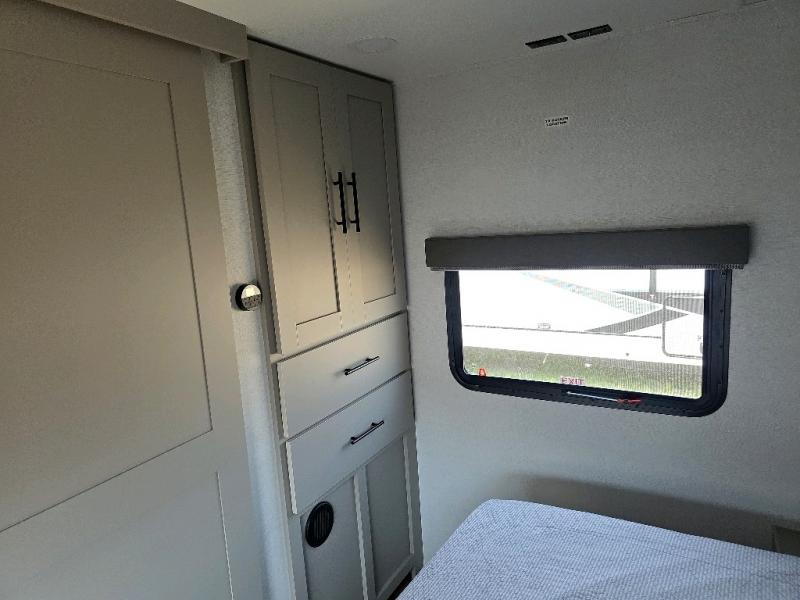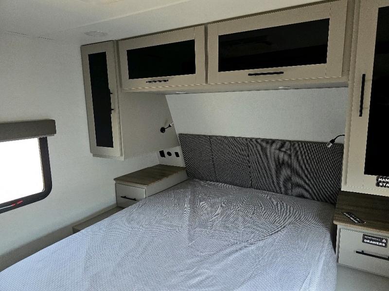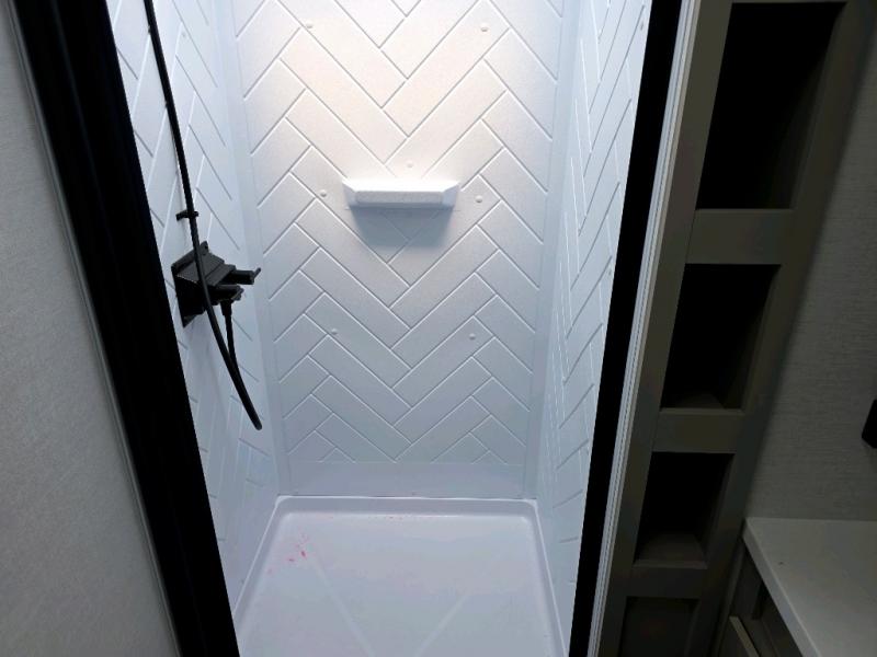 Enjoy glamping in this spacious travel trailer for eight! Your guests or the kids will love the rear bunkhouse with 40" x 72" bunk beds across from a third bunk with a cube sofa below, and the slide out will make this space more open. The slide out also includes the booth dinette in the main living area, which is across from the sofa slide out. The chef will love cooking in this Delta kitchen with generous counter space, a 10 cu. ft. 12V refrigerator, plus pull-out pantry trays for dry goods and snacks. The full bath with a 30" x 36" shower and a soft close porcelain foot flush toilet will allow you to fresh up each day without having to use the camp's facilities. And don't overlook the front private bedroom with a queen bed, wardrobe nightstands, a third wardrobe plus overhead storage; now nothing has to get left behind!