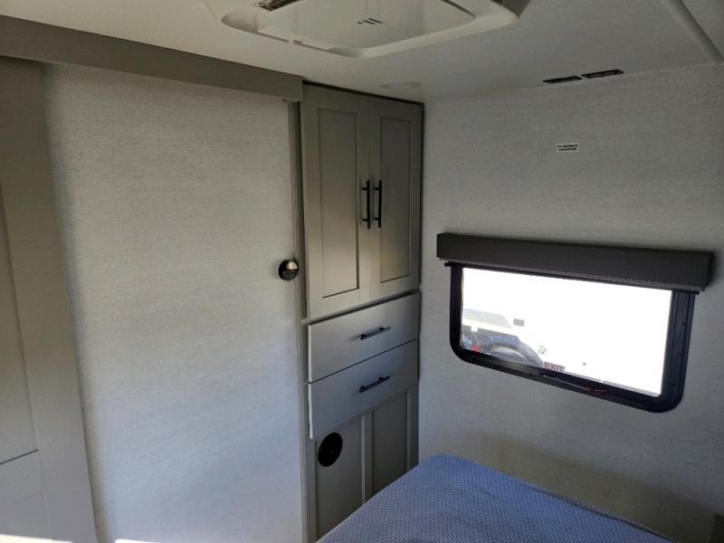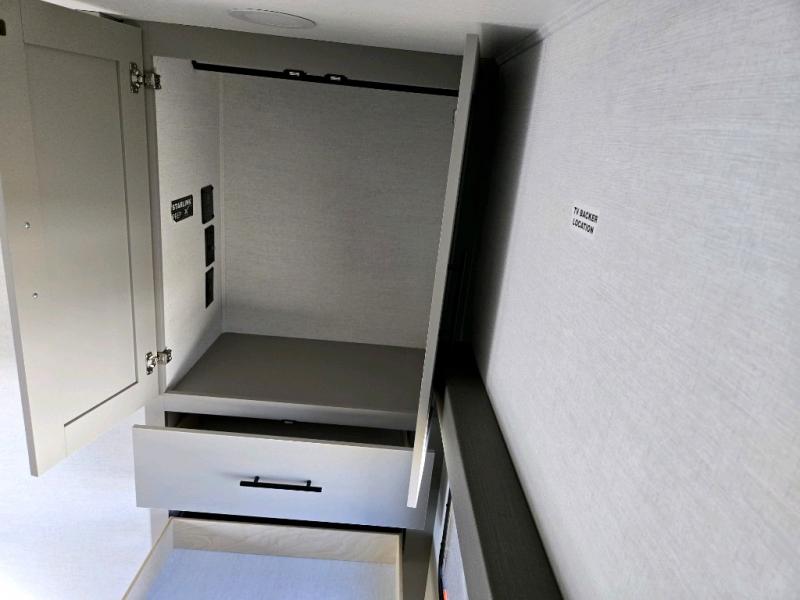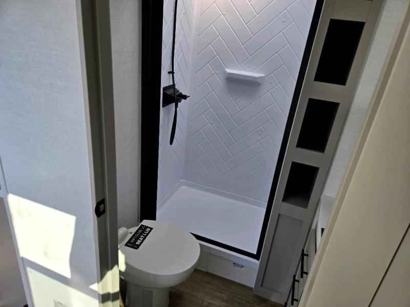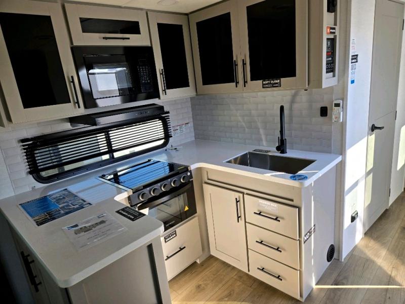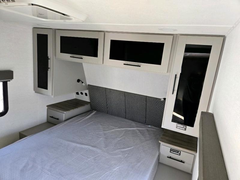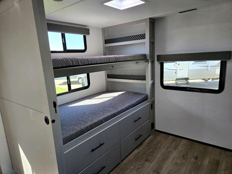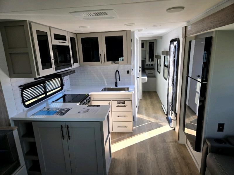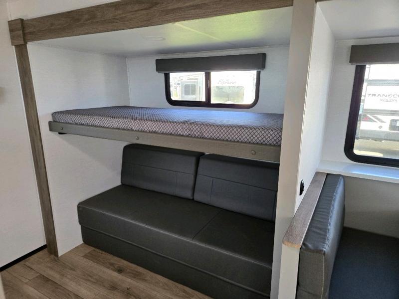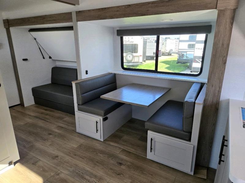 Enjoy glamping in this spacious travel trailer for eight! Your guests or the kids will love the rear bunkhouse with 40" x 72" bunk beds across from a third bunk with a cube sofa below, and the slide out will make this space more open. The slide out also includes the booth dinette in the main living area, which is across from the sofa slide out. The chef will love cooking in this Delta kitchen with generous counter space, a 10 cu. ft. 12V refrigerator, plus pull-out pantry trays for dry goods and snacks. The full bath with a 30" x 36" shower and a soft close porcelain foot flush toilet will allow you to fresh up each day without having to use the camp's facilities. And don't overlook the front private bedroom with a queen bed, wardrobe nightstands, a third wardrobe plus overhead storage; now nothing has to get left behind!