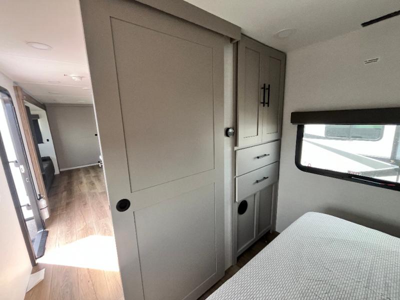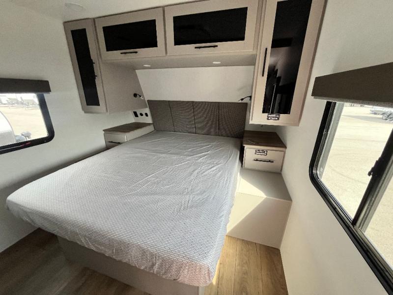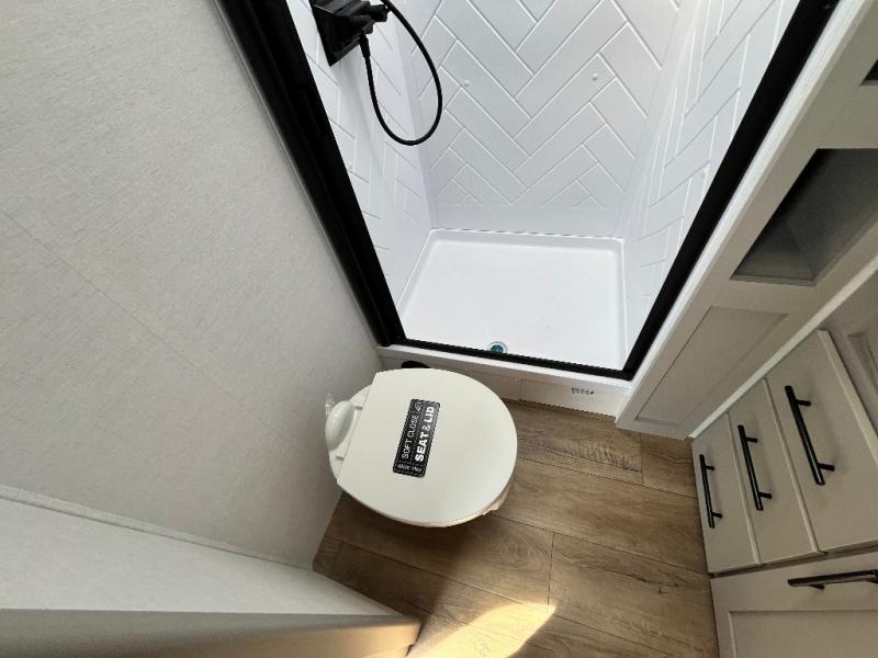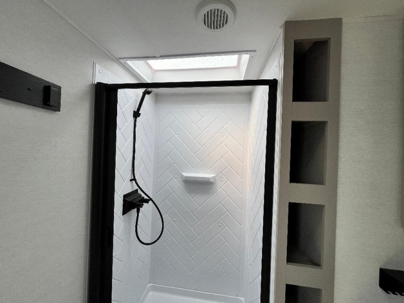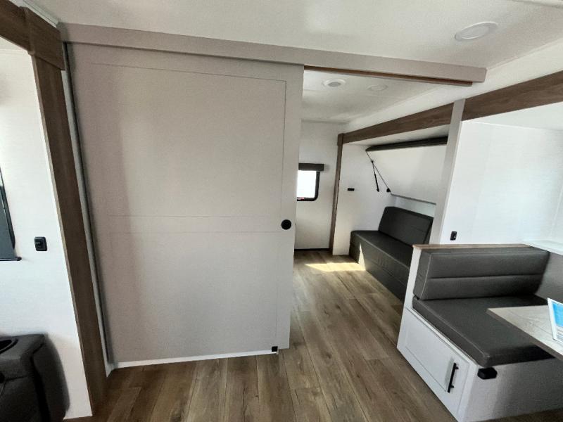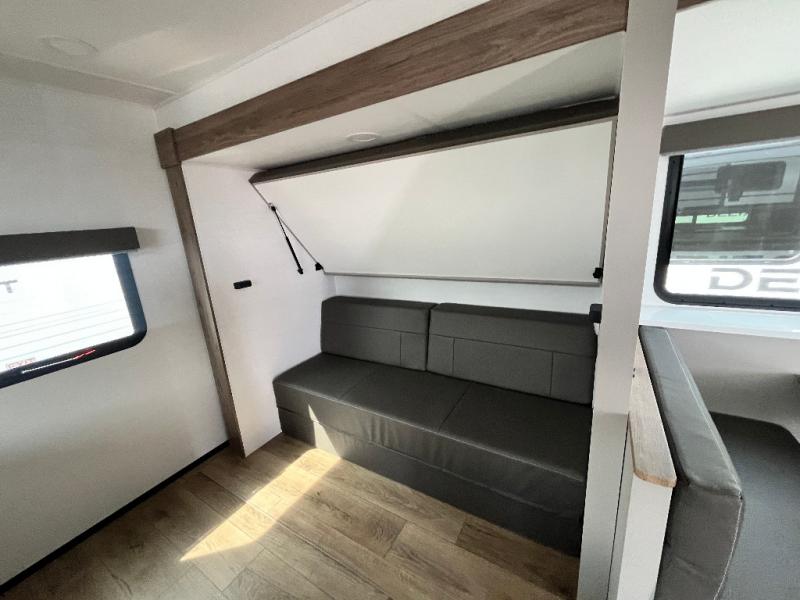 Enjoy glamping in this spacious travel trailer for eight! Your guests or the kids will love the rear bunkhouse with 40" x 72" bunk beds across from a third bunk with a cube sofa below, and the slide out will make this space more open. The slide out also includes the booth dinette in the main living area, which is across from the sofa slide out. The chef will love cooking in this Delta kitchen with generous counter space, a 10 cu. ft. 12V refrigerator, plus pull-out pantry trays for dry goods and snacks. The full bath with a 30" x 36" shower and a soft close porcelain foot flush toilet will allow you to fresh up each day without having to use the camp's facilities. And don't overlook the front private bedroom with a queen bed, wardrobe nightstands, a third wardrobe plus overhead storage; now nothing has to get left behind!