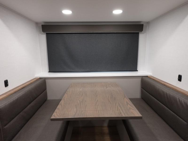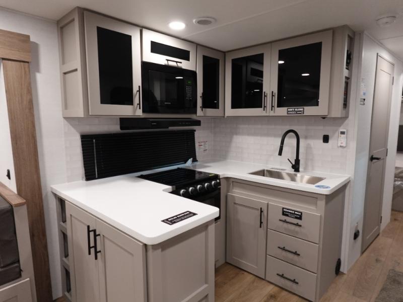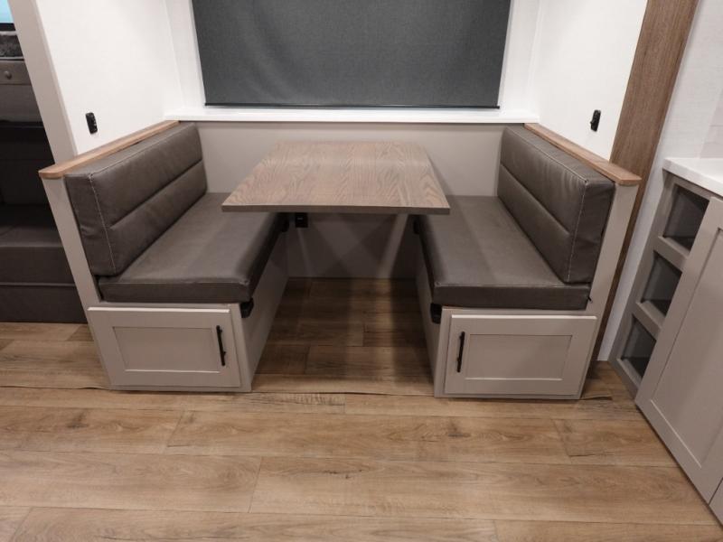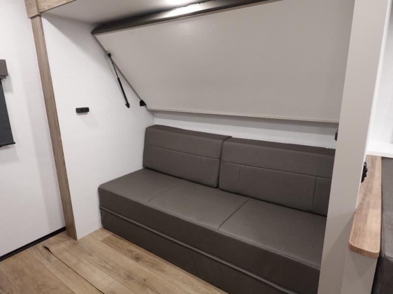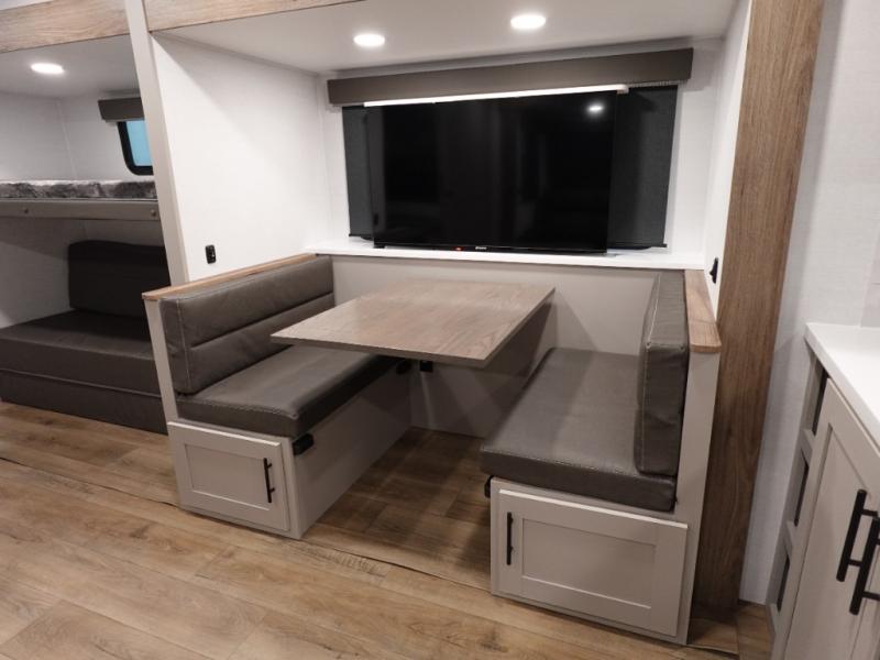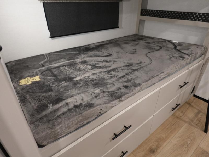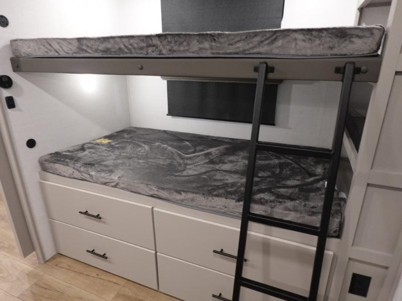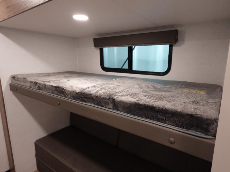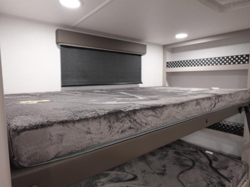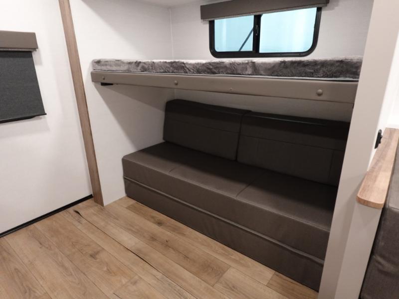 Enjoy glamping in this spacious travel trailer for eight! Your guests or the kids will love the rear bunkhouse with 40" x 72" bunk beds across from a third bunk with a cube sofa below, and the slide out will make this space more open. The slide out also includes the booth dinette in the main living area, which is across from the sofa slide out. The chef will love cooking in this Delta kitchen with generous counter space, a 10 cu. ft. 12V refrigerator, plus pull-out pantry trays for dry goods and snacks. The full bath with a 30" x 36" shower and a soft close porcelain foot flush toilet will allow you to fresh up each day without having to use the camp's facilities. And don't overlook the front private bedroom with a queen bed, wardrobe nightstands, a third wardrobe plus overhead storage; now nothing has to get left behind!