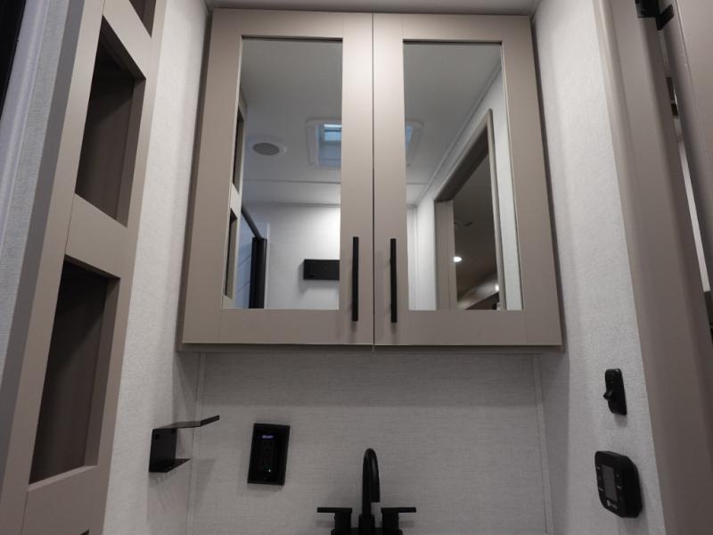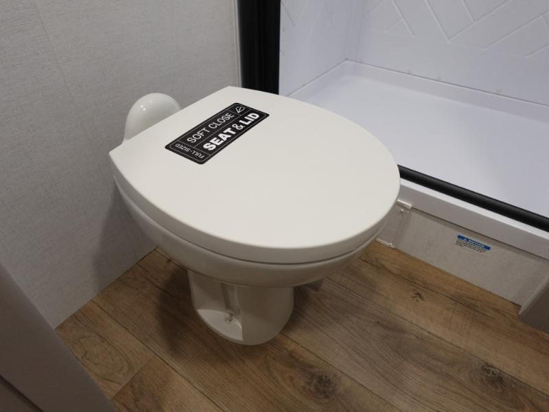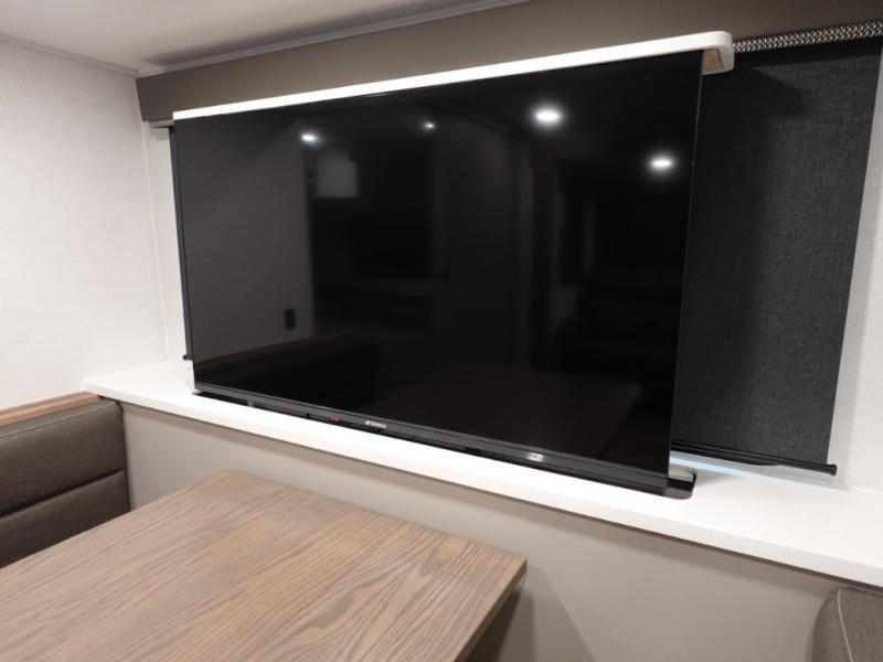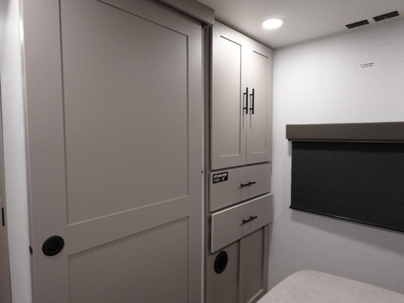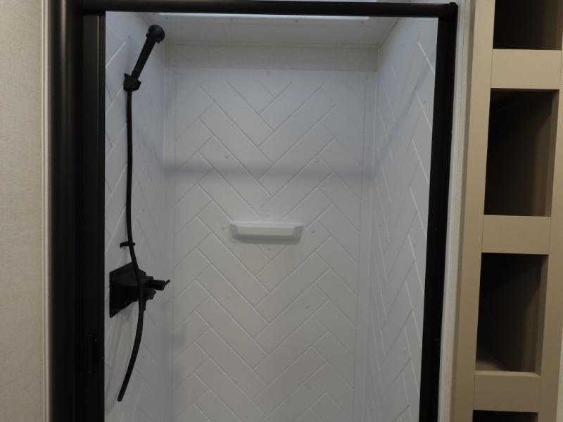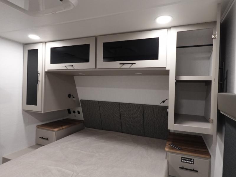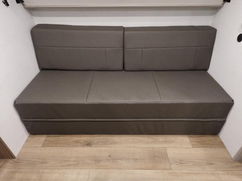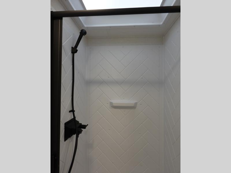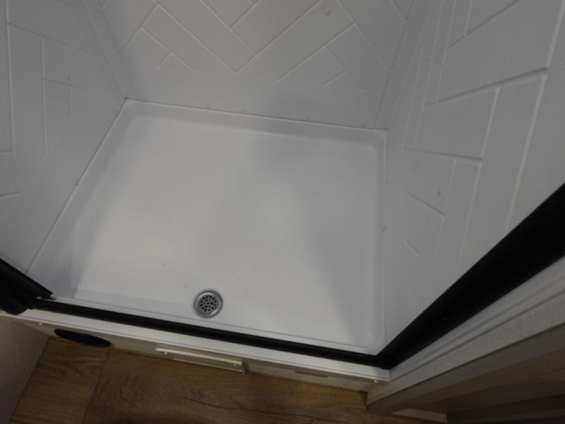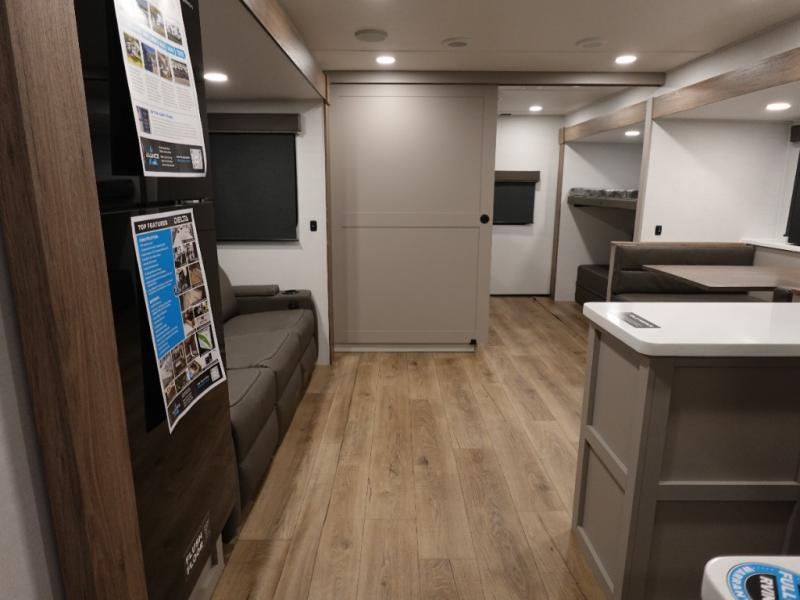 Enjoy glamping in this spacious travel trailer for eight! Your guests or the kids will love the rear bunkhouse with 40" x 72" bunk beds across from a third bunk with a cube sofa below, and the slide out will make this space more open. The slide out also includes the booth dinette in the main living area, which is across from the sofa slide out. The chef will love cooking in this Delta kitchen with generous counter space, a 10 cu. ft. 12V refrigerator, plus pull-out pantry trays for dry goods and snacks. The full bath with a 30" x 36" shower and a soft close porcelain foot flush toilet will allow you to fresh up each day without having to use the camp's facilities. And don't overlook the front private bedroom with a queen bed, wardrobe nightstands, a third wardrobe plus overhead storage; now nothing has to get left behind!