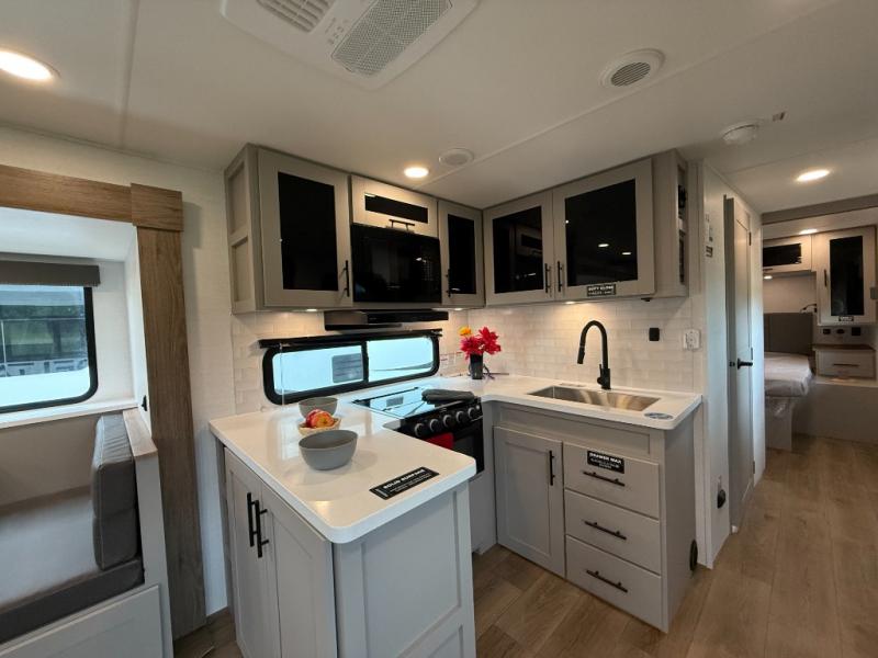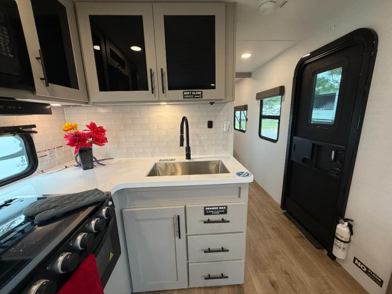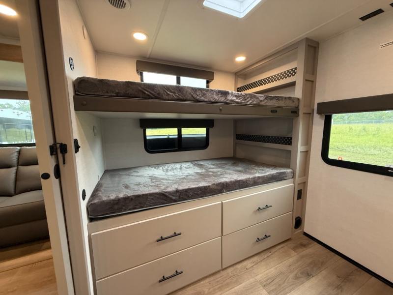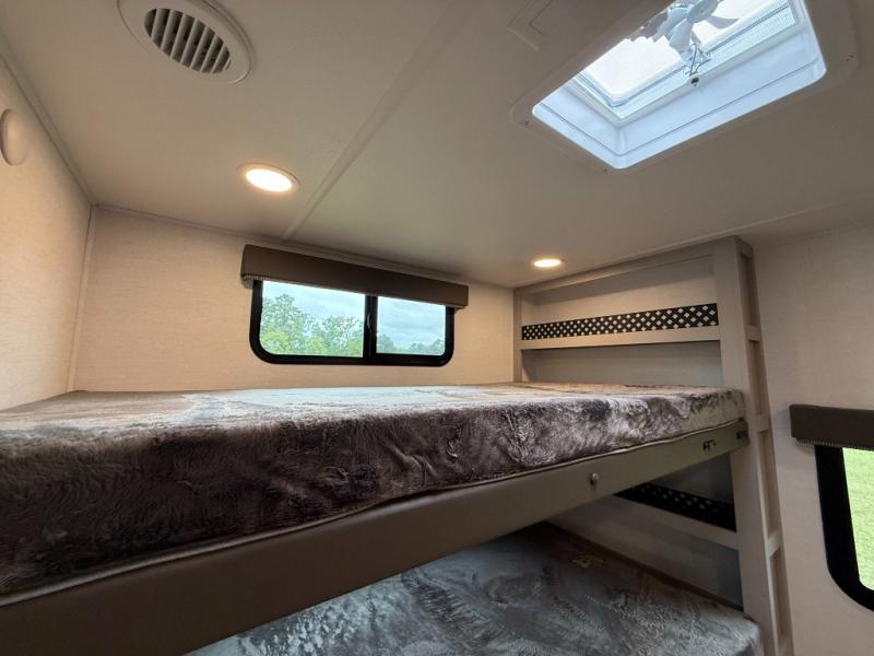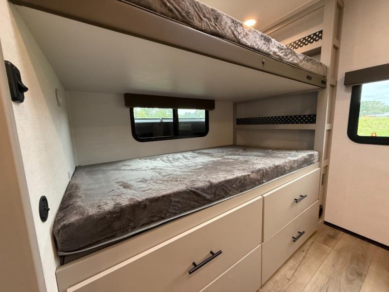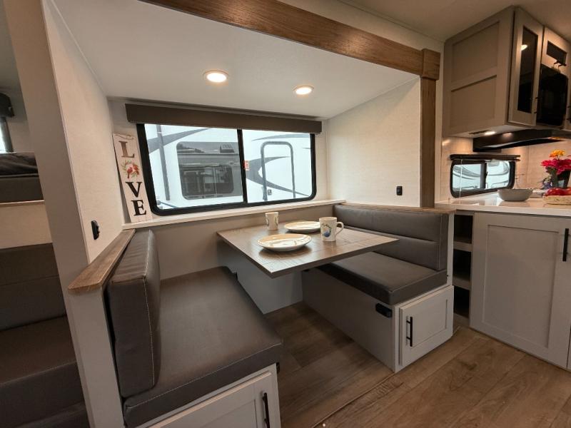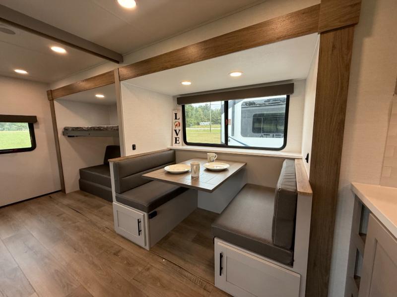 Enjoy glamping in this spacious travel trailer for eight! Your guests or the kids will love the rear bunkhouse with 40" x 72" bunk beds across from a third bunk with a cube sofa below, and the slide out will make this space more open. The slide out also includes the booth dinette in the main living area, which is across from the sofa slide out. The chef will love cooking in this Delta kitchen with generous counter space, a 10 cu. ft. 12V refrigerator, plus pull-out pantry trays for dry goods and snacks. The full bath with a 30" x 36" shower and a soft close porcelain foot flush toilet will allow you to fresh up each day without having to use the camp's facilities. And don't overlook the front private bedroom with a queen bed, wardrobe nightstands, a third wardrobe plus overhead storage; now nothing has to get left behind!