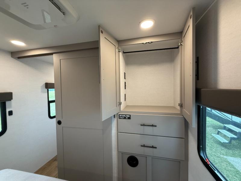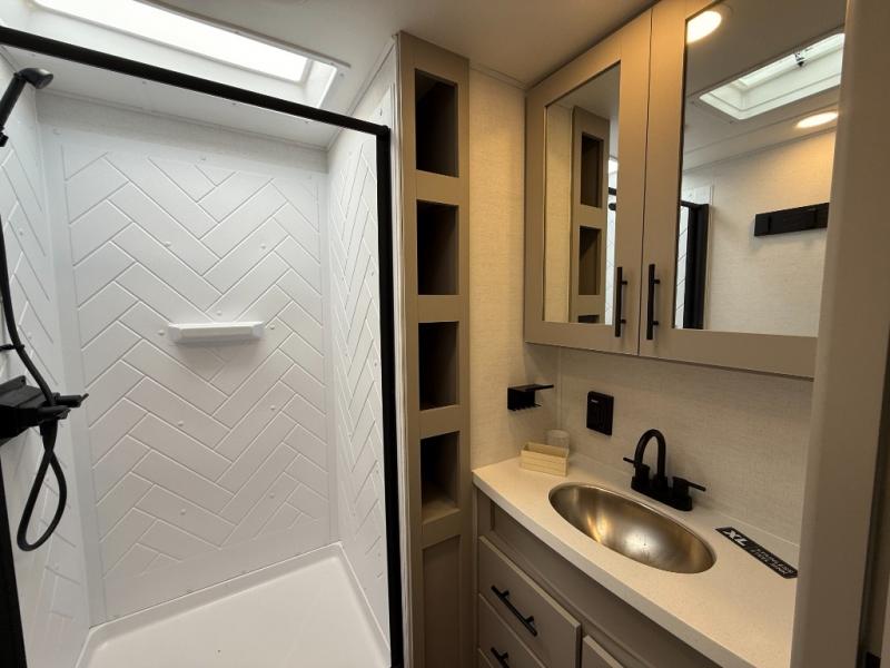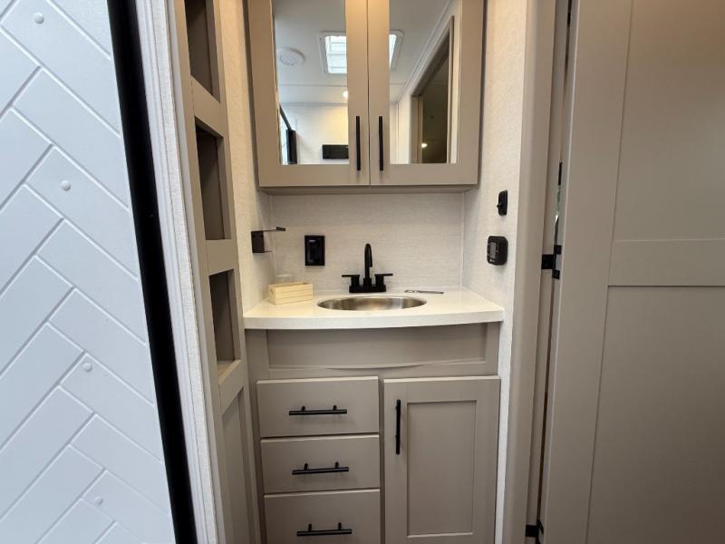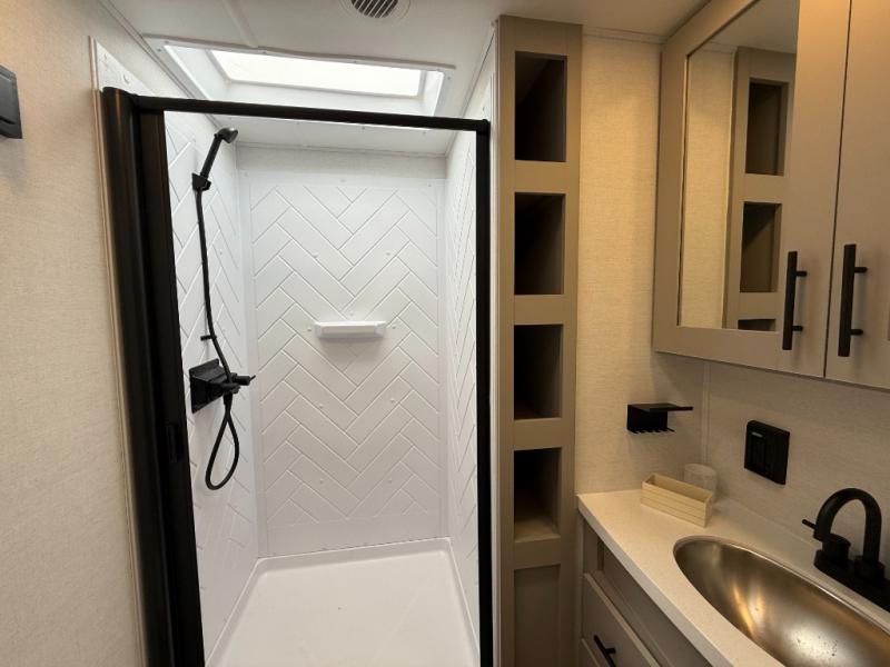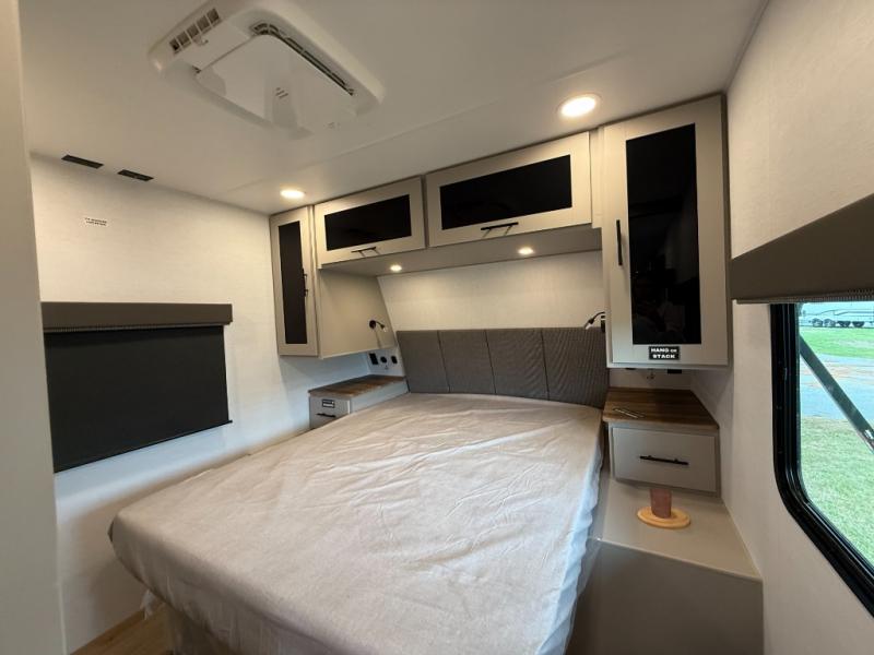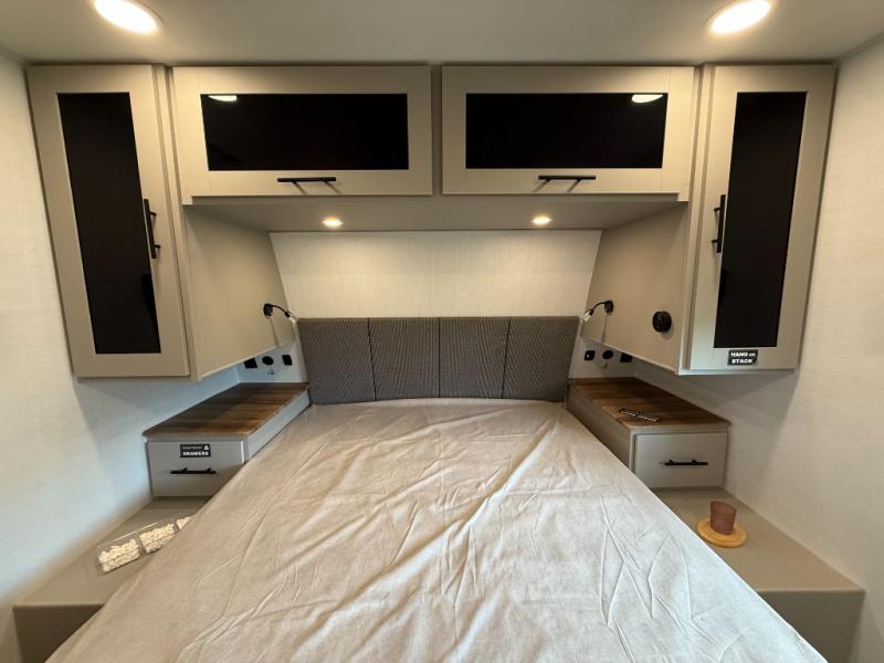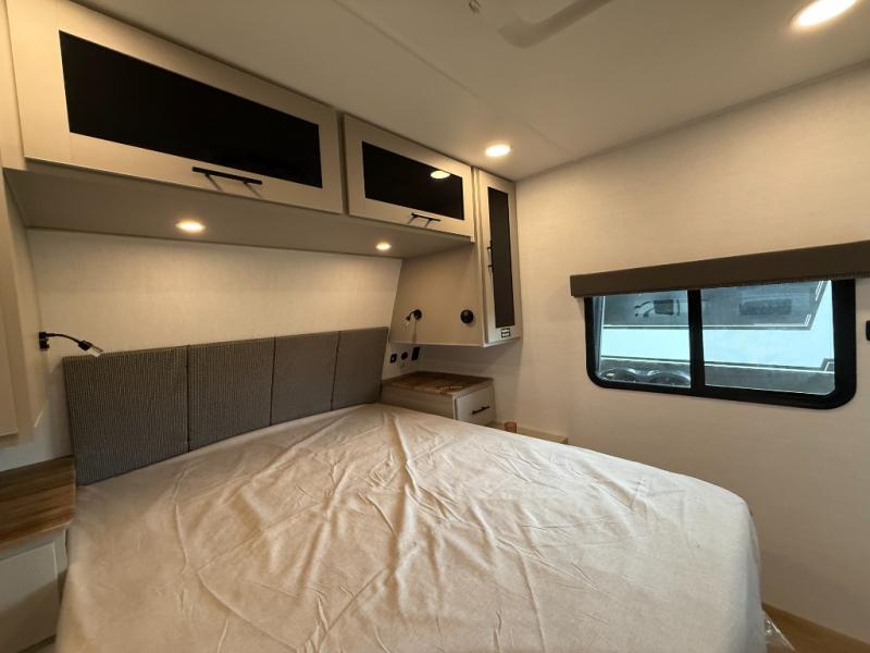 Enjoy glamping in this spacious travel trailer for eight! Your guests or the kids will love the rear bunkhouse with 40" x 72" bunk beds across from a third bunk with a cube sofa below, and the slide out will make this space more open. The slide out also includes the booth dinette in the main living area, which is across from the sofa slide out. The chef will love cooking in this Delta kitchen with generous counter space, a 10 cu. ft. 12V refrigerator, plus pull-out pantry trays for dry goods and snacks. The full bath with a 30" x 36" shower and a soft close porcelain foot flush toilet will allow you to fresh up each day without having to use the camp's facilities. And don't overlook the front private bedroom with a queen bed, wardrobe nightstands, a third wardrobe plus overhead storage; now nothing has to get left behind!