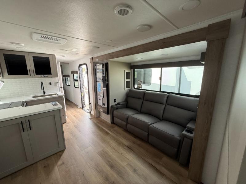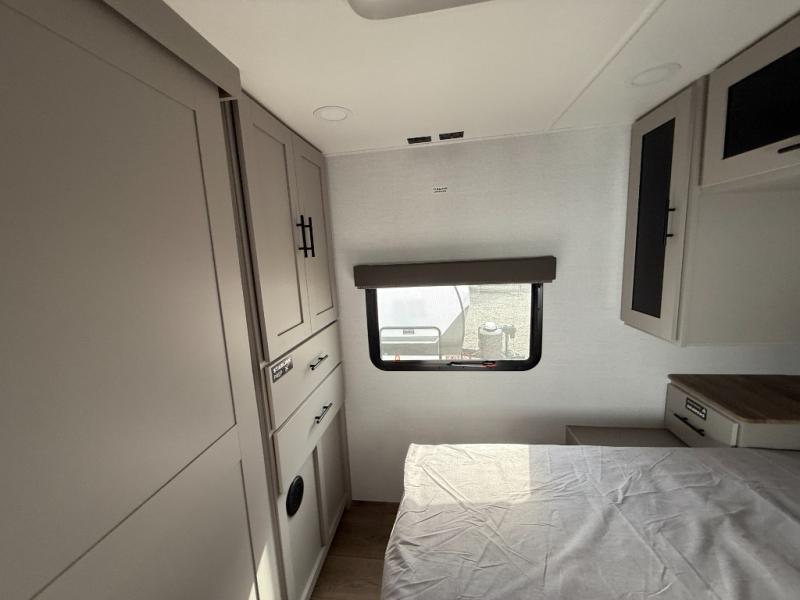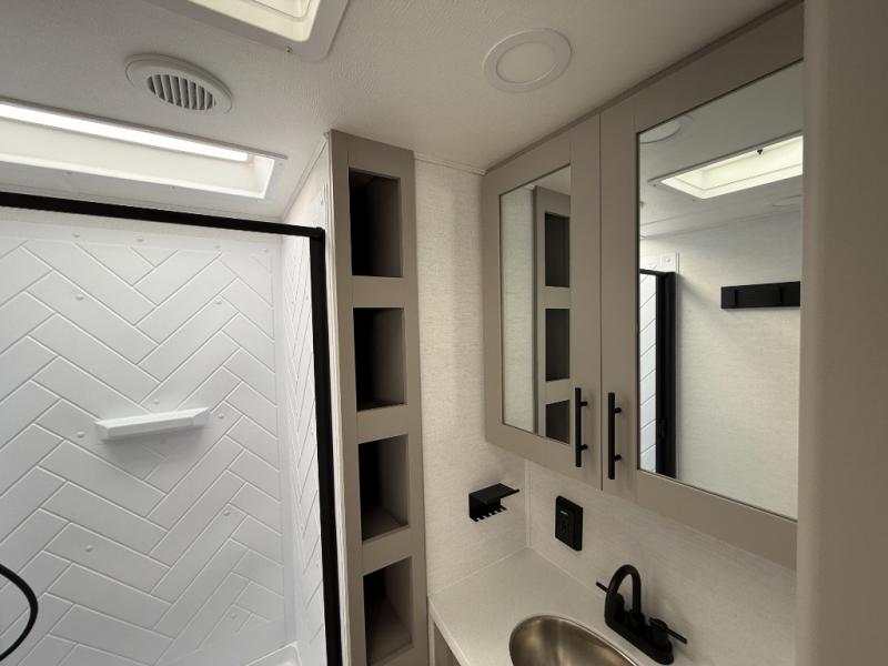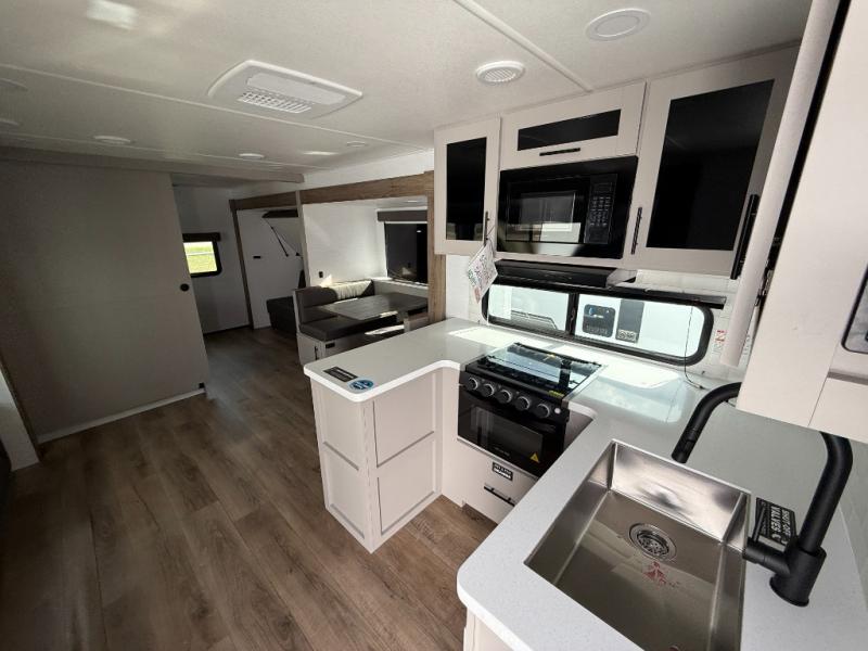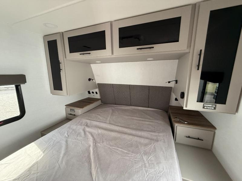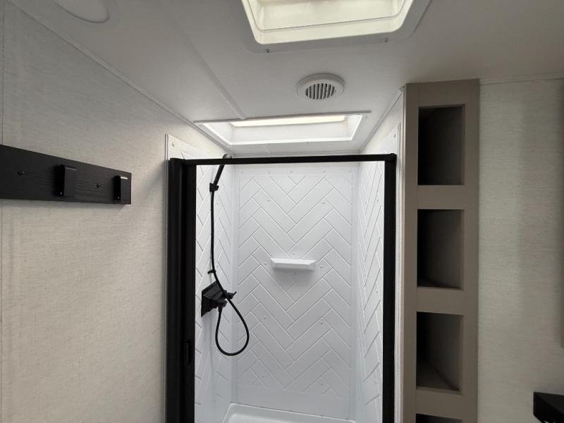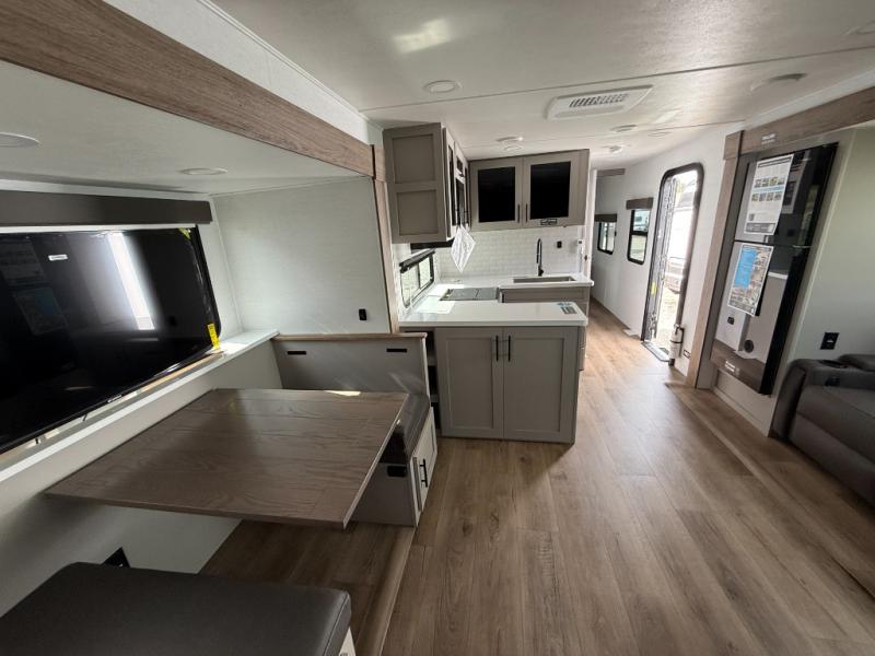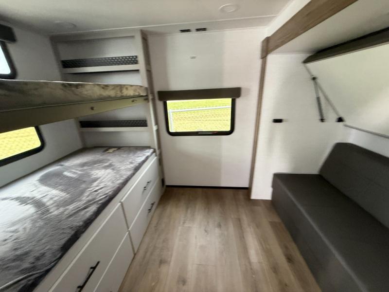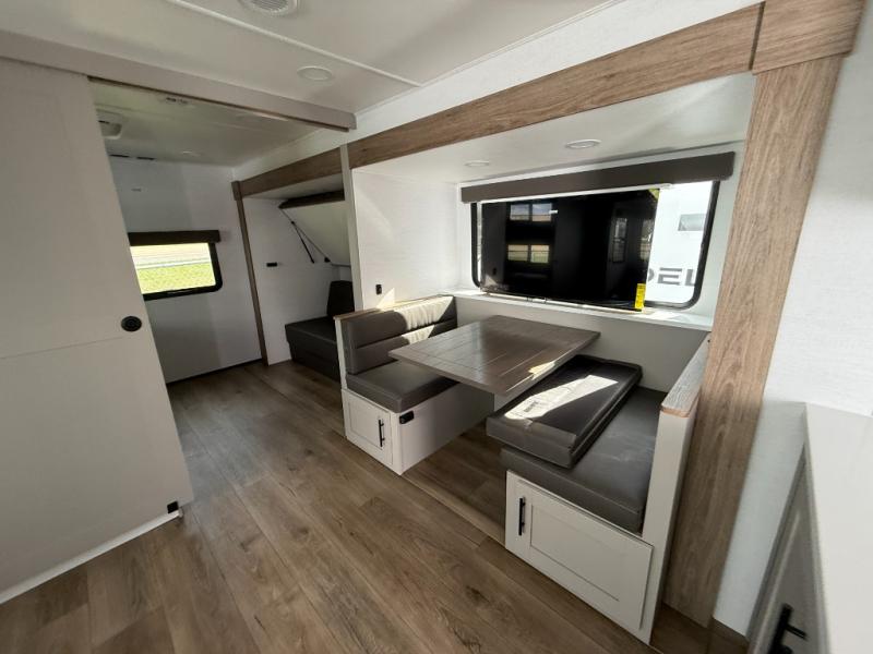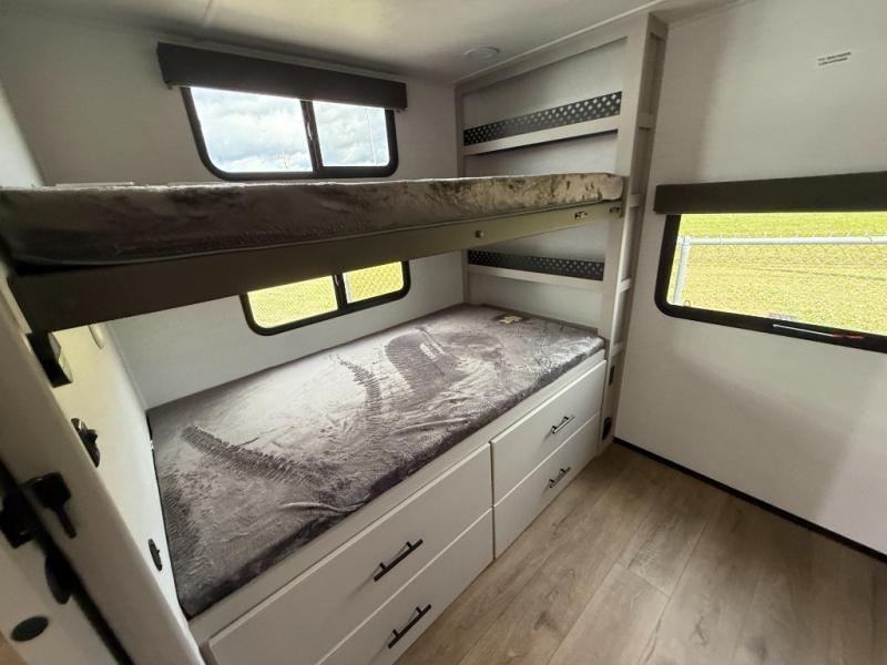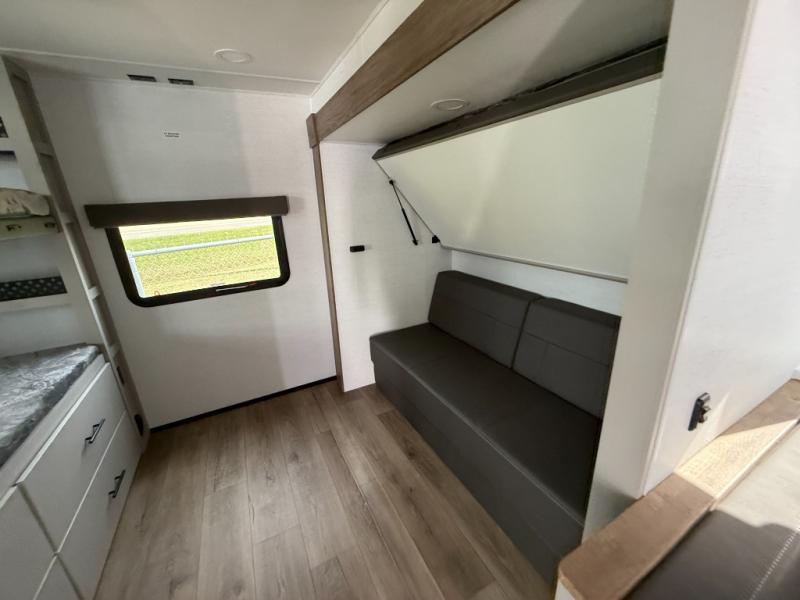 Enjoy glamping in this spacious travel trailer for eight! Your guests or the kids will love the rear bunkhouse with 40" x 72" bunk beds across from a third bunk with a cube sofa below, and the slide out will make this space more open. The slide out also includes the booth dinette in the main living area, which is across from the sofa slide out. The chef will love cooking in this Delta kitchen with generous counter space, a 10 cu. ft. 12V refrigerator, plus pull-out pantry trays for dry goods and snacks. The full bath with a 30" x 36" shower and a soft close porcelain foot flush toilet will allow you to fresh up each day without having to use the camp's facilities. And don't overlook the front private bedroom with a queen bed, wardrobe nightstands, a third wardrobe plus overhead storage; now nothing has to get left behind!