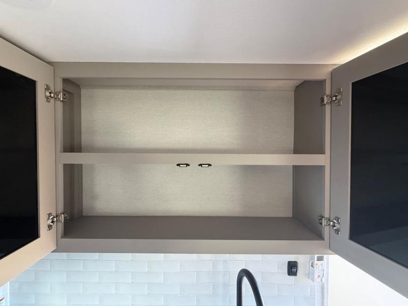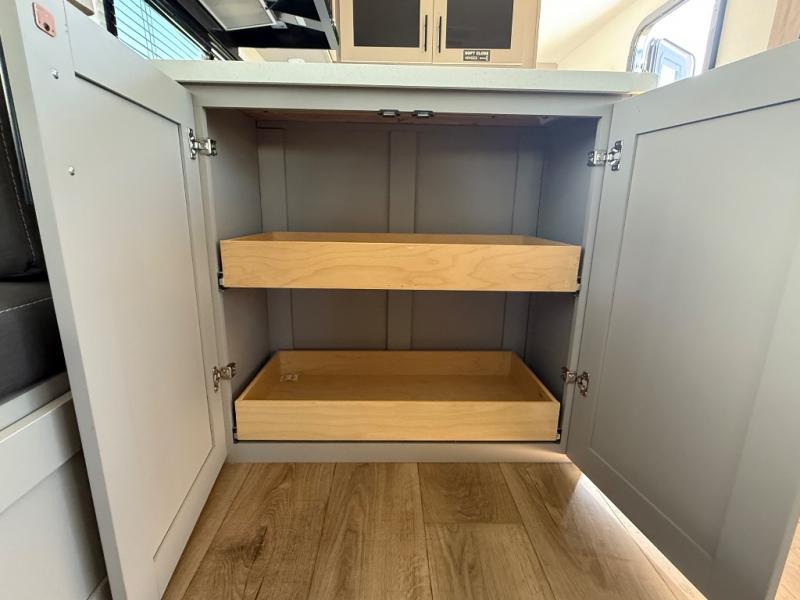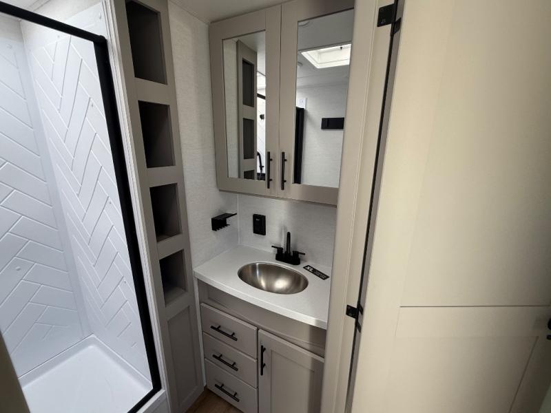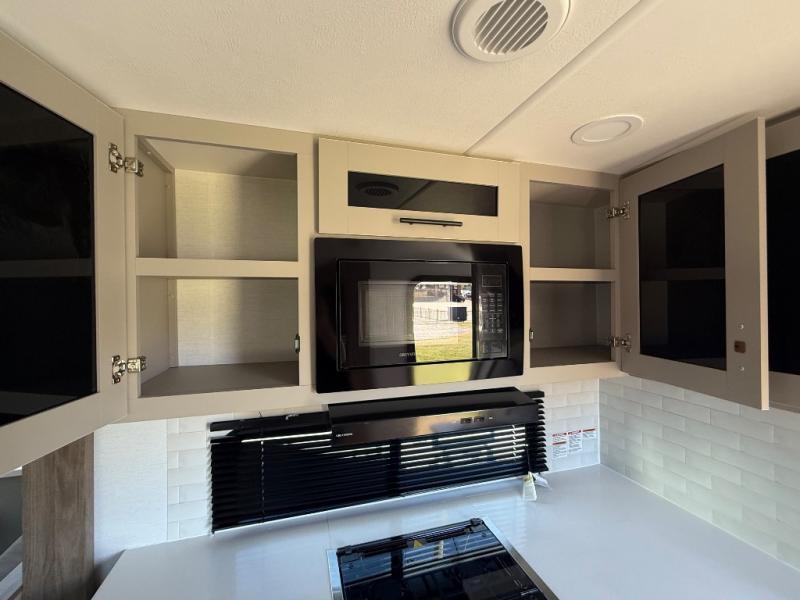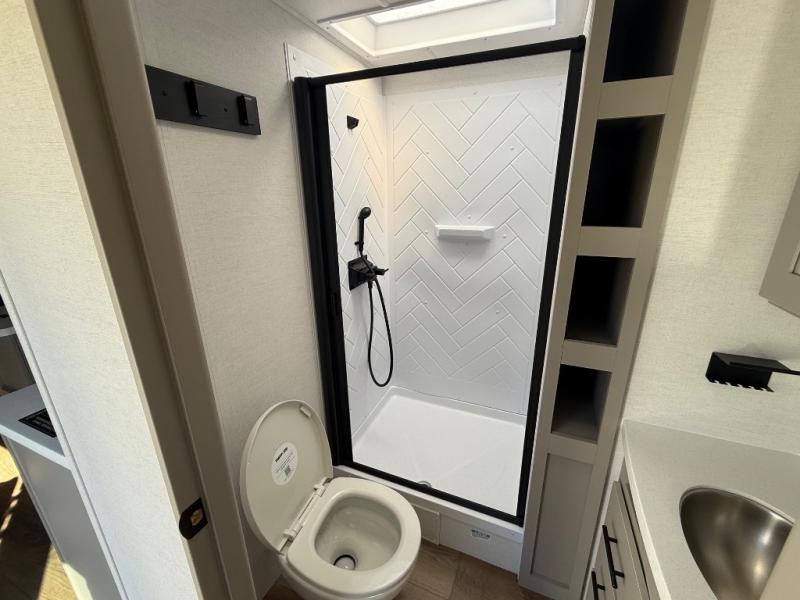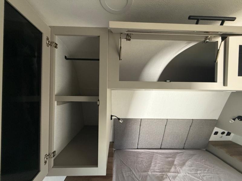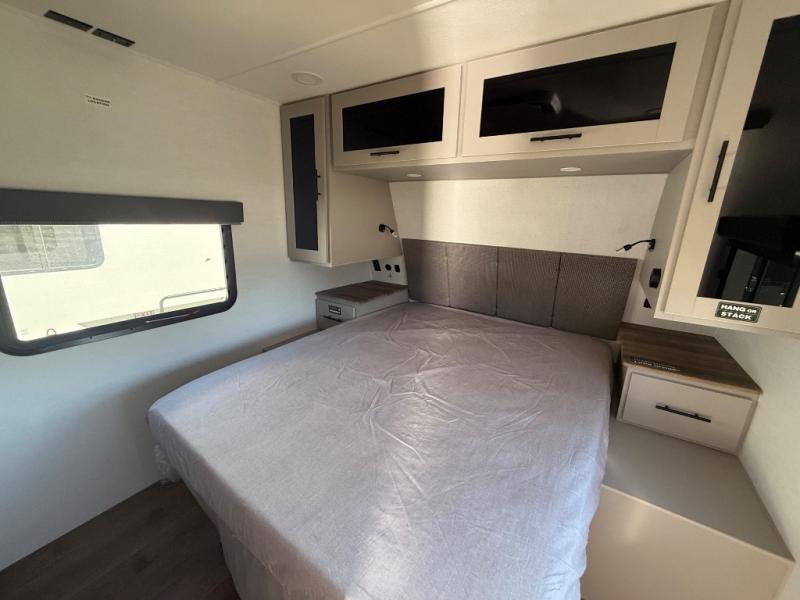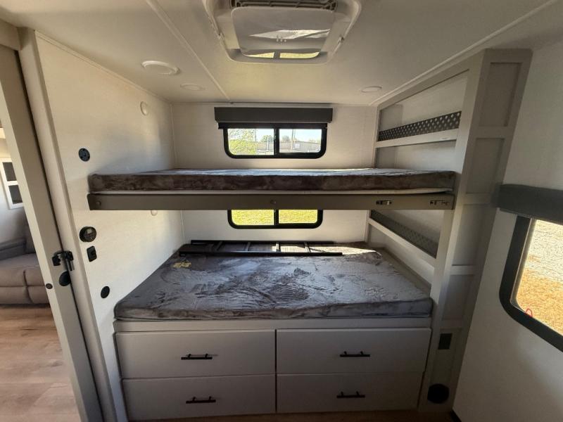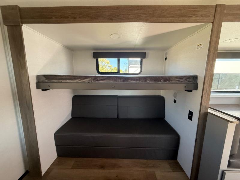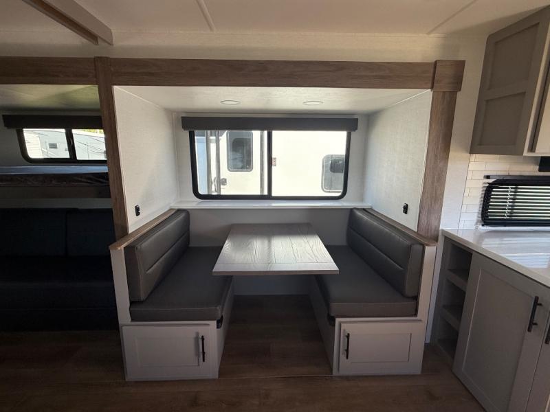 Enjoy glamping in this spacious travel trailer for eight! Your guests or the kids will love the rear bunkhouse with 40" x 72" bunk beds across from a third bunk with a cube sofa below, and the slide out will make this space more open. The slide out also includes the booth dinette in the main living area, which is across from the sofa slide out. The chef will love cooking in this Delta kitchen with generous counter space, a 10 cu. ft. 12V refrigerator, plus pull-out pantry trays for dry goods and snacks. The full bath with a 30" x 36" shower and a soft close porcelain foot flush toilet will allow you to fresh up each day without having to use the camp's facilities. And don't overlook the front private bedroom with a queen bed, wardrobe nightstands, a third wardrobe plus overhead storage; now nothing has to get left behind!