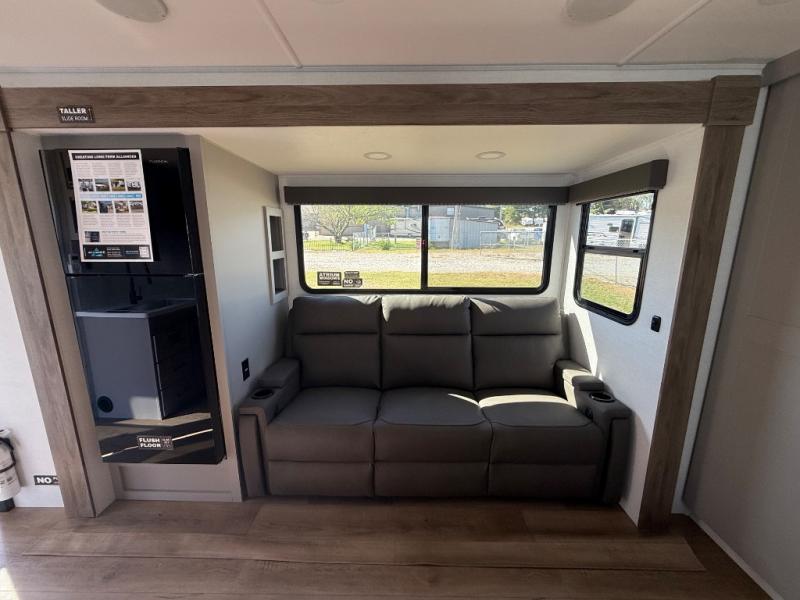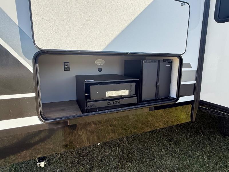 Form and function work together with every one of these Alliance RV Delta travel trailers! They are built with a walk-on roof with a seamless PVC roof covering, Mylar reinforced exterior seals, and a heated and enclosed underbelly to protect your unit. The commercial grade vinyl flooring will be easy to clean, and the oversized atrium windows throughout let in plenty of natural sunlight. With 62 cu. ft. of drop frame pass-through storage, you can bring along all of your essential camping gear plus it has USB charging for more convenience. There are many at home interior conveniences including a Bluetooth speaker, USB charging throughout, and even a pull-out kitchen trash can. Come find your favorite model today!