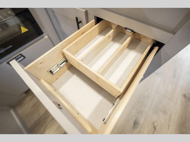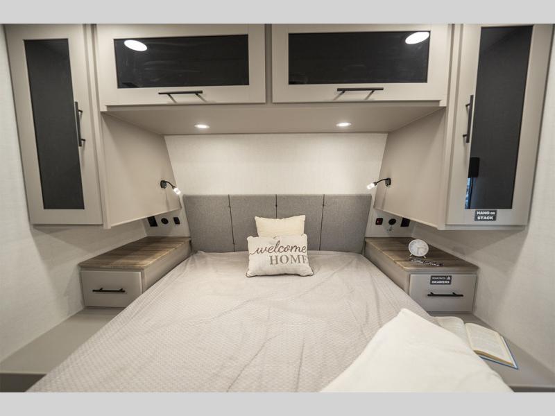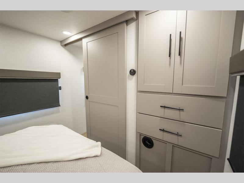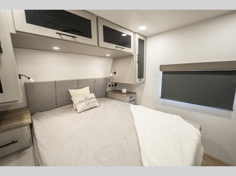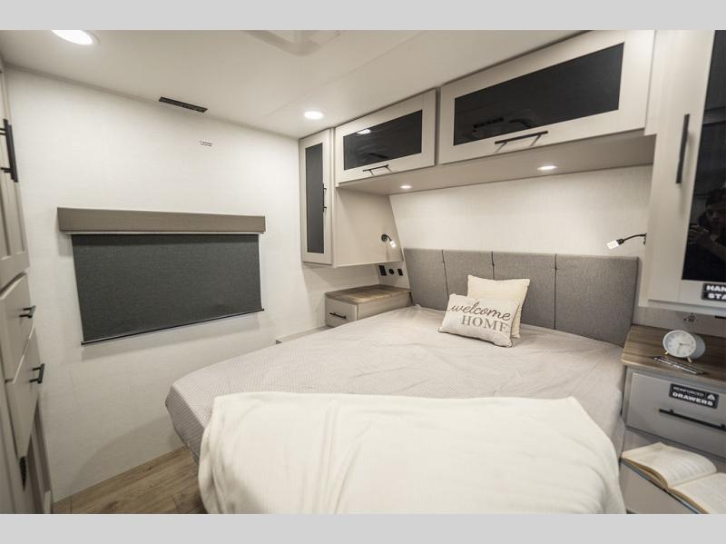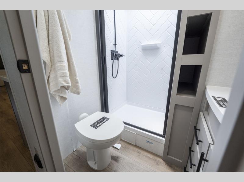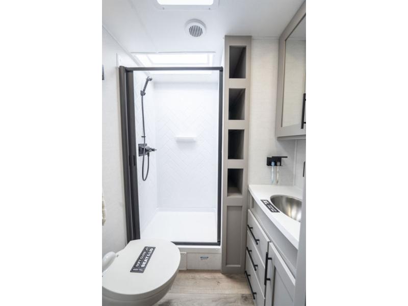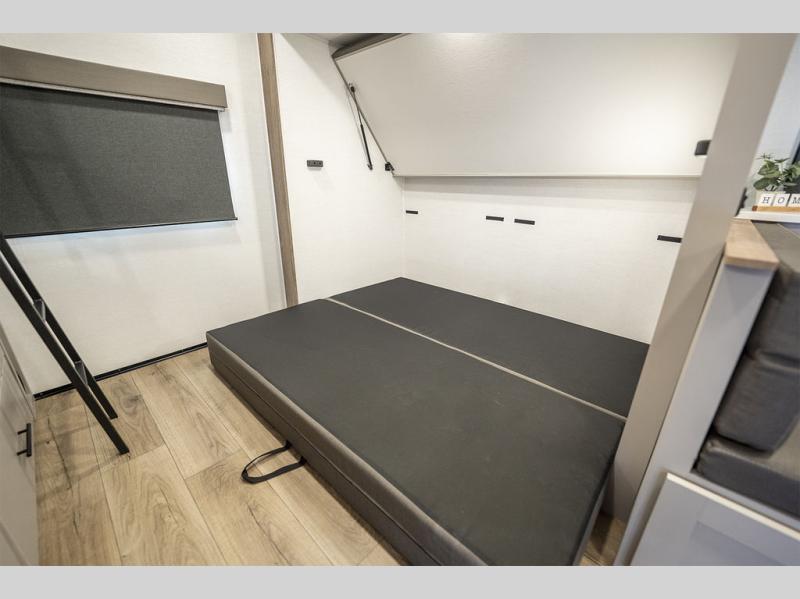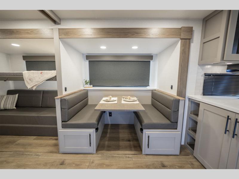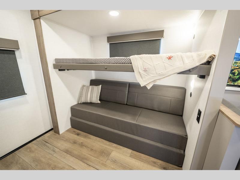 Enjoy glamping in this spacious travel trailer for eight! Your guests or the kids will love the rear bunkhouse with 40" x 72" bunk beds across from a third bunk with a cube sofa below, and the slide out will make this space more open. The slide out also includes the booth dinette in the main living area, which is across from the sofa slide out. The chef will love cooking in this Delta kitchen with generous counter space, a 10 cu. ft. 12V refrigerator, plus pull-out pantry trays for dry goods and snacks. The full bath with a 30" x 36" shower and a soft close porcelain foot flush toilet will allow you to fresh up each day without having to use the camp's facilities. And don't overlook the front private bedroom with a queen bed, wardrobe nightstands, a third wardrobe plus overhead storage; now nothing has to get left behind!