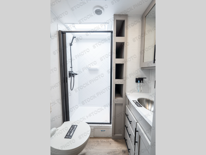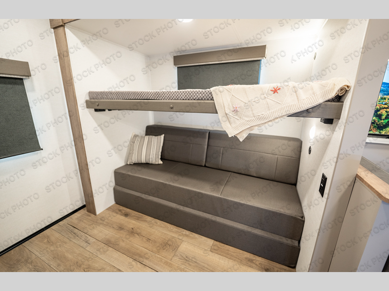 Enjoy glamping in this spacious travel trailer for eight! Your guests or the kids will love the rear bunkhouse with 40" x 72" bunk beds across from a third bunk with a cube sofa below, and the slide out will make this space more open. The slide out also includes the booth dinette in the main living area, which is across from the sofa slide out. The chef will love cooking in this Delta kitchen with generous counter space, a 10 cu. ft. 12V refrigerator, plus pull-out pantry trays for dry goods and snacks. The full bath with a 30" x 36" shower and a soft close porcelain foot flush toilet will allow you to fresh up each day without having to use the camp's facilities. And don't overlook the front private bedroom with a queen bed, wardrobe nightstands, a third wardrobe plus overhead storage; now nothing has to get left behind!