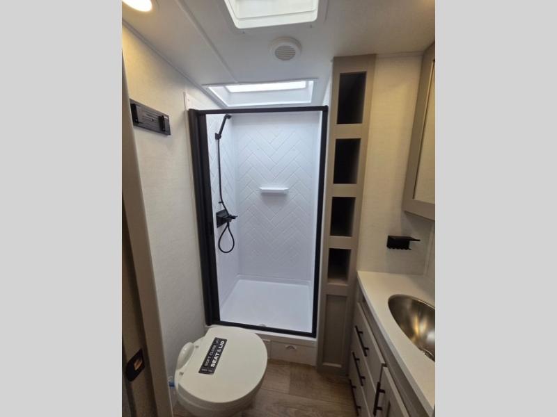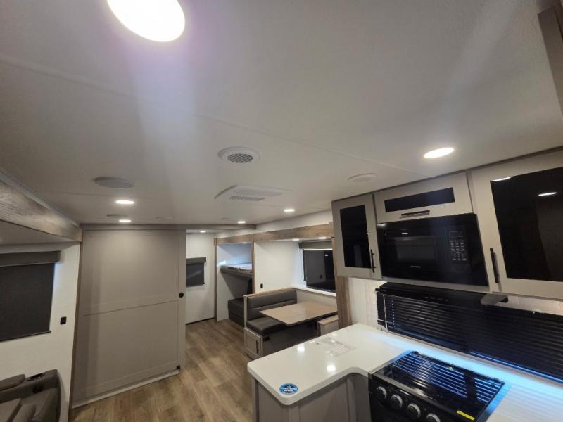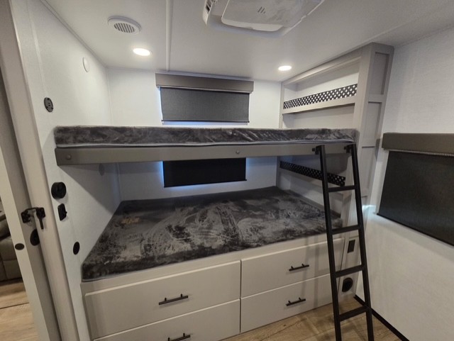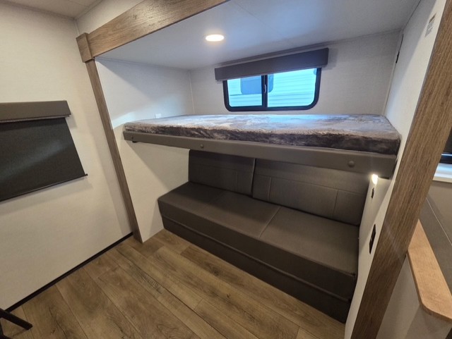 Enjoy glamping in this spacious travel trailer for eight! Your guests or the kids will love the rear bunkhouse with 40" x 72" bunk beds across from a third bunk with a cube sofa below, and the slide out will make this space more open. The slide out also includes the booth dinette in the main living area, which is across from the sofa slide out. The chef will love cooking in this Delta kitchen with generous counter space, a 10 cu. ft. 12V refrigerator, plus pull-out pantry trays for dry goods and snacks. The full bath with a 30" x 36" shower and a soft close porcelain foot flush toilet will allow you to fresh up each day without having to use the camp's facilities. And don't overlook the front private bedroom with a queen bed, wardrobe nightstands, a third wardrobe plus overhead storage; now nothing has to get left behind!