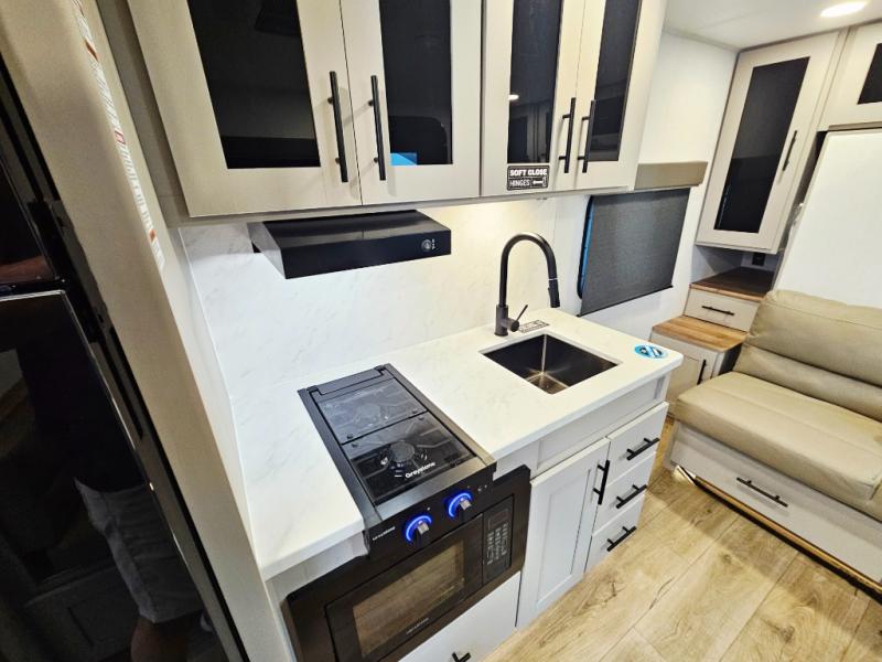 The kitchenette includes solid surface countertops, a two-burner cooktop, convection microwave, and 12V refrigerator, while large windows flood the space with natural light. The spacious rear bathroom offers a full shower, vanity, and plenty of storage—rare in a trailer this size.