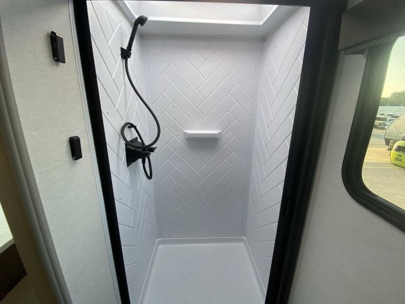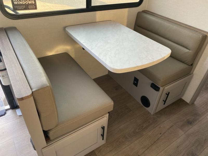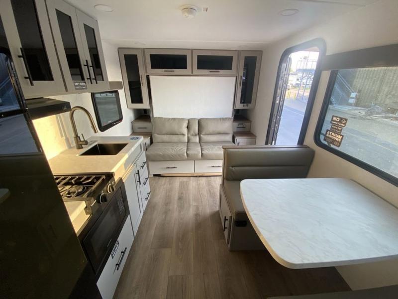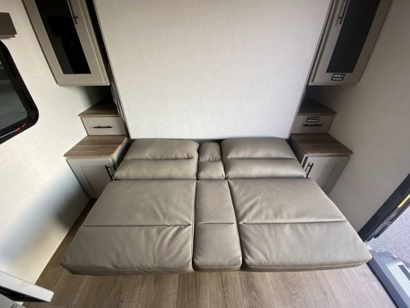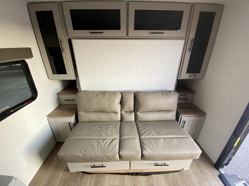 This compact, yet feature-packed travel trailer offers smart design and comfort throughout. Step inside through the 28" entry to find a front queen bed that easily converts into a 60" jackknife sofa, flanked by wardrobe nightstands for your clothes and essentials. The central kitchen is equipped with a 10-cu. ft. refrigerator, two-burner cooktop, sink, and overhead storage, while a booth dinette across from it offers dining space and a clear view of the 32-inch TV. At the rear, enjoy the convenience of a full bathroom with a spacious 30" x 36" shower, a sink with linen shelves, and additional overhead compartments for organized storage.