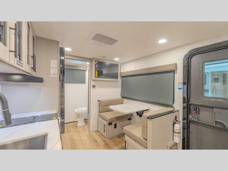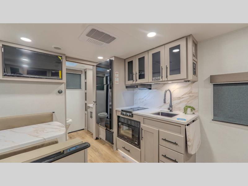 This compact, yet feature-packed travel trailer offers smart design and comfort throughout. Step inside through the 28" entry to find a front queen bed that easily converts into a 60" jackknife sofa, flanked by wardrobe nightstands for your clothes and essentials. The central kitchen is equipped with a 10-cu. ft. refrigerator, two-burner cooktop, sink, and overhead storage, while a booth dinette across from it offers dining space and a clear view of the 32-inch TV. At the rear, enjoy the convenience of a full bathroom with a spacious 30" x 36" shower, a sink with linen shelves, and additional overhead compartments for organized storage.