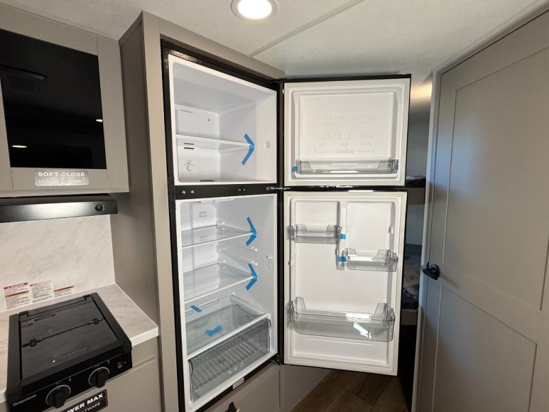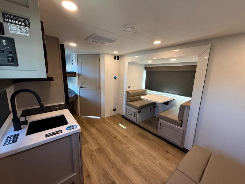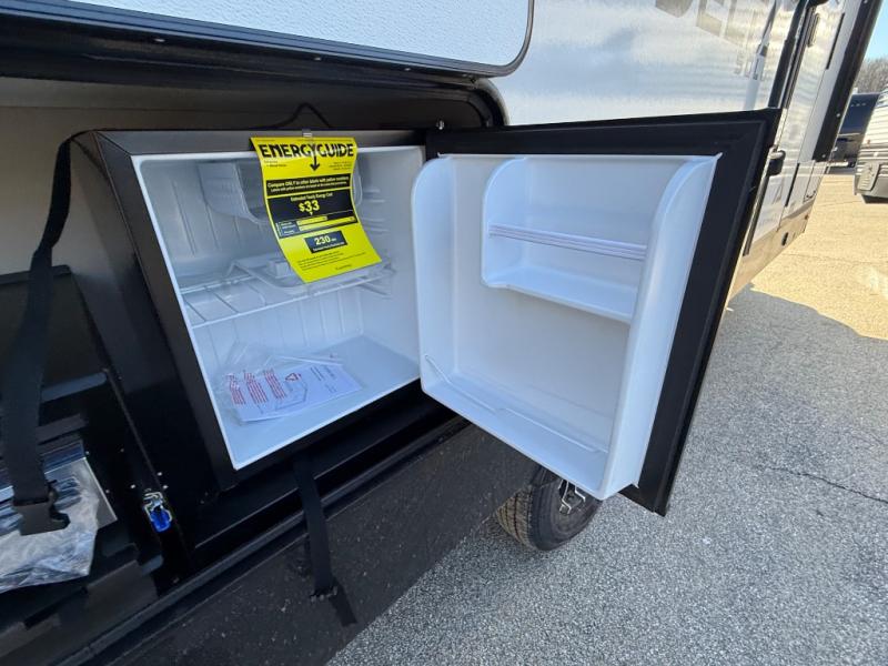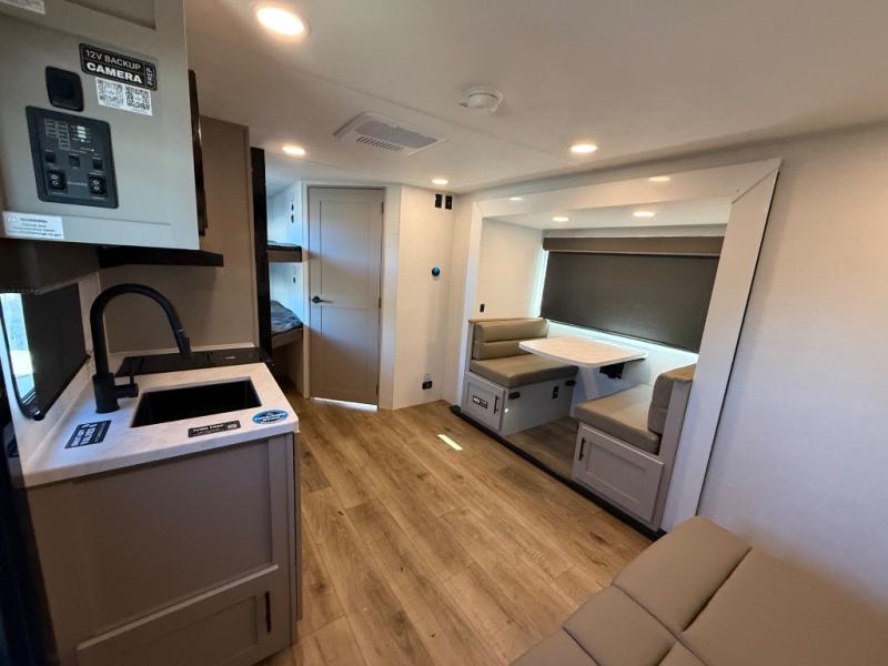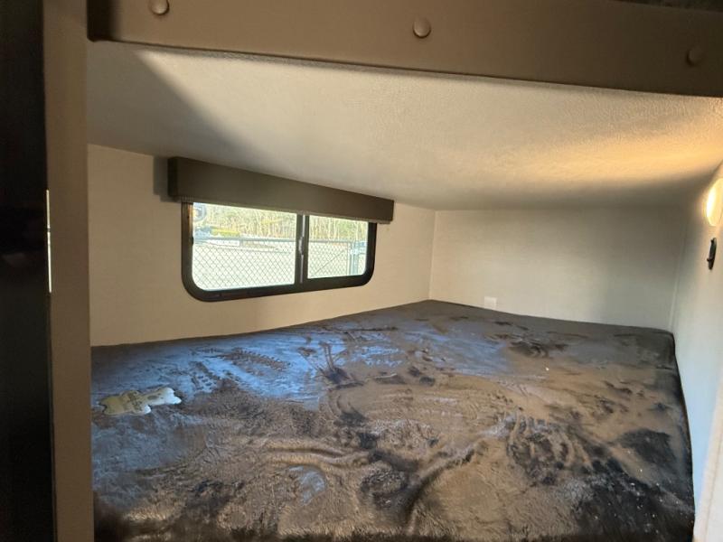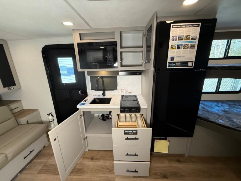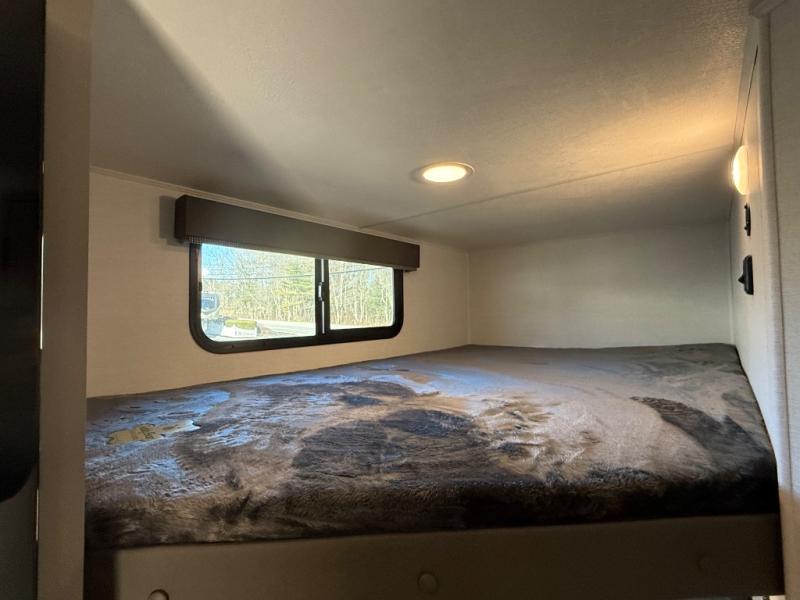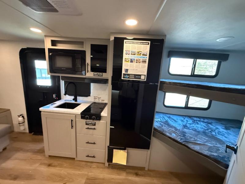 Step inside through the solid step entry and you'll be greeted by a cozy queen bed, perfect for a restful night’s sleep. In between wardrobe nightstands and topped with overhead storage, there’s plenty of room for your clothes and essentials. For added versatility, the bed converts into a 60" jack knife sofa, providing extra seating when needed. The slide out features a dinette that offers additional space, a comfy sleeping area, and a spot to enjoy meals. Across from the dinette, the kitchen is fully equipped with a 10-cu. ft. refrigerator, two-burner cooktop, sink, and microwave, everything you need to prepare your favorite dishes. At the rear corner, you’ll find even more sleeping space with dual 46" x 74" bunks, right next to a full bathroom complete with a 30" x 36" shower for added comfort and convenience.